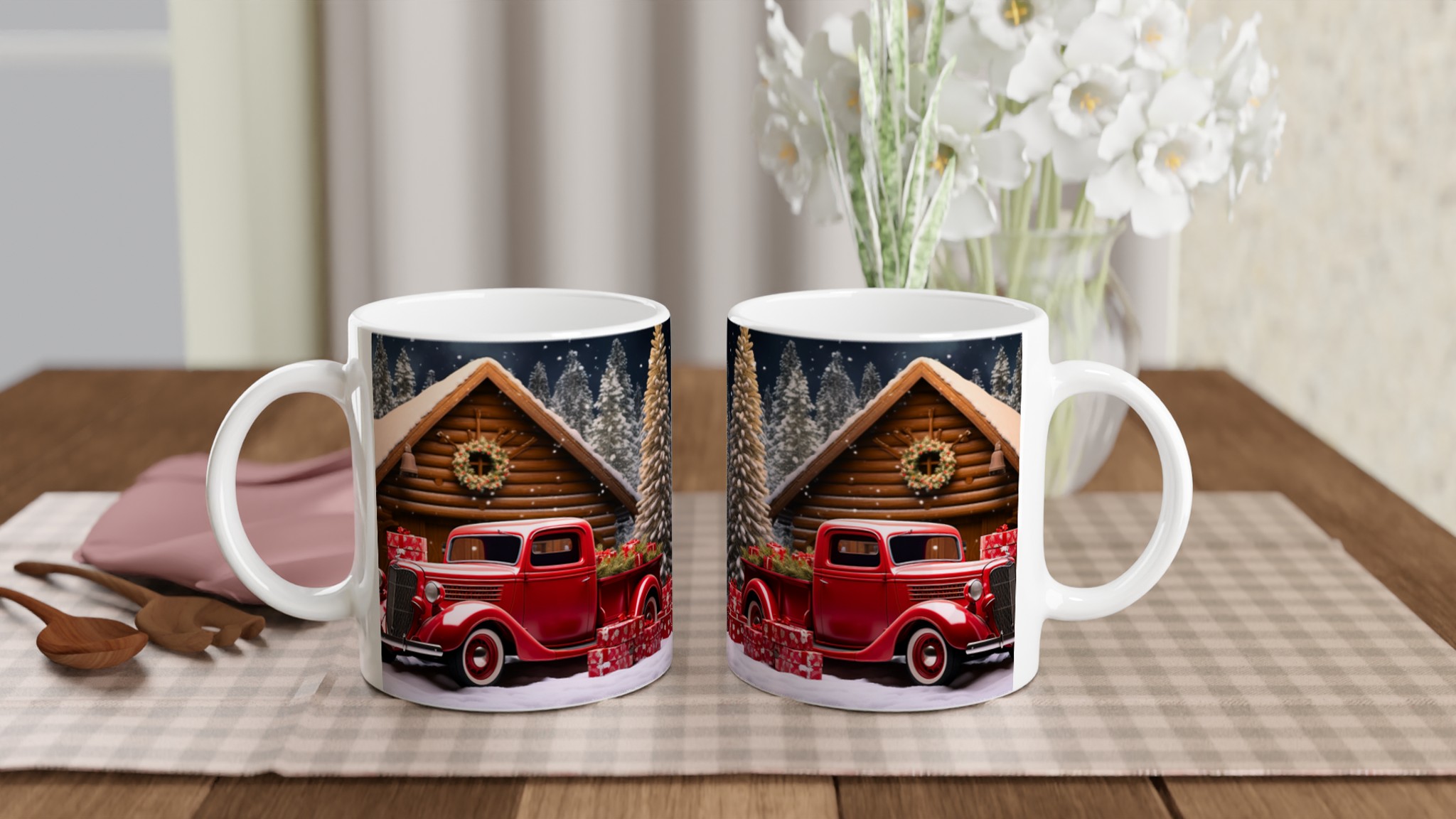 Fånga den mysiga julkänslan året runt med denna charmiga keramiska mugg, som för tankarna till en vintervit stuga och en klassisk röd pick-up fylld med julklappar under snötäckta granar. Den här stilrena muggen blir snabbt en vardagsfavorit. Perfekt för morgonkaffet, kvällens varma choklad eller när du bara vill njuta av en kopp te. Den blanka vita ytan gör att trycken framhävs med klara och levande färger, som håller sig fina även efter många turer i mikron och diskmaskinen.