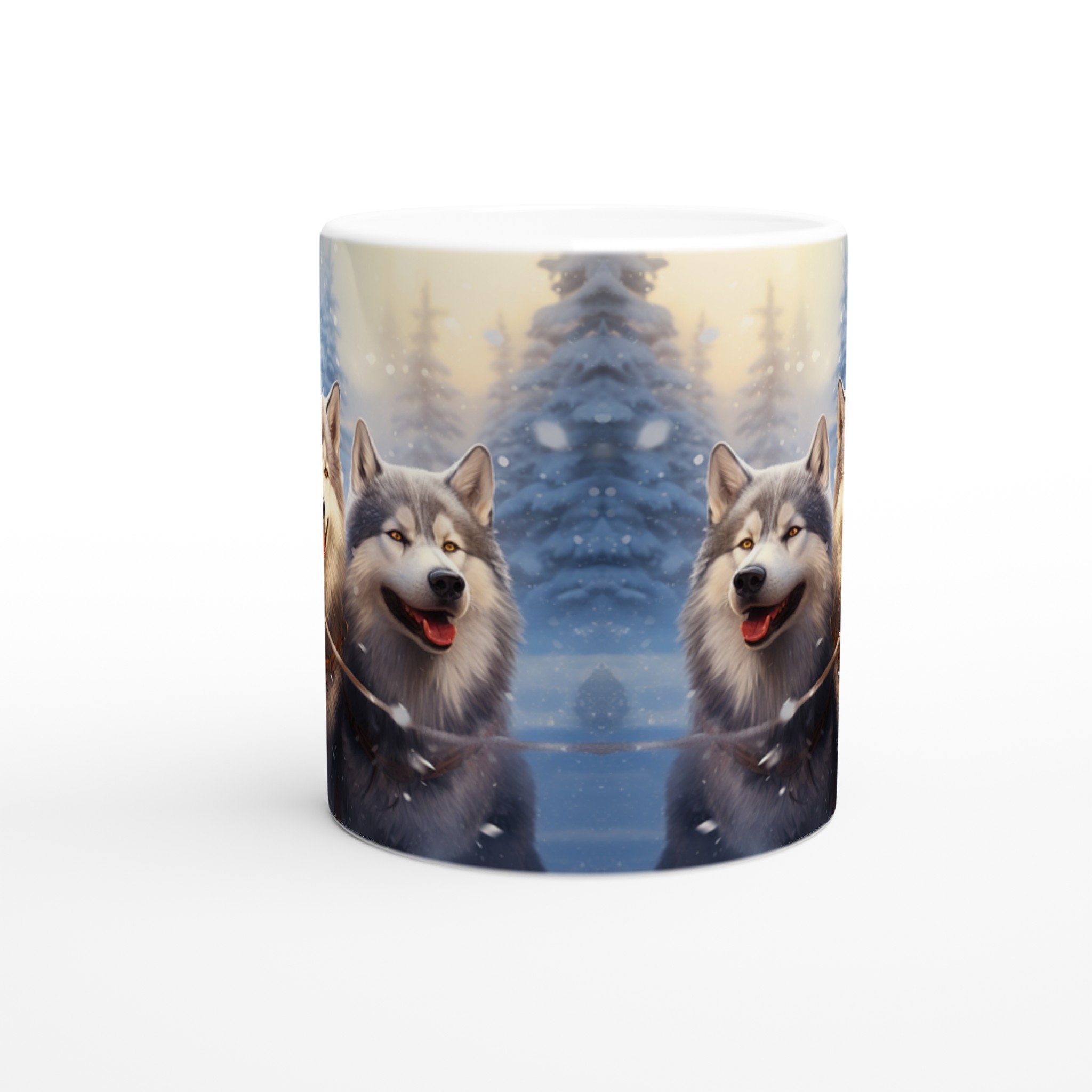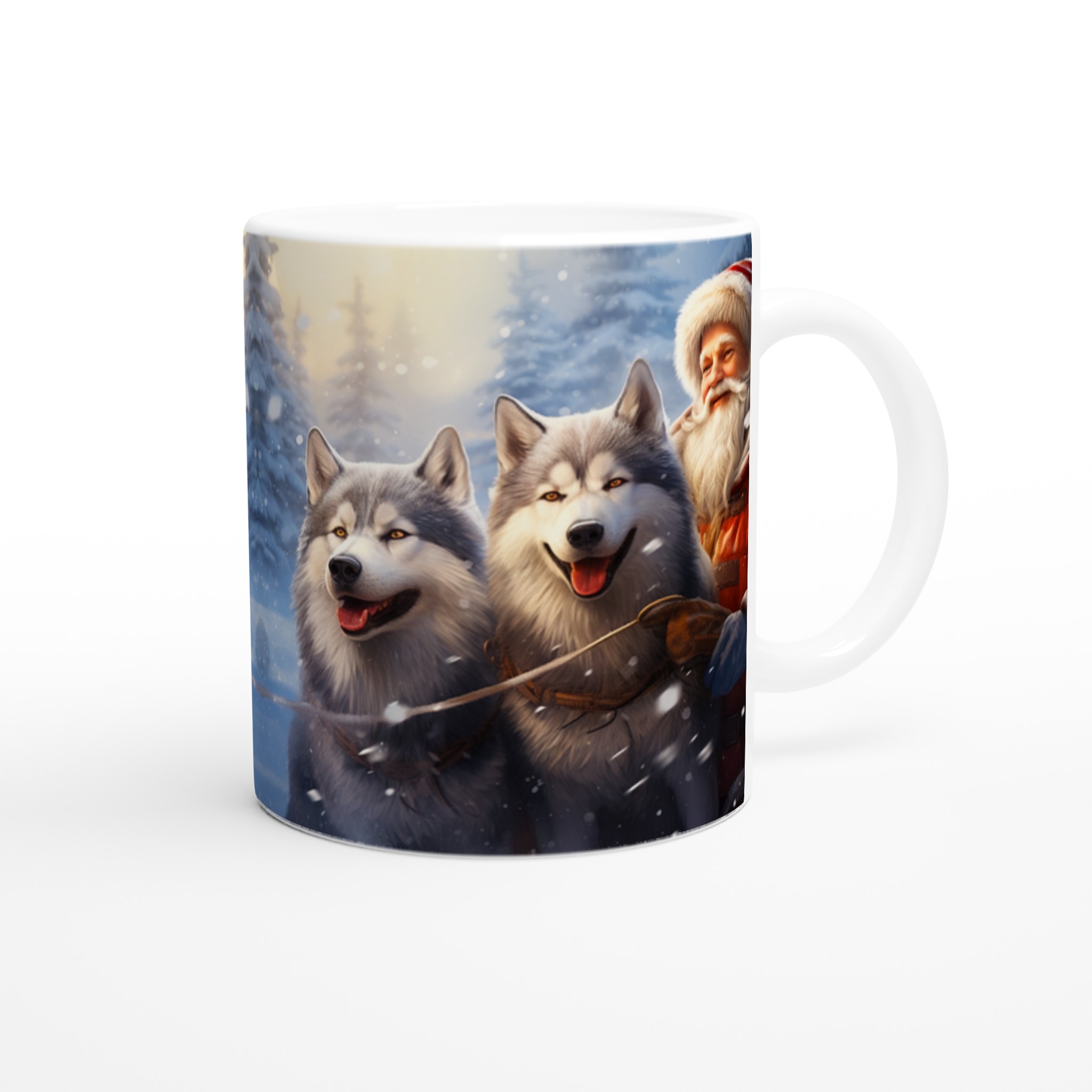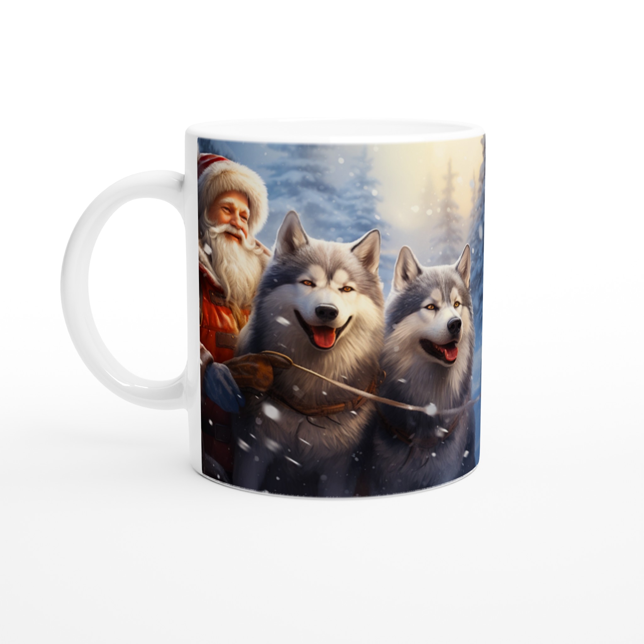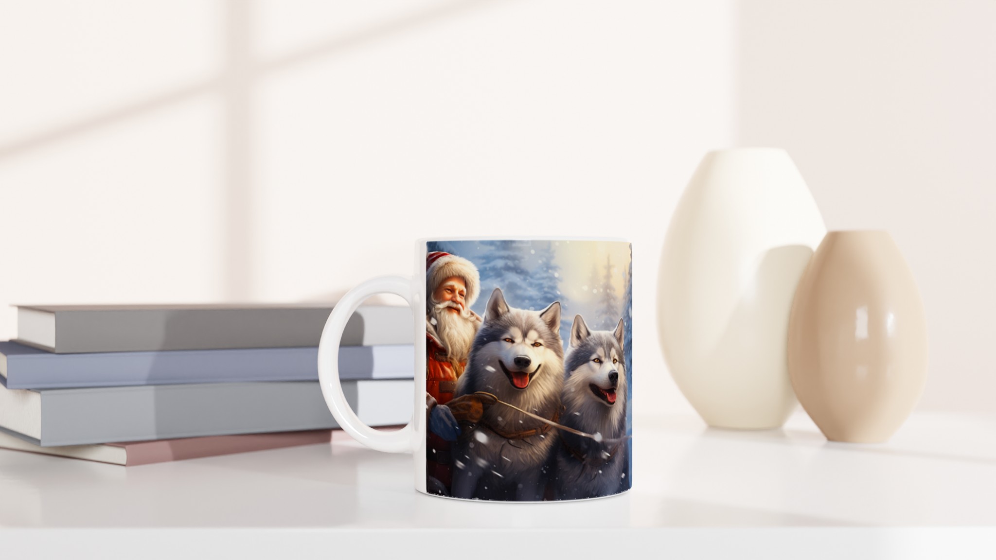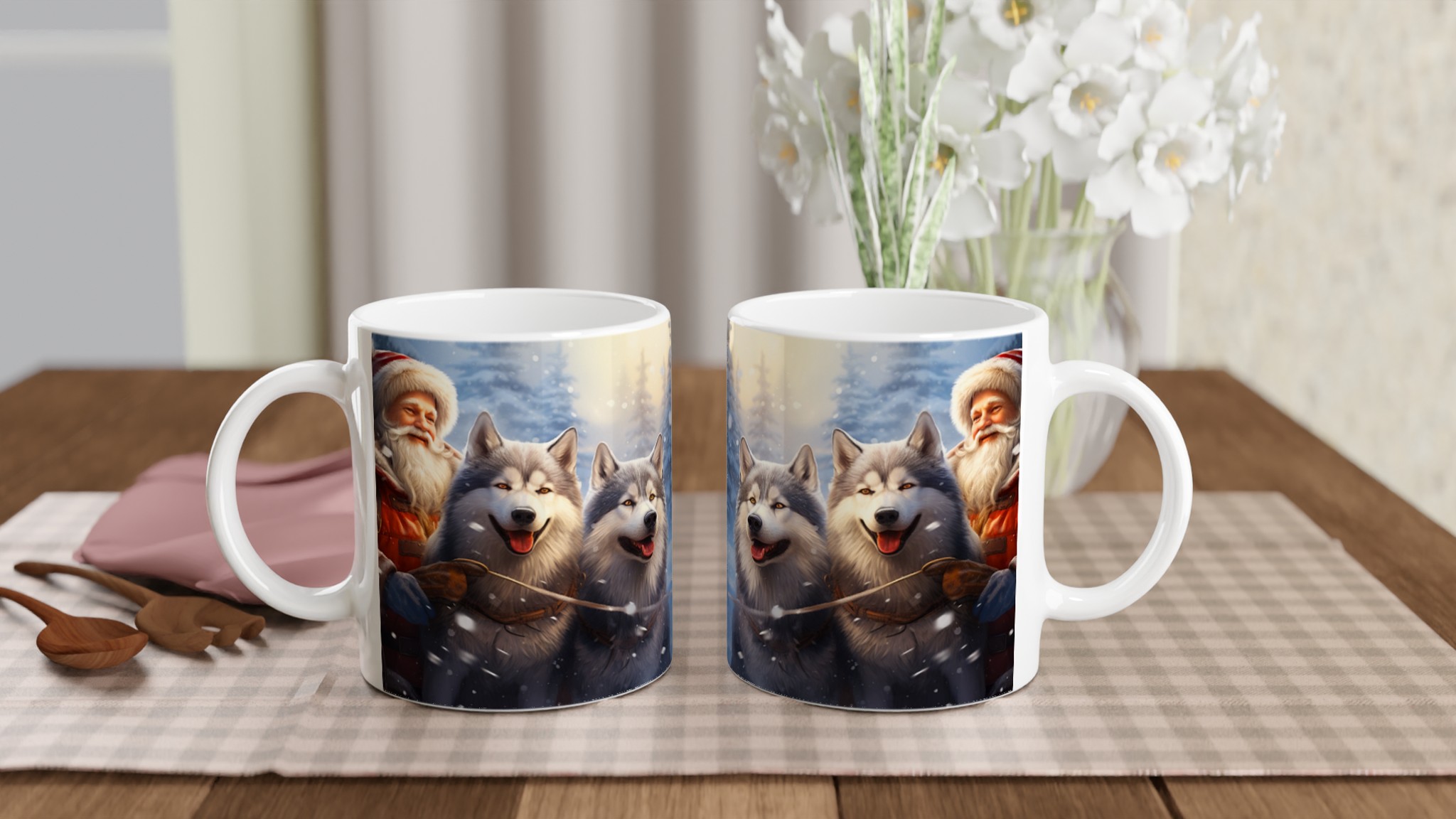 Den här stilrena keramiska muggen blir snabbt en vardagsfavorit. Perfekt för morgonkaffet, kvällens varma choklad eller när du bara vill njuta av en kopp te. Med sitt hjärtevärmande motiv av en leende tomte och hans glada huskyhundar i ett vinterlandskap, fångar den den mysiga julkänslan perfekt. Den blanka vita ytan gör att trycken framhävs med klara och levande färger, som håller sig fina även efter många turer i mikron och diskmaskinen.