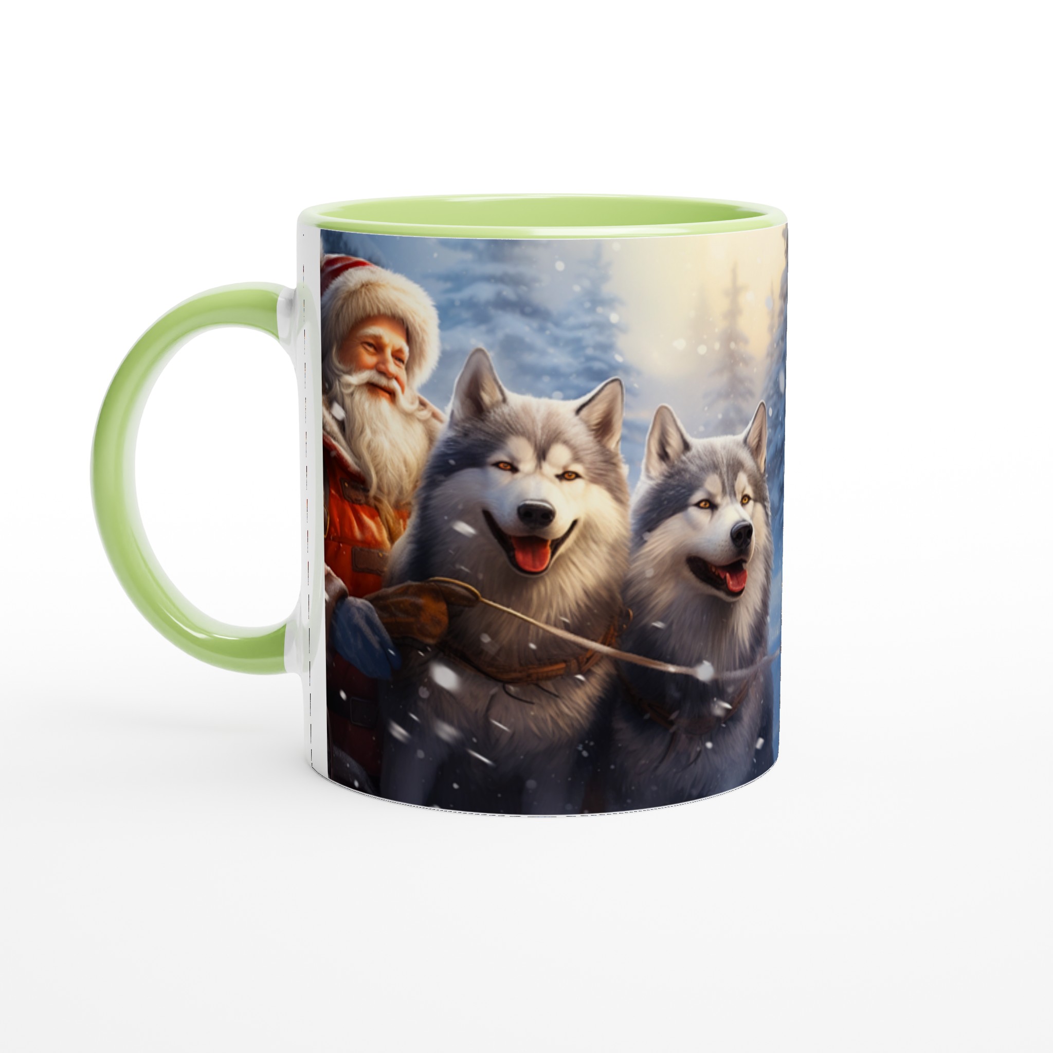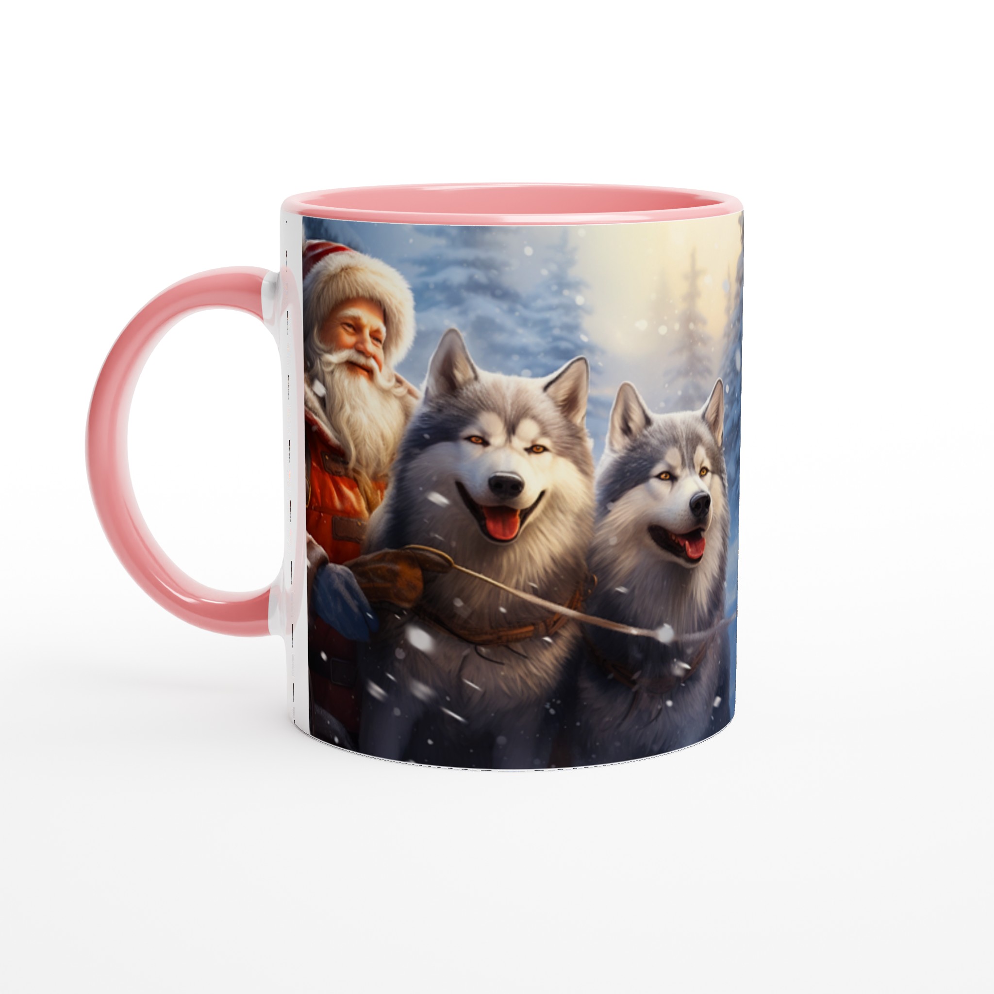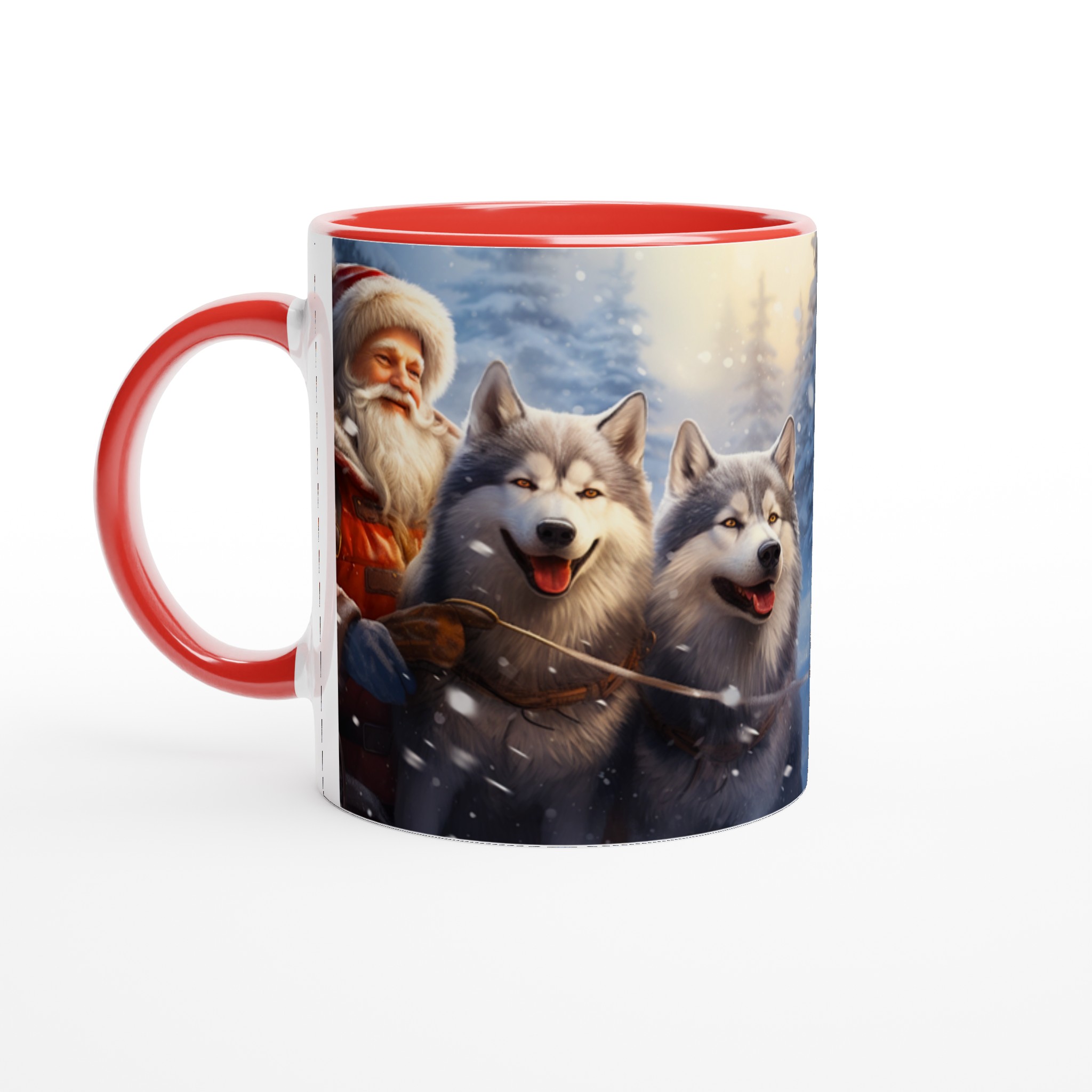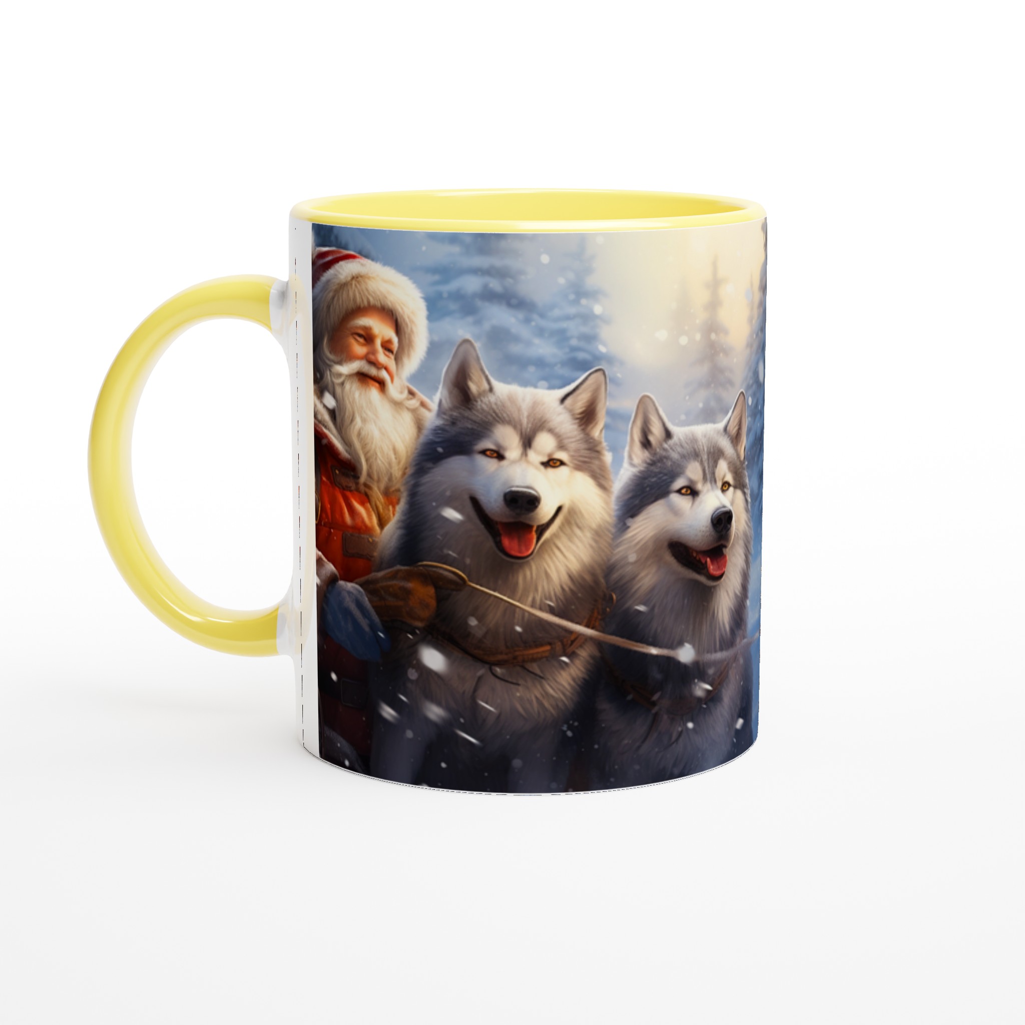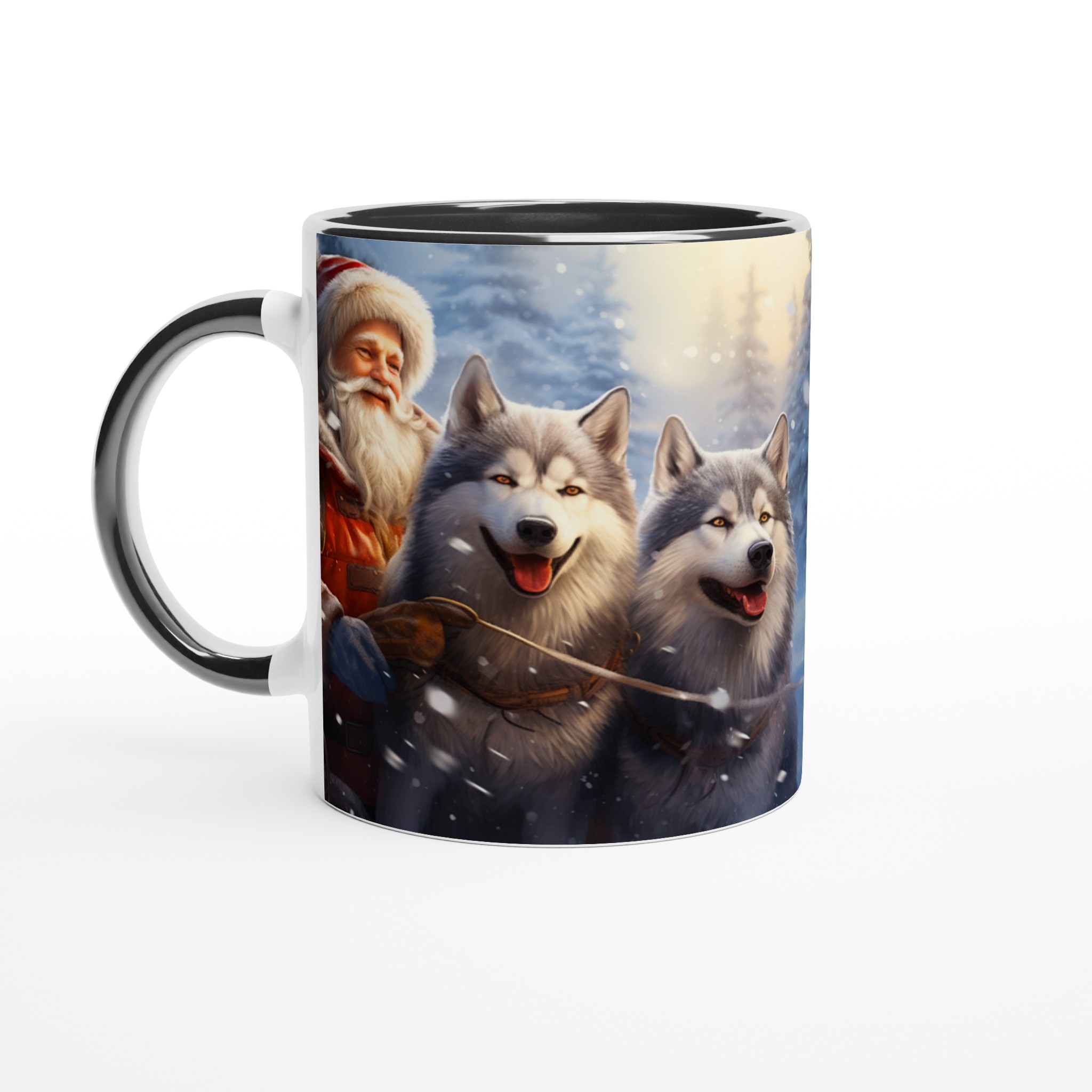 Den här stilrena keramiska muggen blir snabbt en vardagsfavorit. Perfekt för morgonkaffet, kvällens varma choklad eller när du bara vill njuta av en kopp te. Med sitt hjärtevärmande motiv av en leende tomte och hans glada huskyhundar i ett vinterlandskap, fångar den den mysiga julkänslan perfekt. Den blanka vita ytan gör att trycken framhävs med klara och levande färger, som håller sig fina även efter många turer i mikron och diskmaskinen.