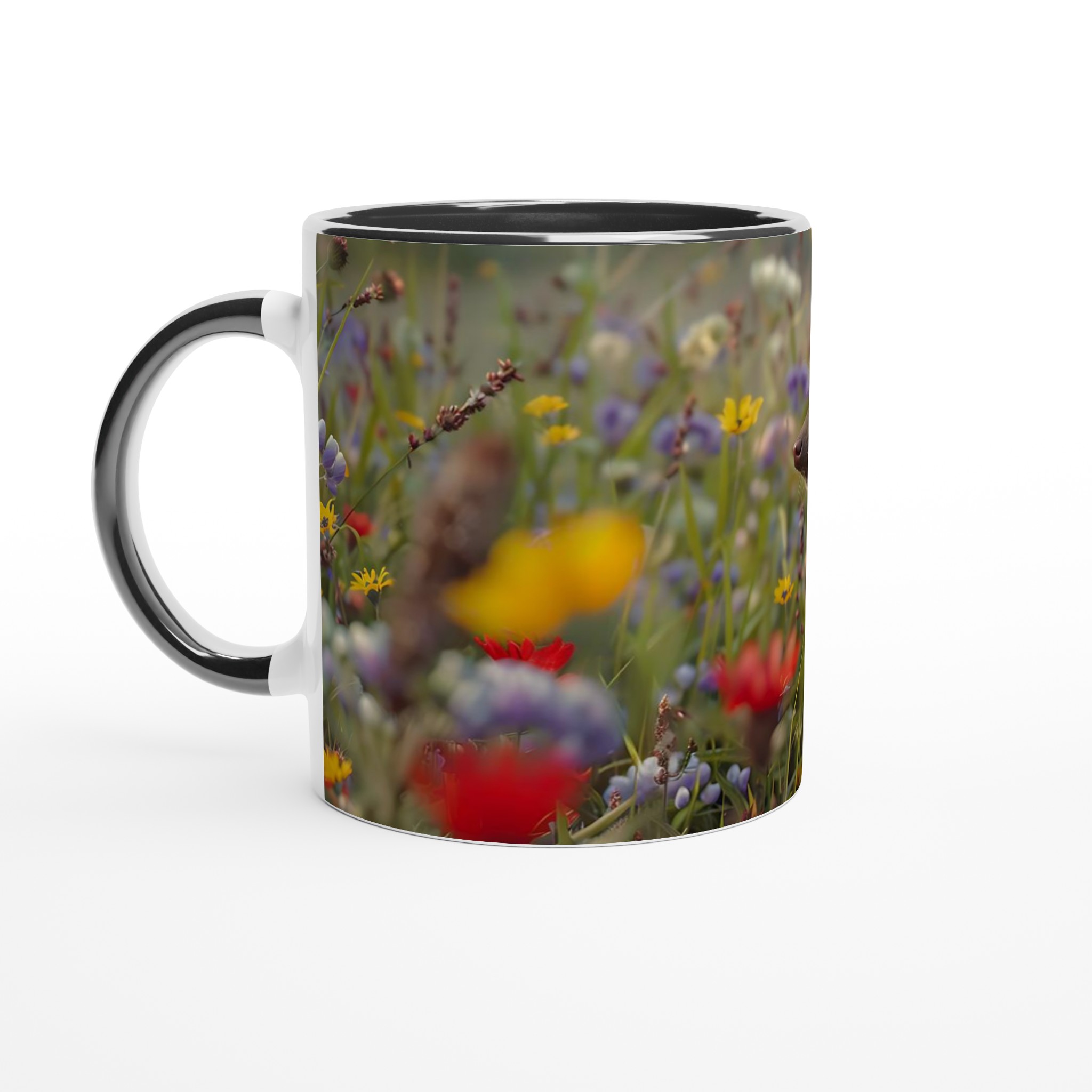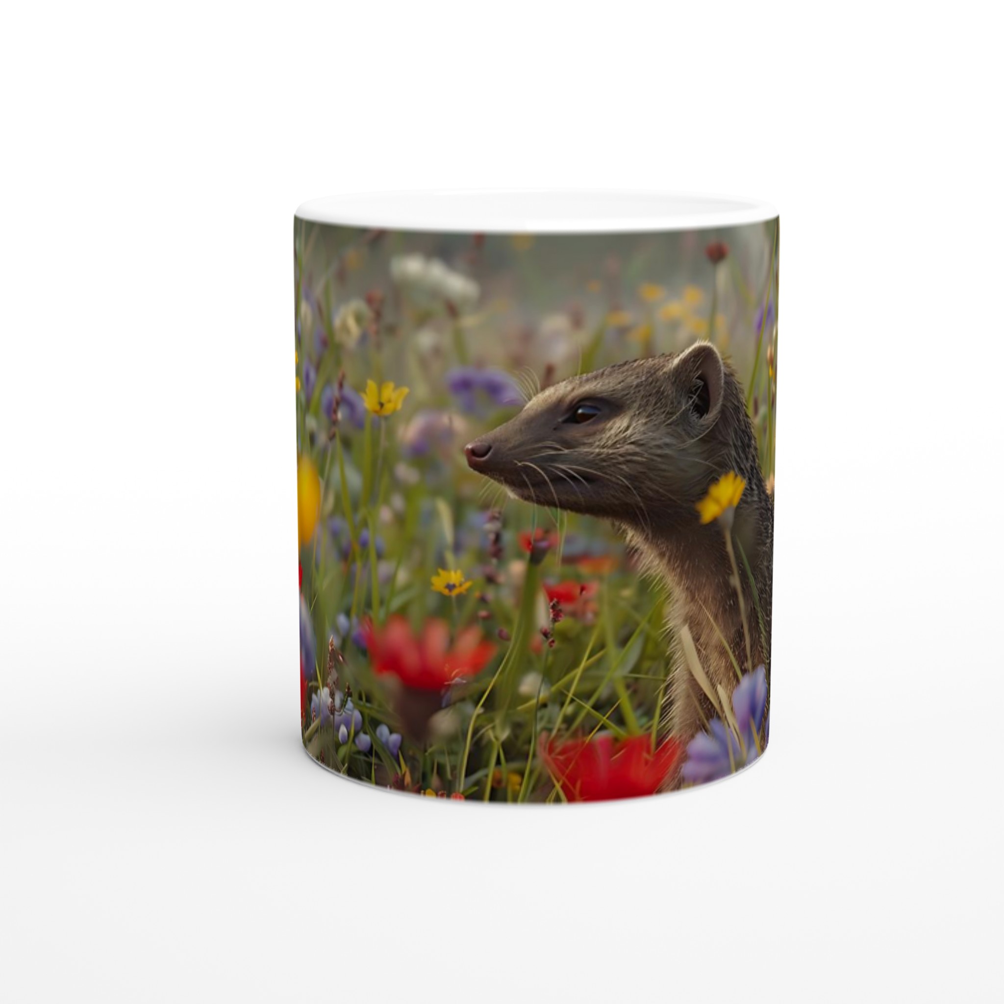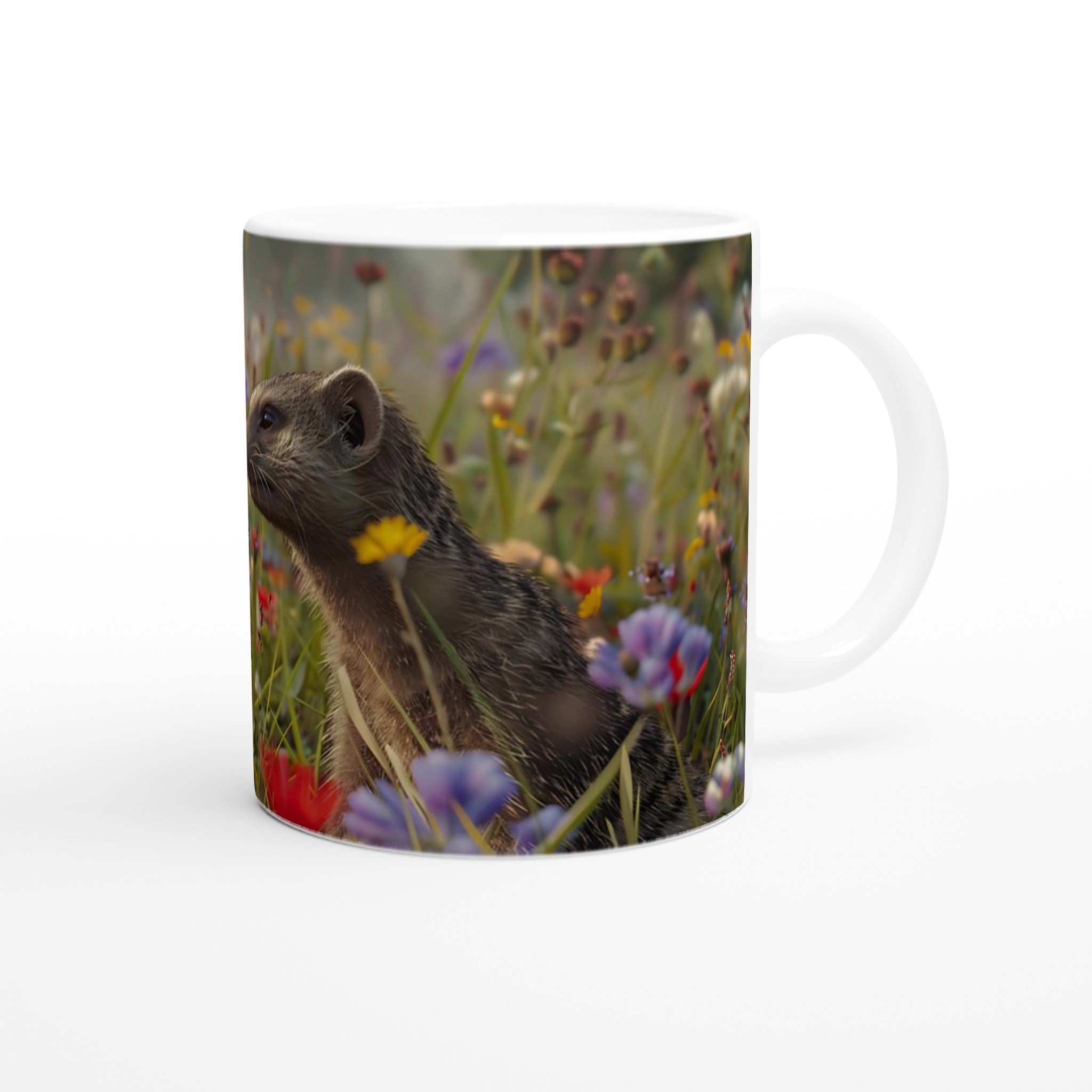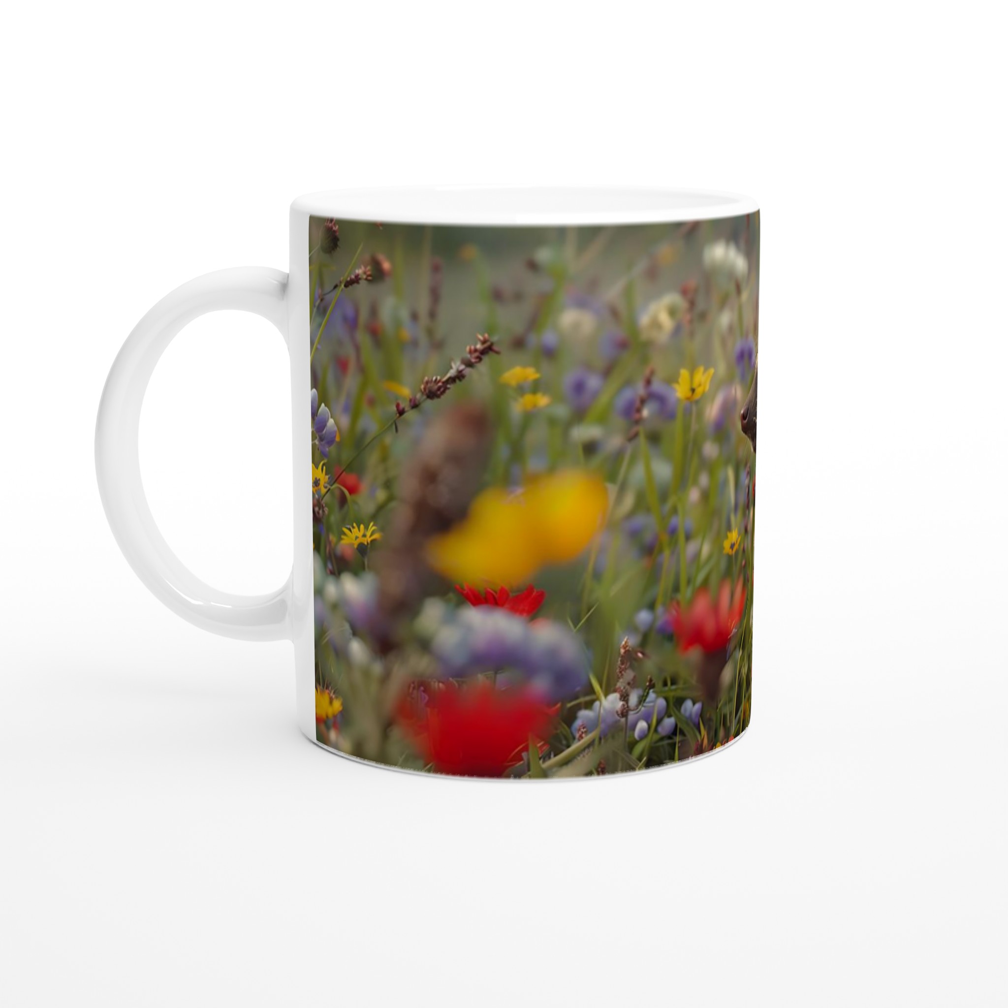 Fånga känslan av en solig vårdag med denna underbara keramiska mugg, som blir en omedelbar favorit i ditt hem. Prydd med ett förtrollande motiv av en vessla i ett blommande fält, omgiven av klara gula, röda och lila blommor, erbjuder denna mugg en lugn och inbjudande start på varje dag. Perfekt för morgonkaffet, en lugn stund med varm choklad, eller när du bara vill njuta av en kopp te medan du drömmer dig bort till naturens skönhet.