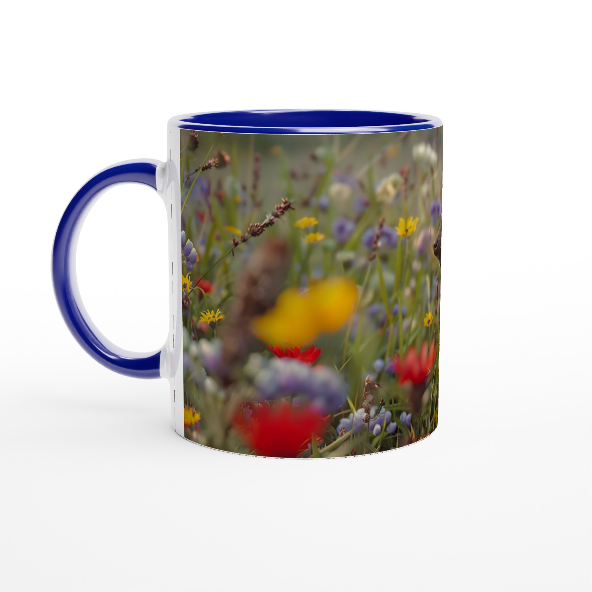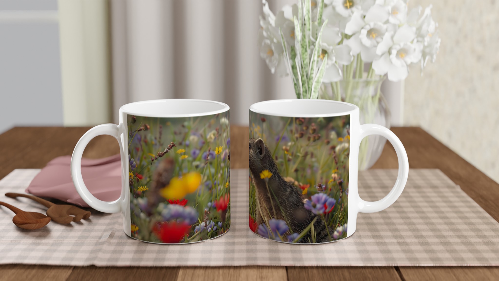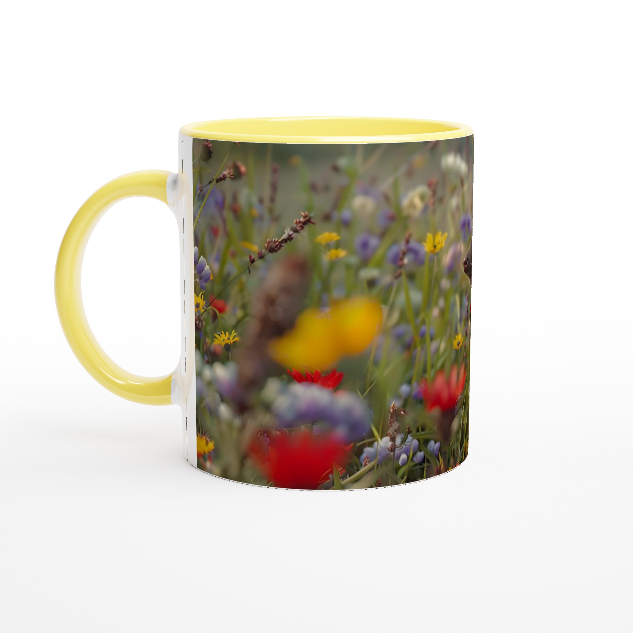 Fånga känslan av en solig vårdag med denna underbara keramiska mugg, som blir en omedelbar favorit i ditt hem. Prydd med ett förtrollande motiv av en vessla i ett blommande fält, omgiven av klara gula, röda och lila blommor, erbjuder denna mugg en lugn och inbjudande start på varje dag. Perfekt för morgonkaffet, en lugn stund med varm choklad, eller när du bara vill njuta av en kopp te medan du drömmer dig bort till naturens skönhet.