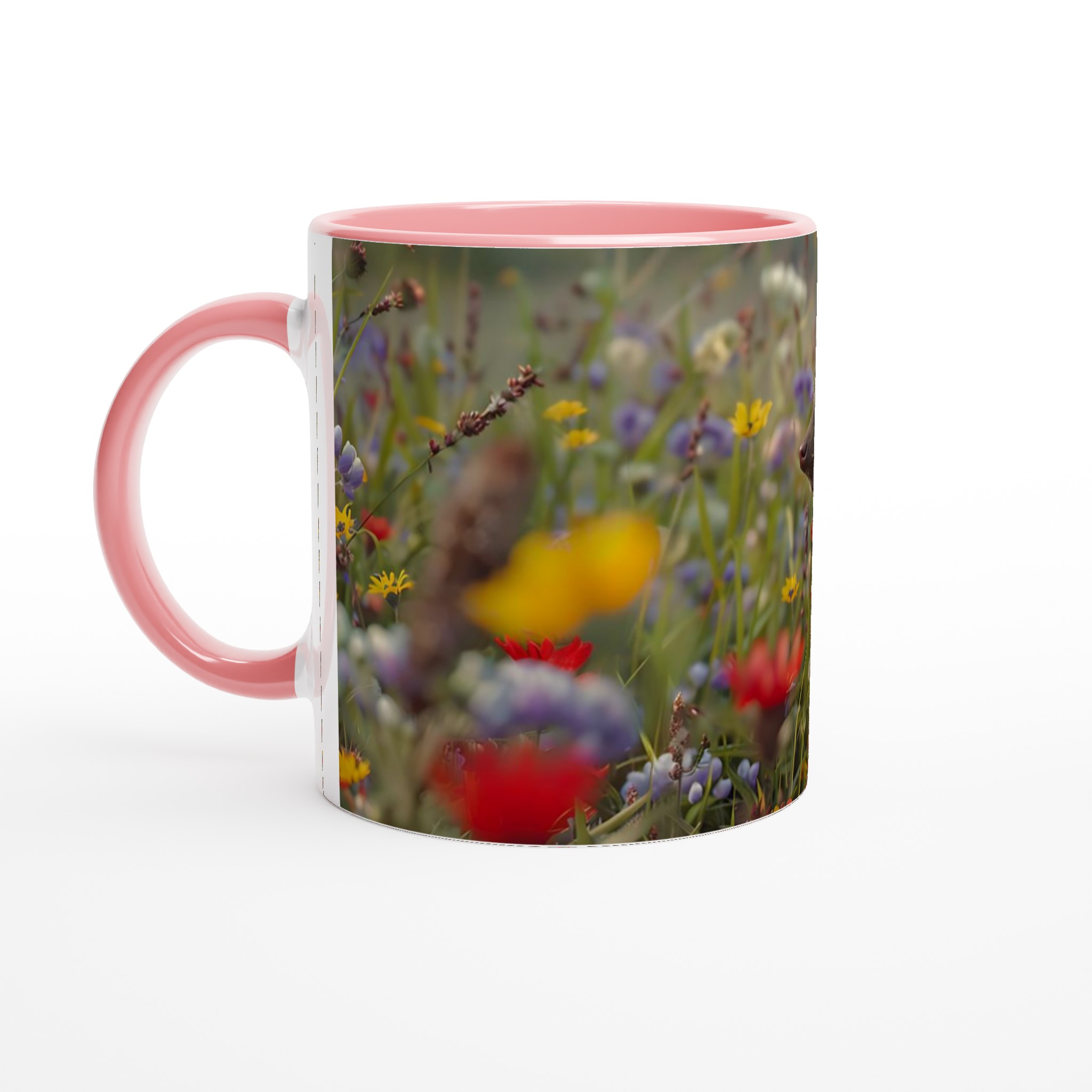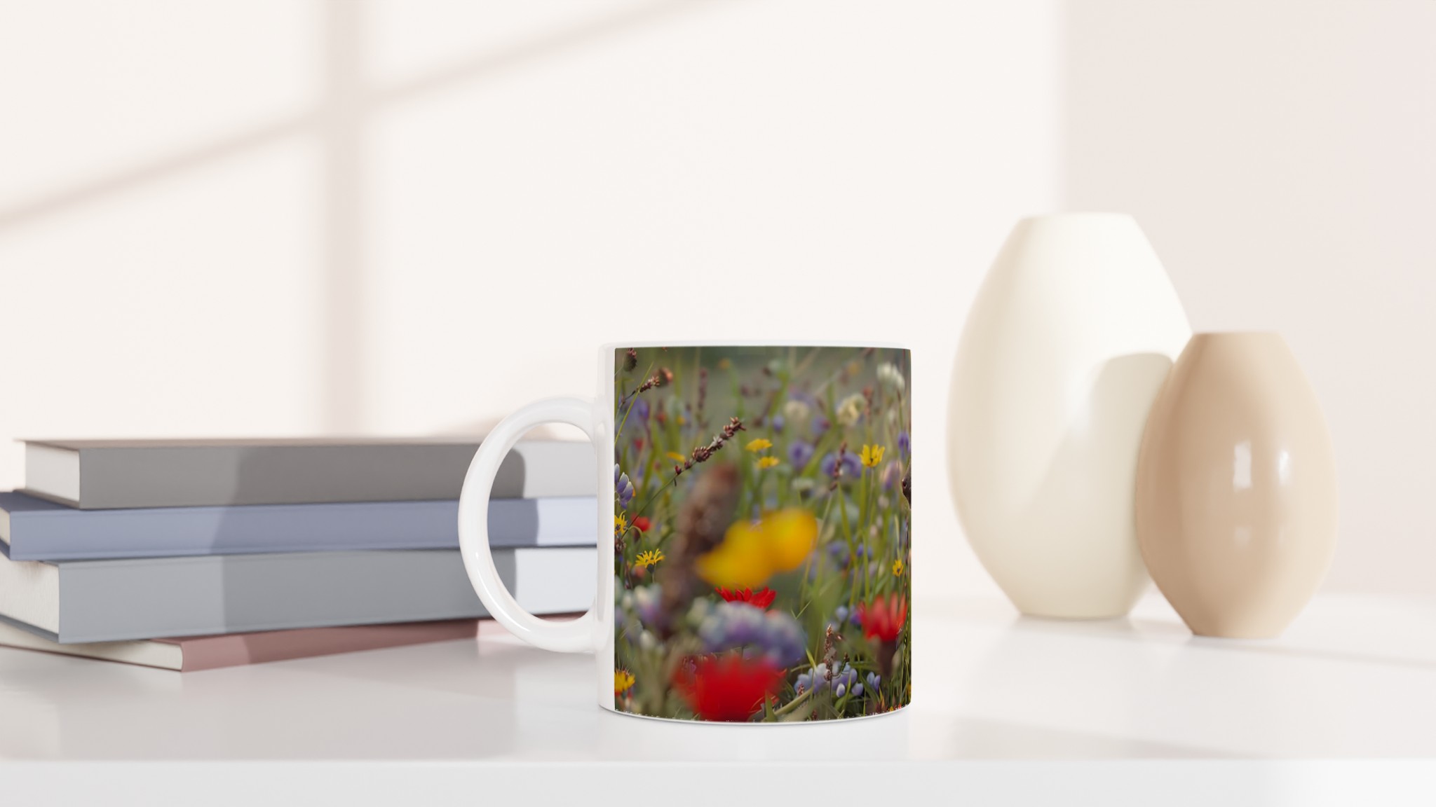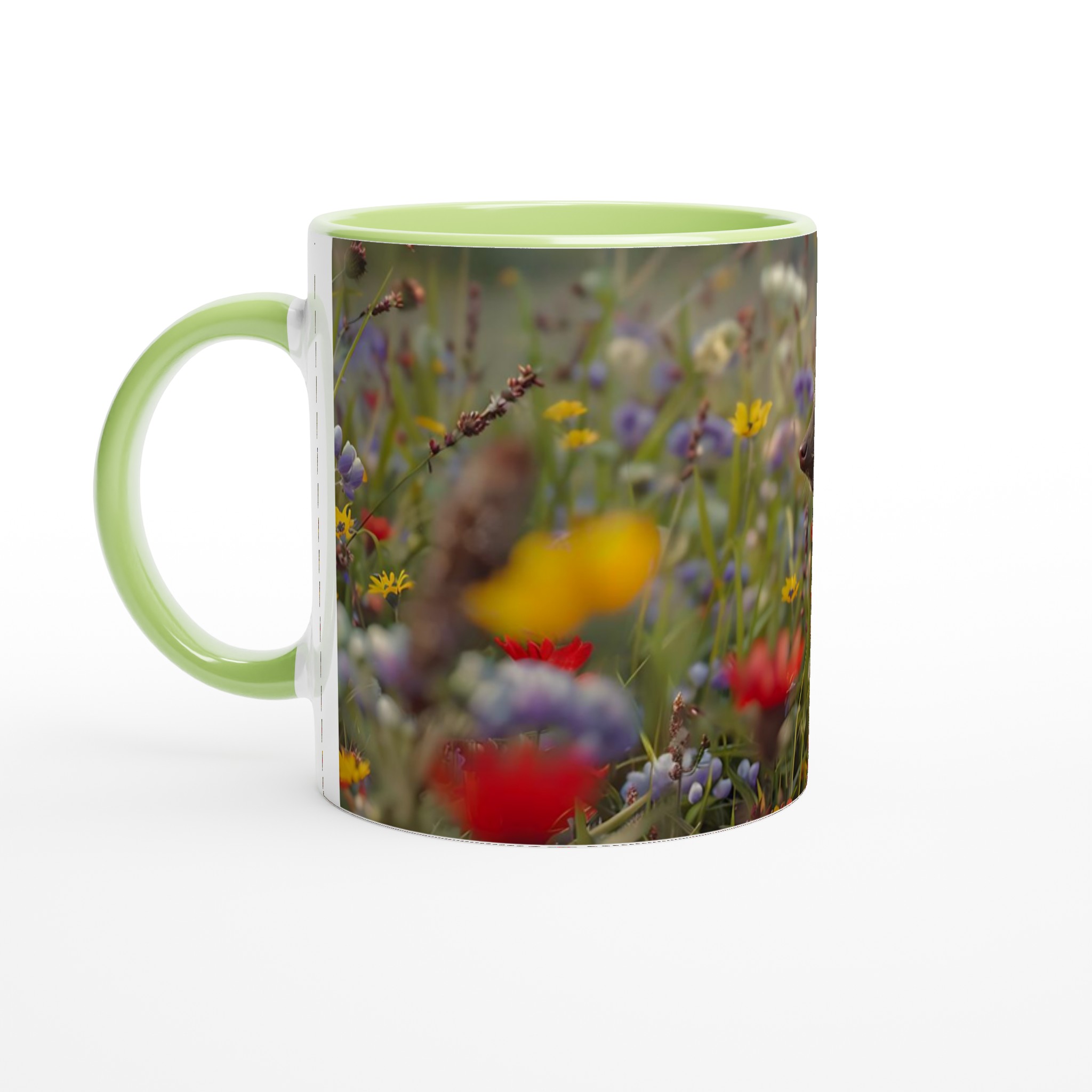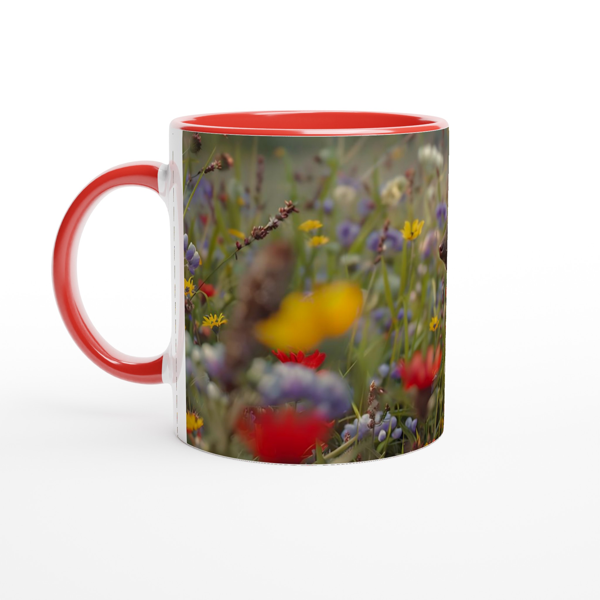 Fånga känslan av en solig vårdag med denna underbara keramiska mugg, som blir en omedelbar favorit i ditt hem. Prydd med ett förtrollande motiv av en vessla i ett blommande fält, omgiven av klara gula, röda och lila blommor, erbjuder denna mugg en lugn och inbjudande start på varje dag. Perfekt för morgonkaffet, en lugn stund med varm choklad, eller när du bara vill njuta av en kopp te medan du drömmer dig bort till naturens skönhet.