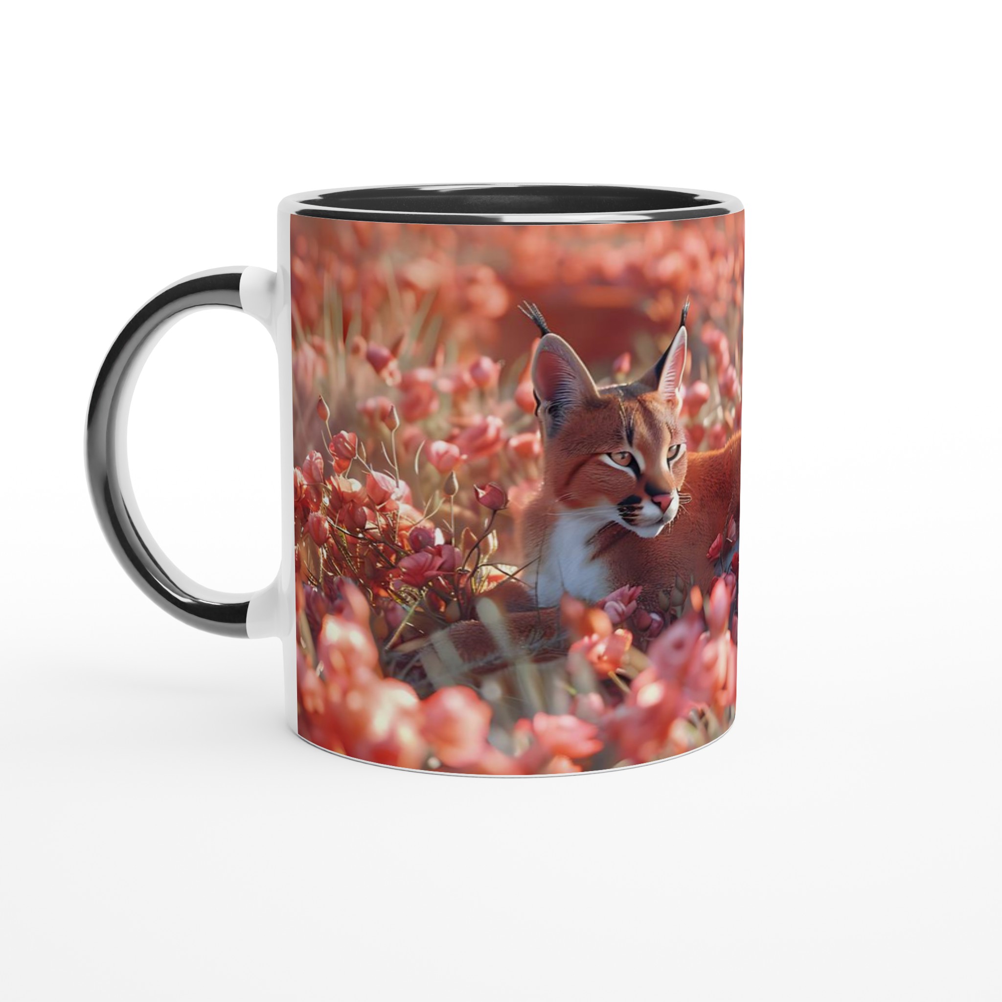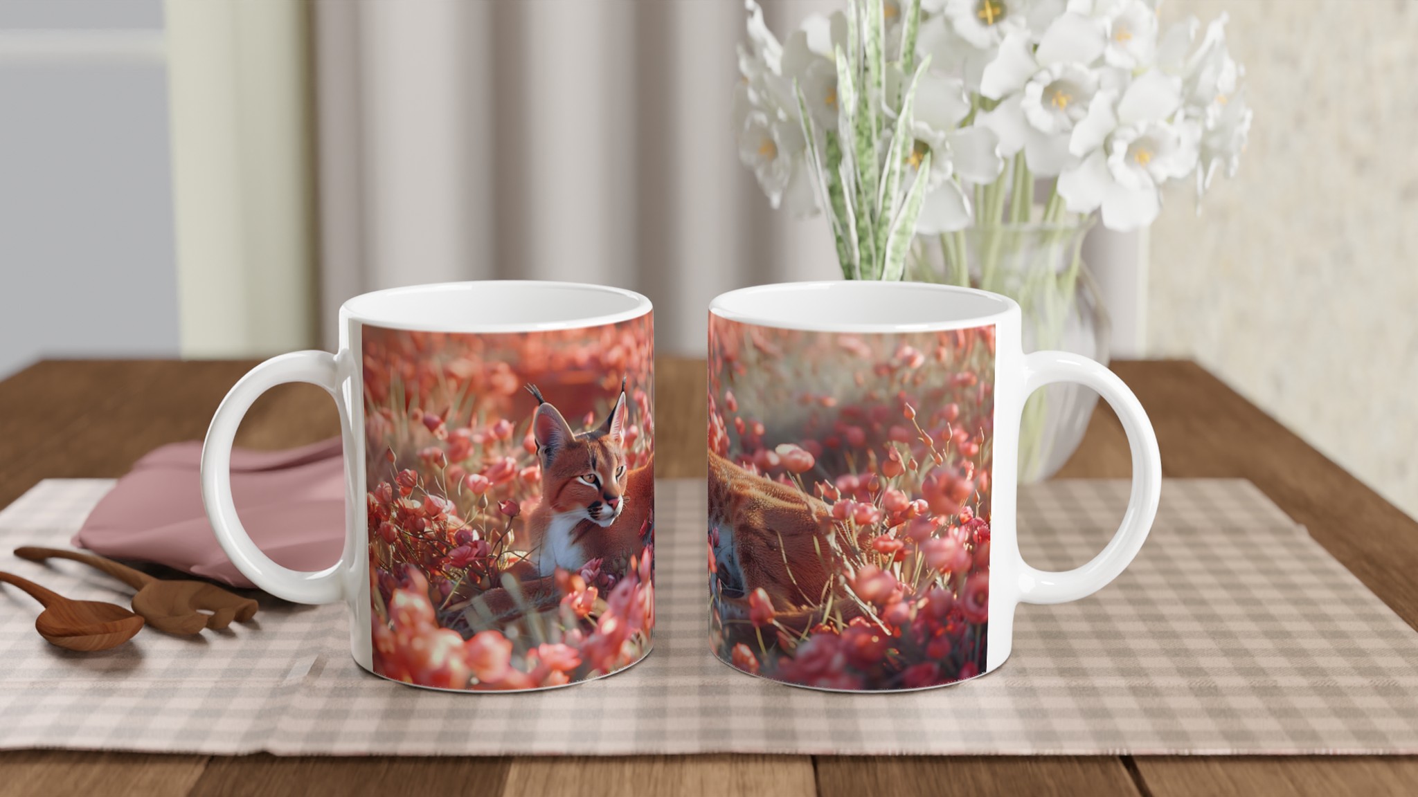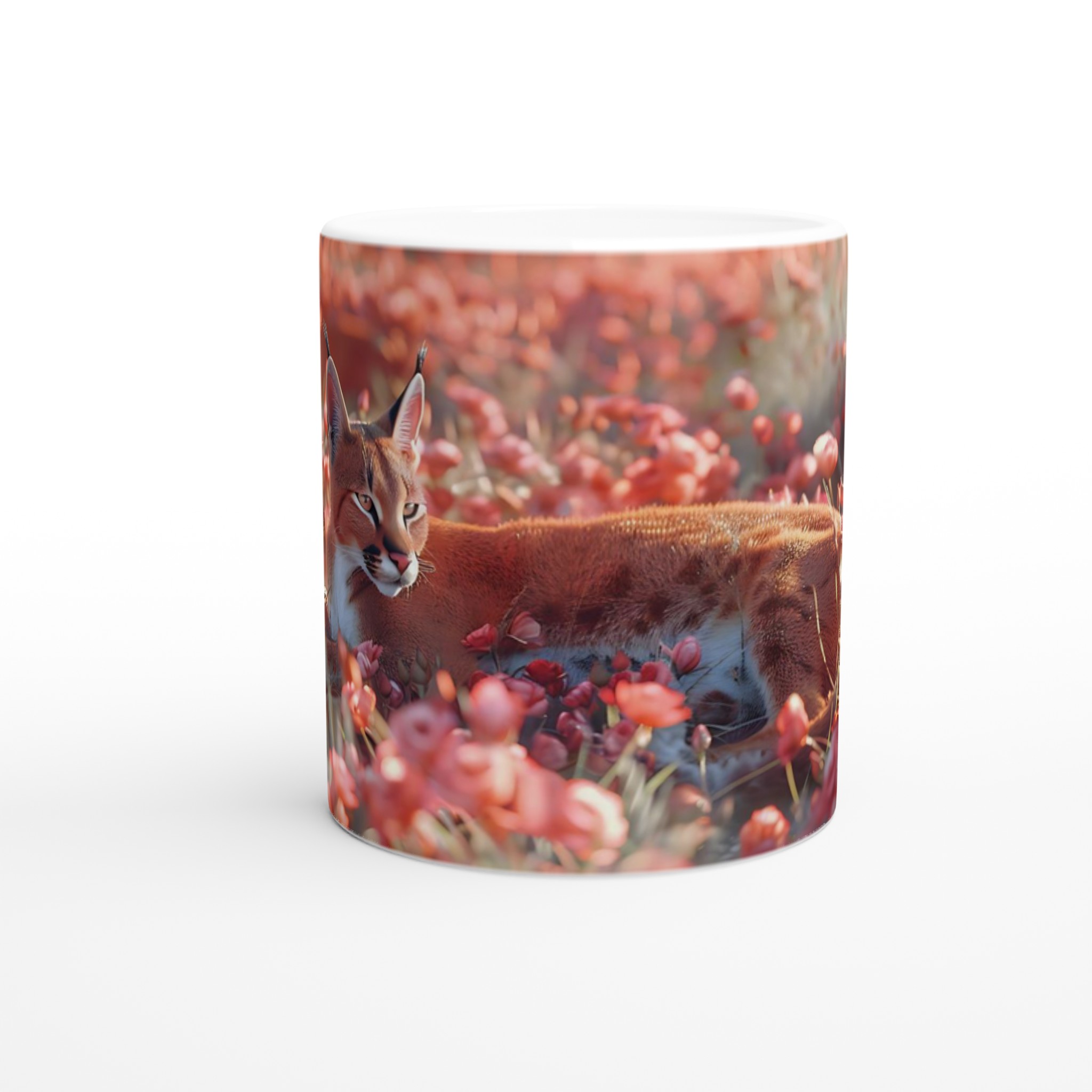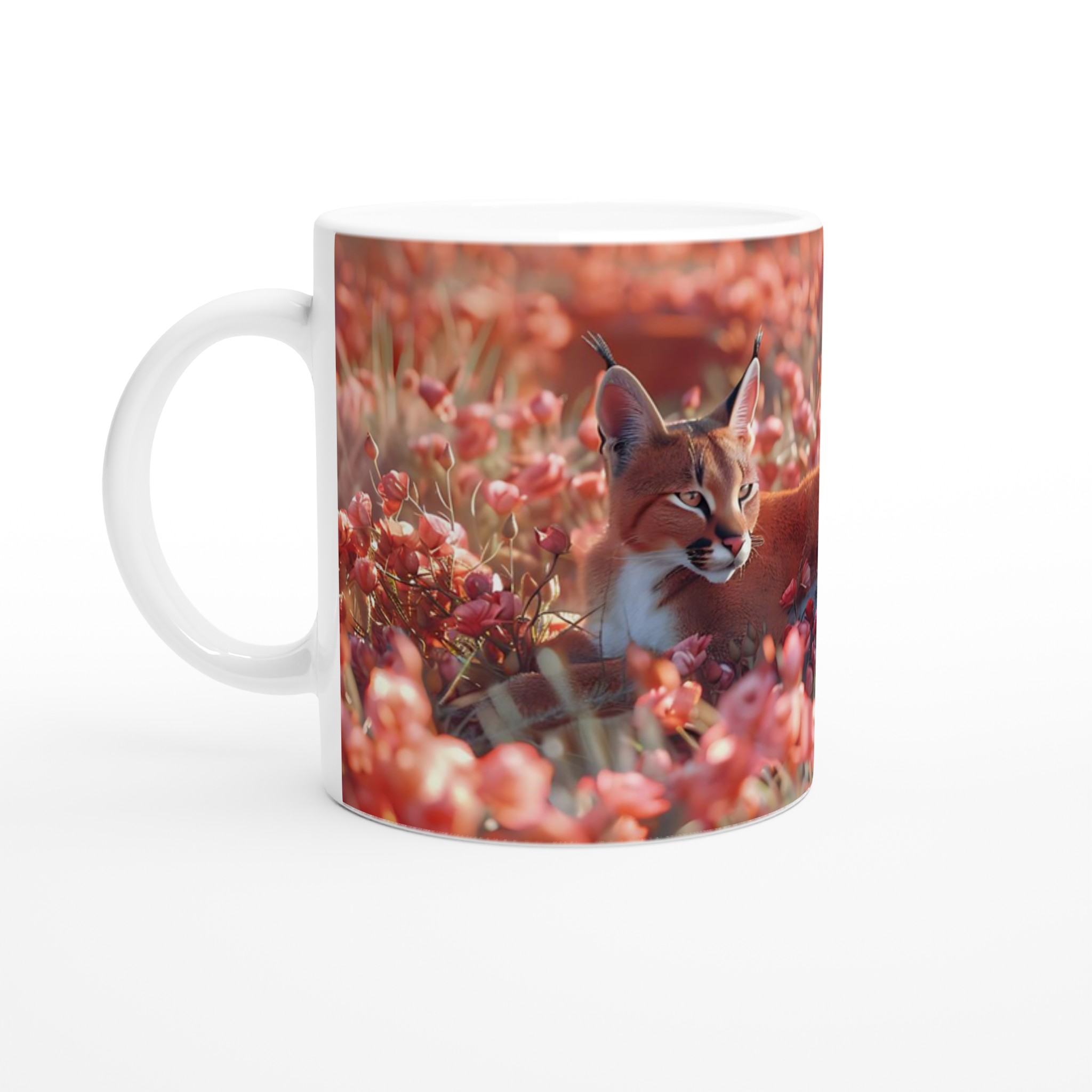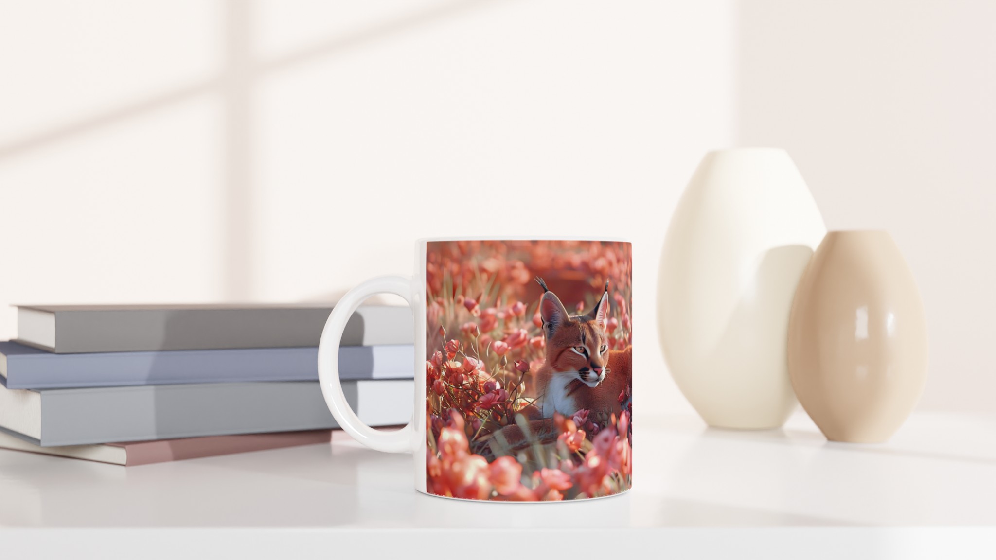 Föreställ dig en lugn stund, en solig eftermiddag, omgiven av blommande vallmo och sällskap av en majestätisk karakal. Denna drömska scen fångas perfekt på vår stilrena keramiska mugg, som snabbt blir en vardagsfavorit. Perfekt för morgonkaffet, kvällens varma choklad eller när du bara vill njuta av en kopp te. Den blanka ytan gör att trycket framhävs med klara och levande färger, som håller sig fina även efter många turer i mikron och diskmaskinen.