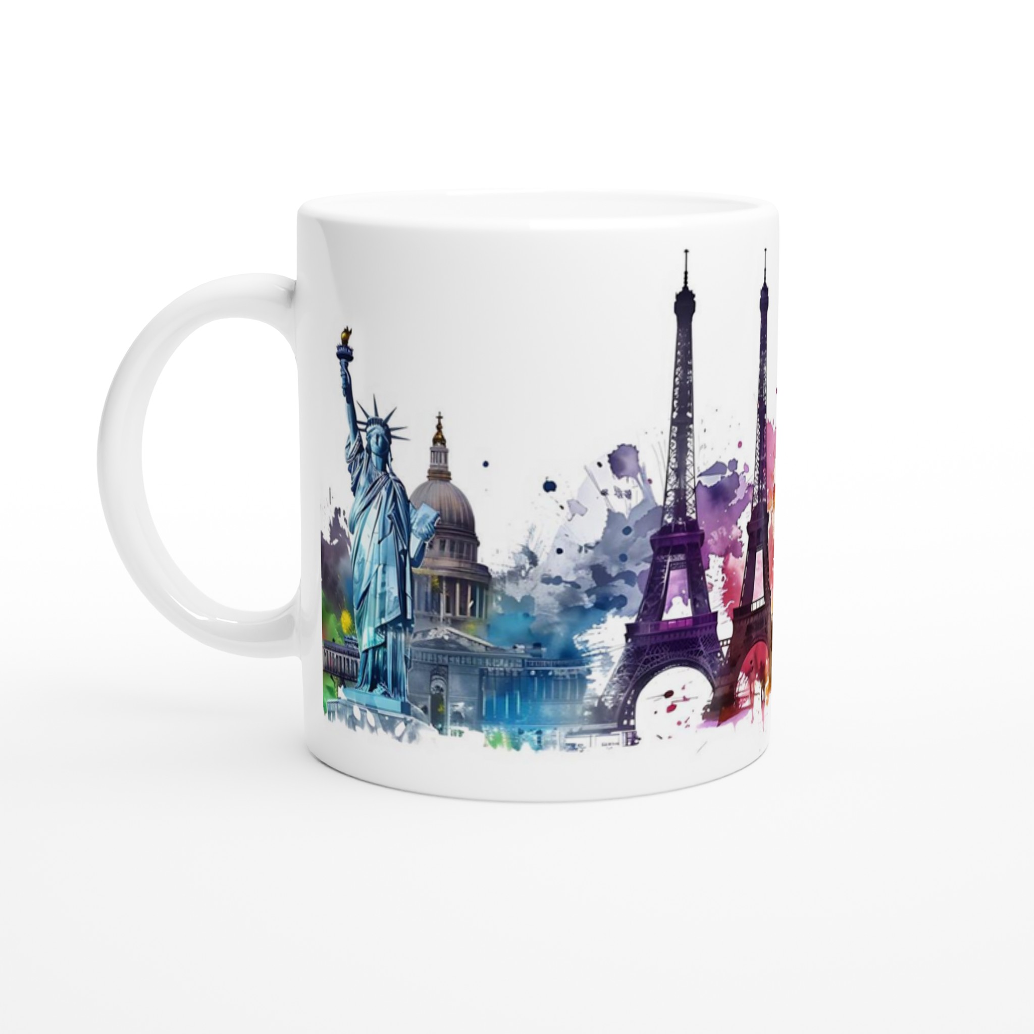 Lyft varje kaffestund med vår premium keramikmugg – stilren, hållbar och skapad för att låta ditt motiv glänsa. Denna mugg är en hyllning till den moderna äventyraren, med en levande akvarelldesign som fångar ikoniska landmärken från världens hörn, omfamnade av en explosion av färg. Det unika konstverket är inspirerat av bilden av majestätiska monument som Eiffeltornet, Frihetsgudinnan och Big Ben, smält samman med stänk av akvarell som sträcker sig från svalt blått och lila till varmt orange och rött. Perfekt för den som älskar att resa, drömma sig bort eller bara uppskattar konst med en personlig touch.