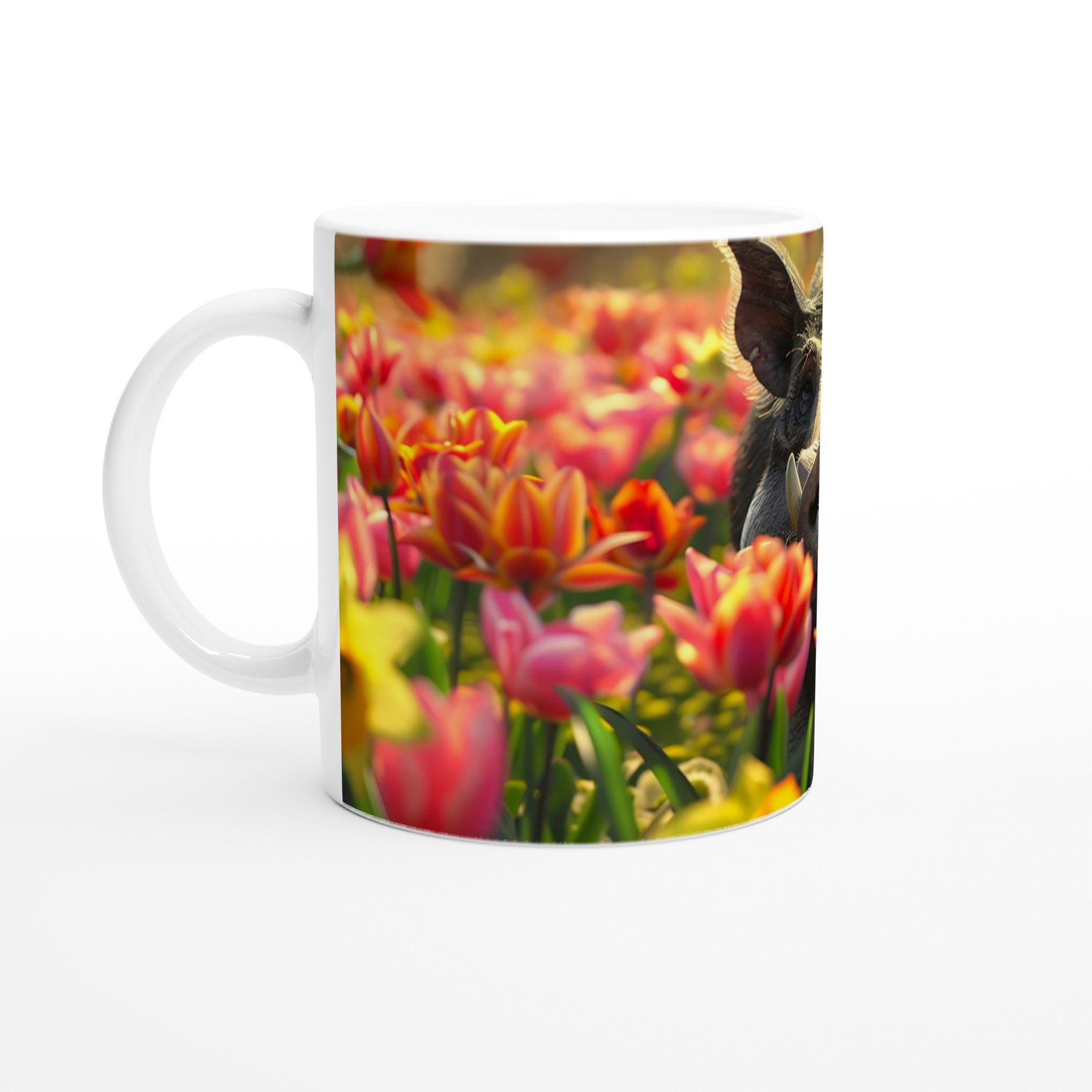 Denna mugg fångar den lekfulla charmen hos ett vårsvin omgiven av en exploderande blomsteräng i varma nyanser av orange, rött och gult. Den blanka vita ytan ger ett skarpt och levande tryck som verkligen sticker ut, oavsett om det är en personlig design, ett roligt citat eller en present till någon du tycker om. Ge bort en bit av denna idylliska naturupplevelse, perfekt för djurälskaren eller den som uppskattar en touch av fantasi i vardagen.