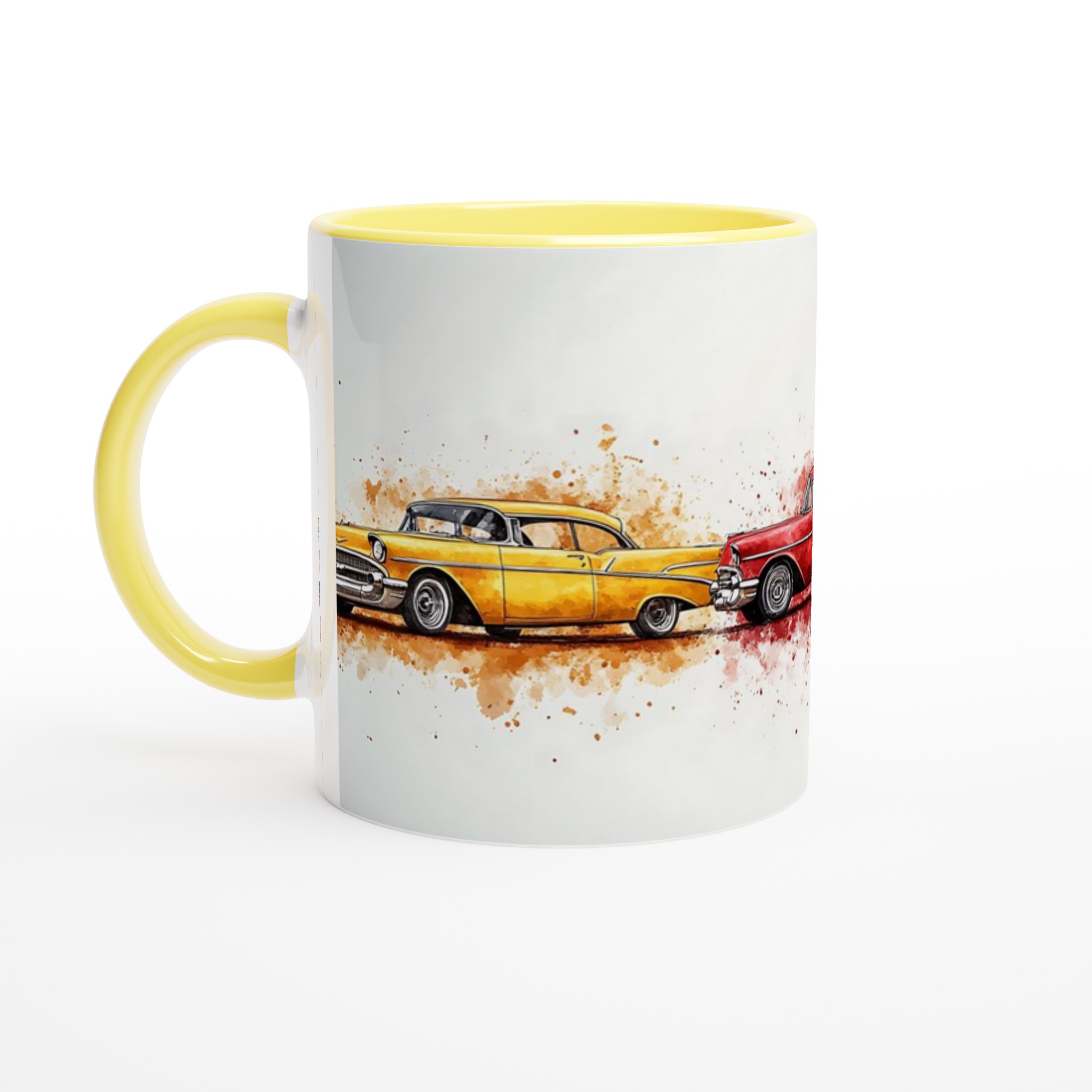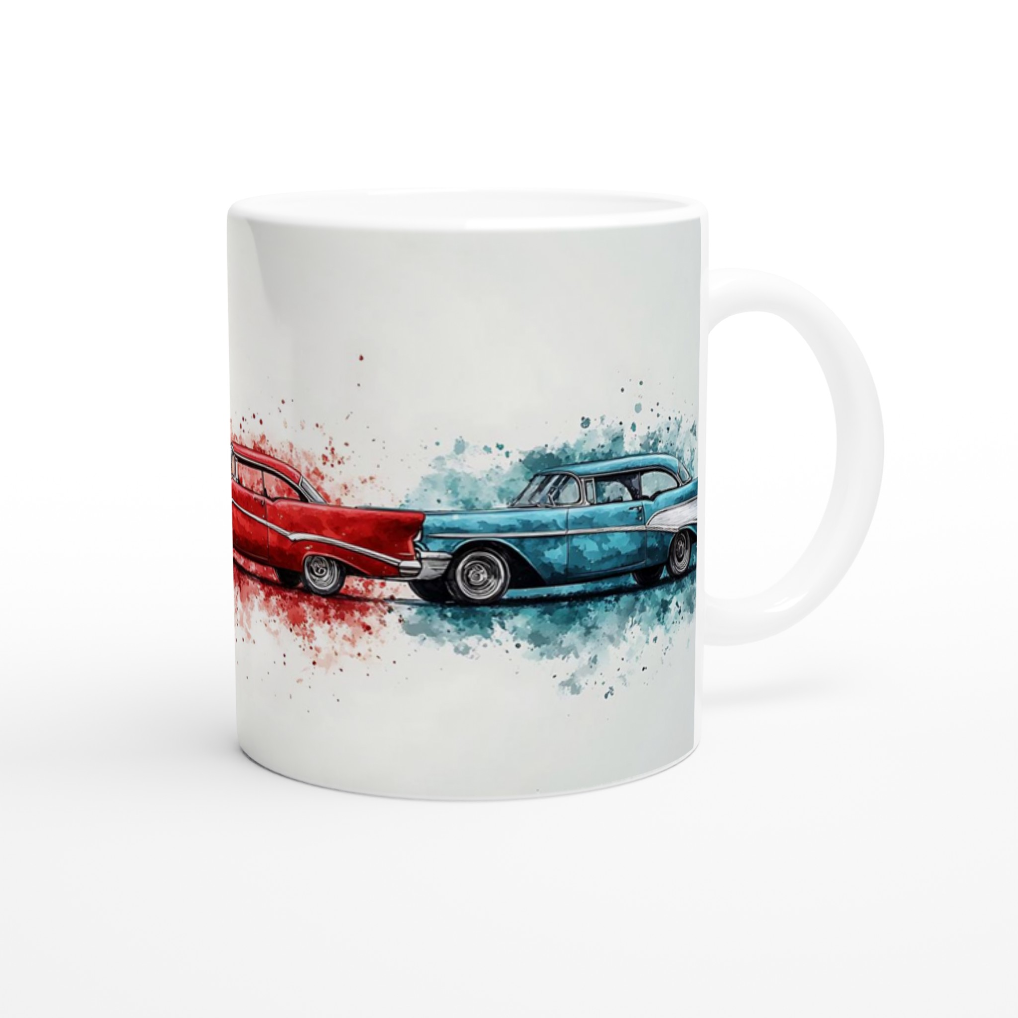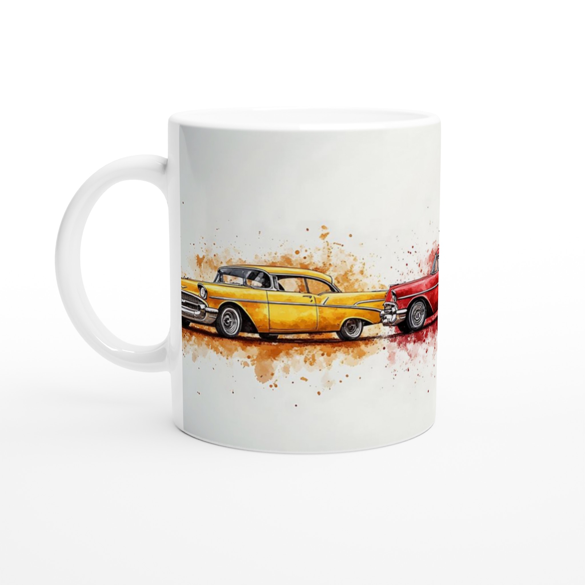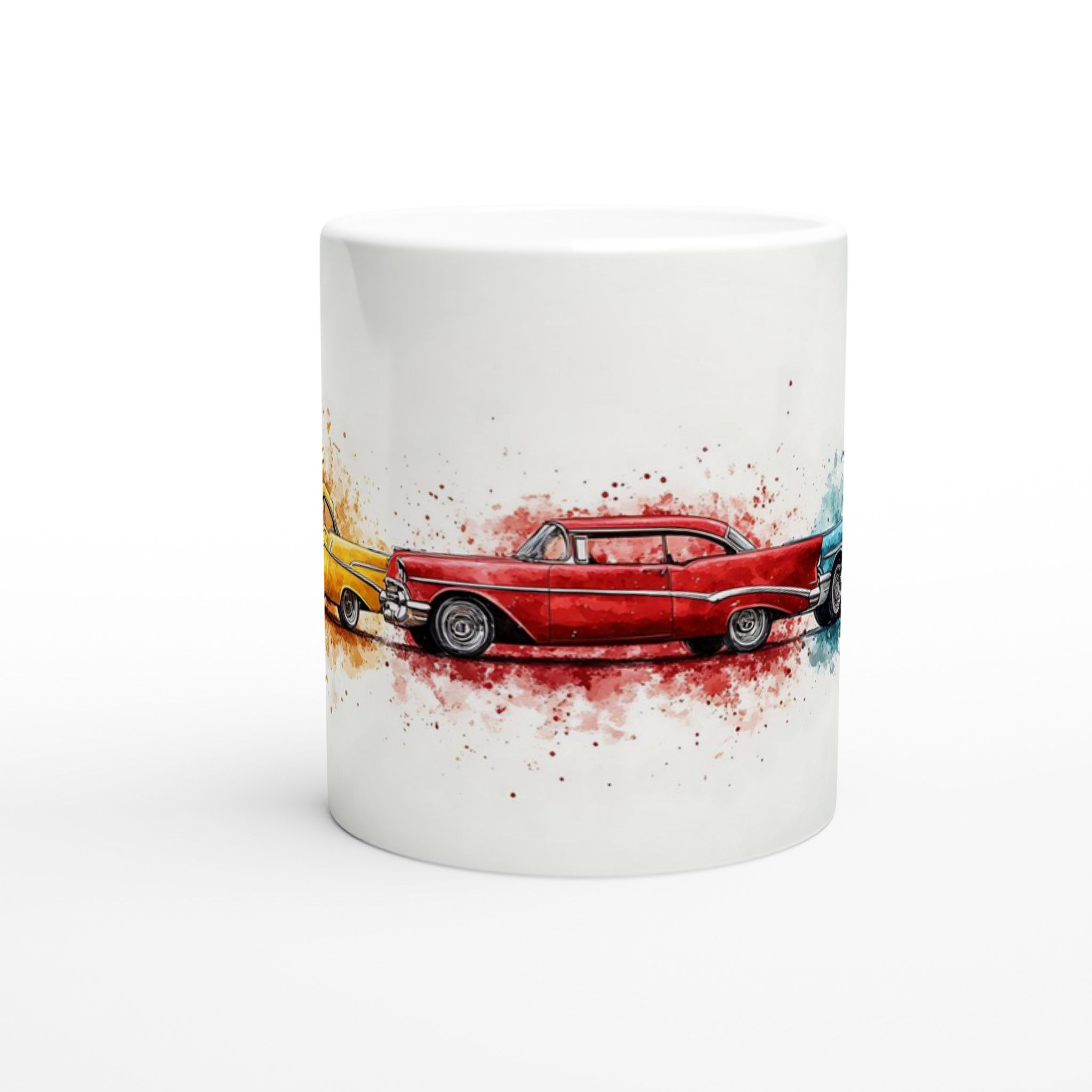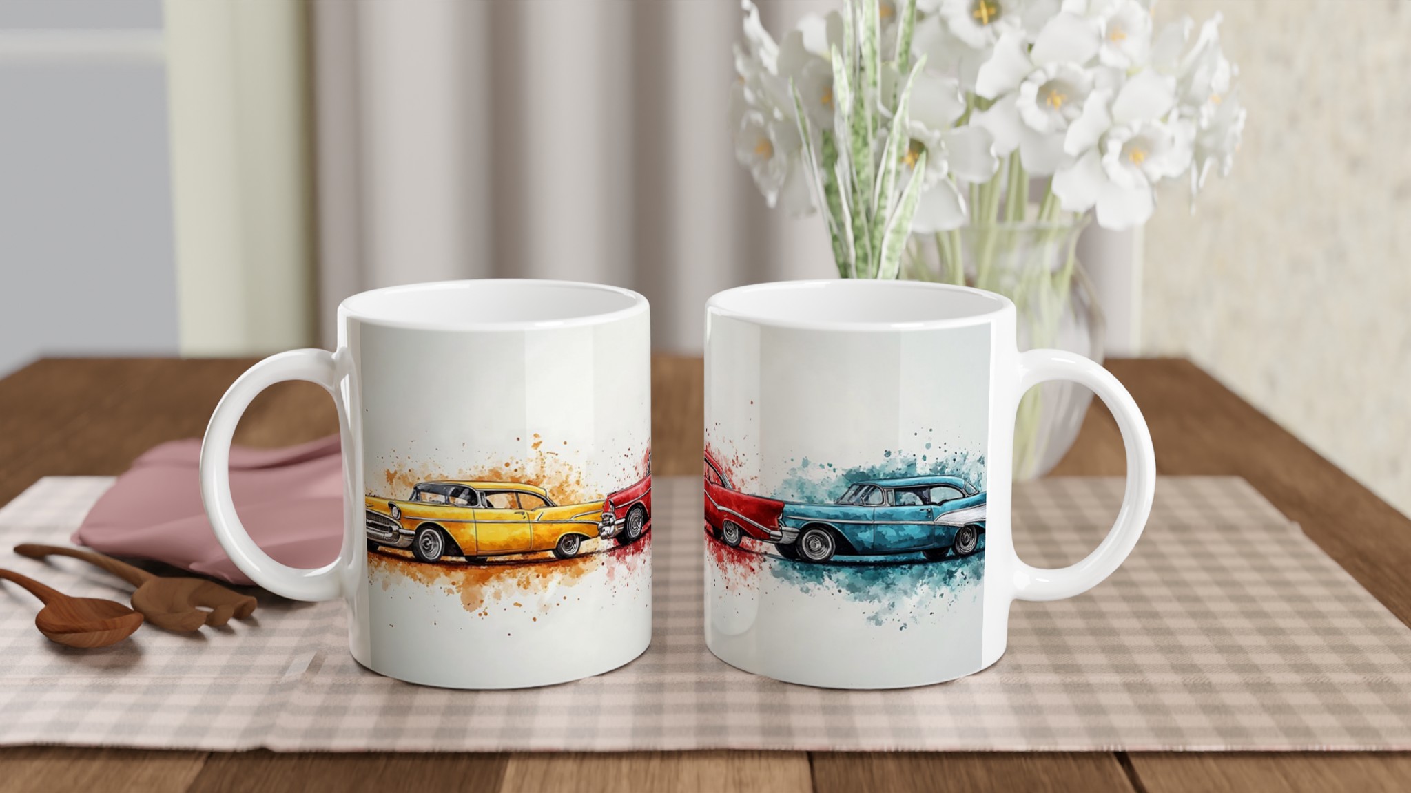 Låt morgonkaffet rulla in som en klassisk roadtrip! Med vår 11oz-keramikmugg får du varje morgon en explosion av färg och nostalgi. Den konstnärliga vattenfärgseffekten av tre ikoniska vintagebilar i solgult, brandrött och havsblått förvandlar varje klunk till en inspirerande stund.