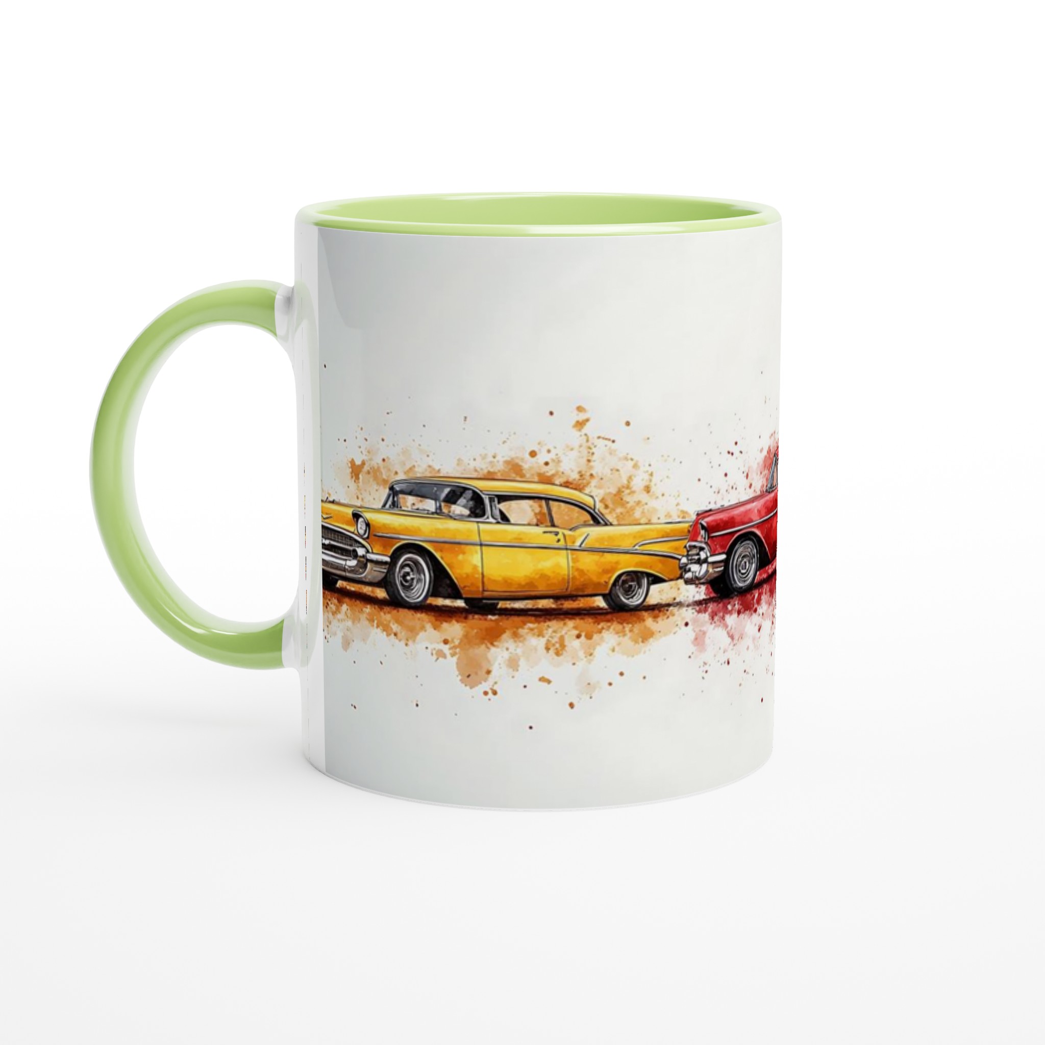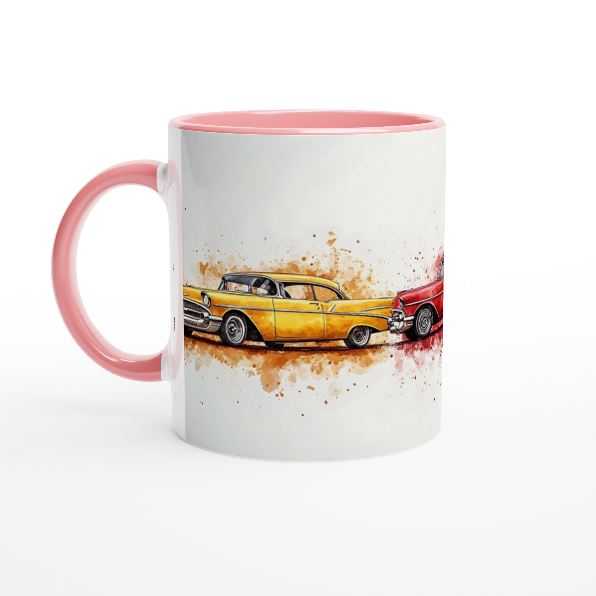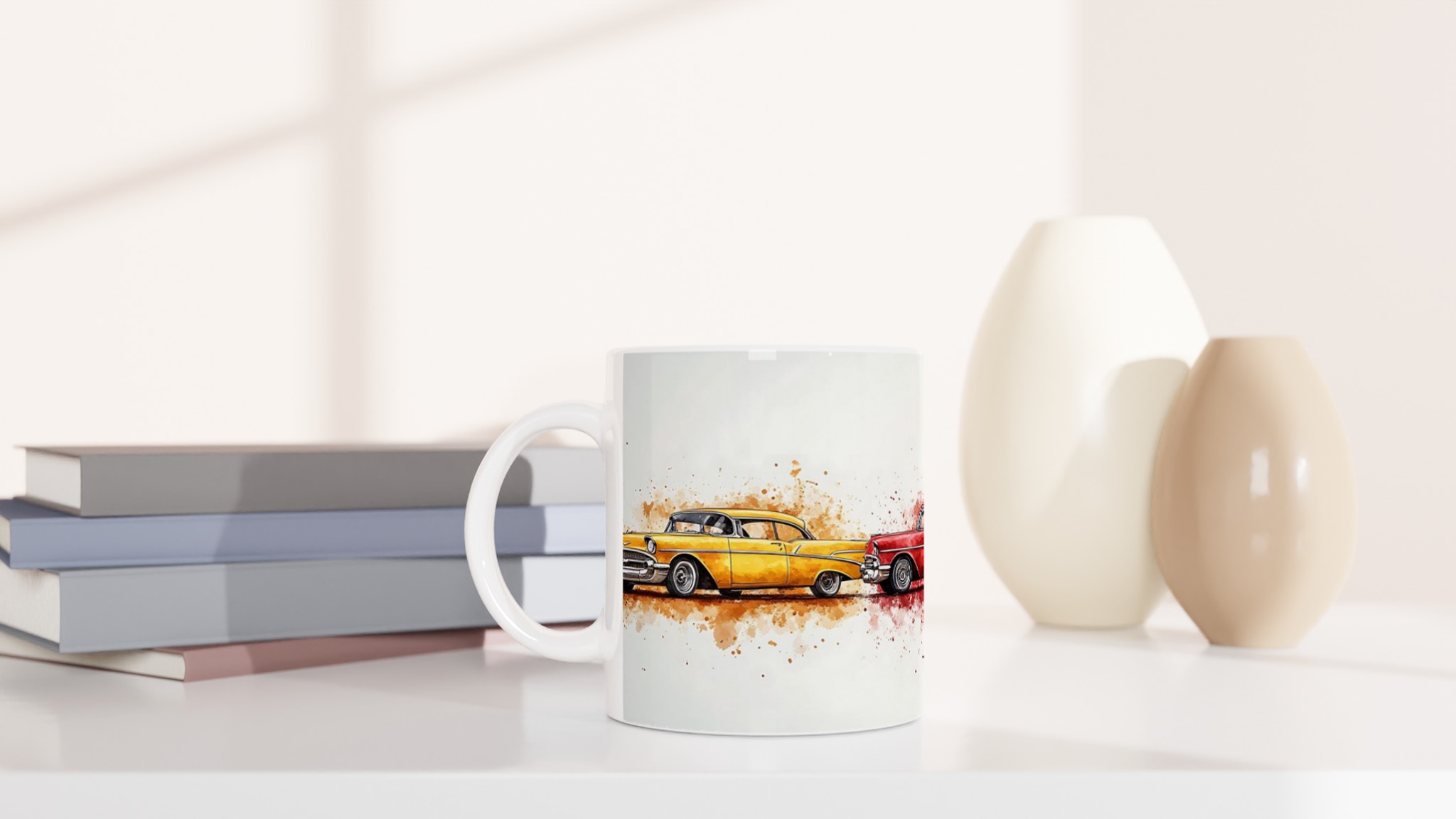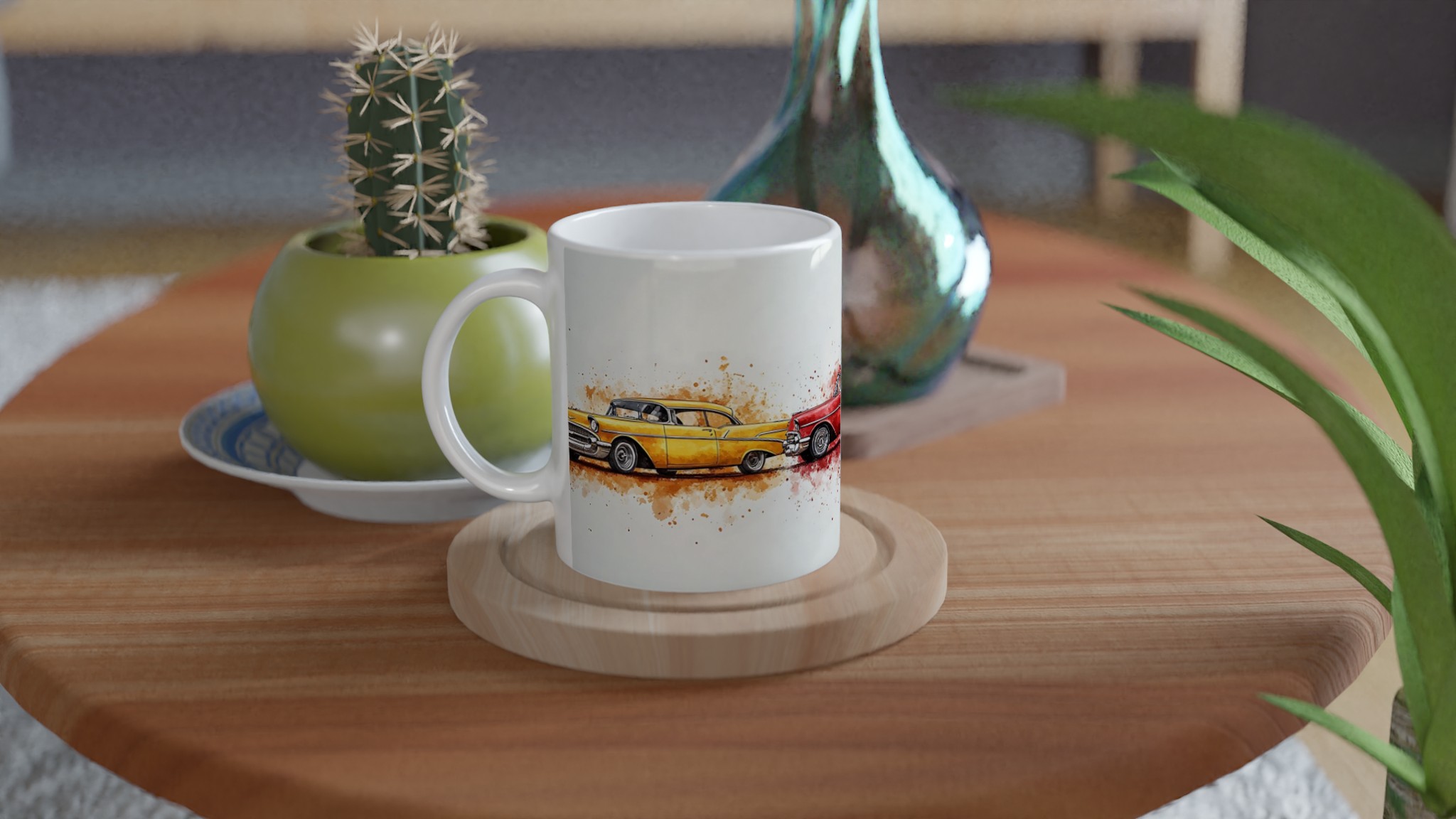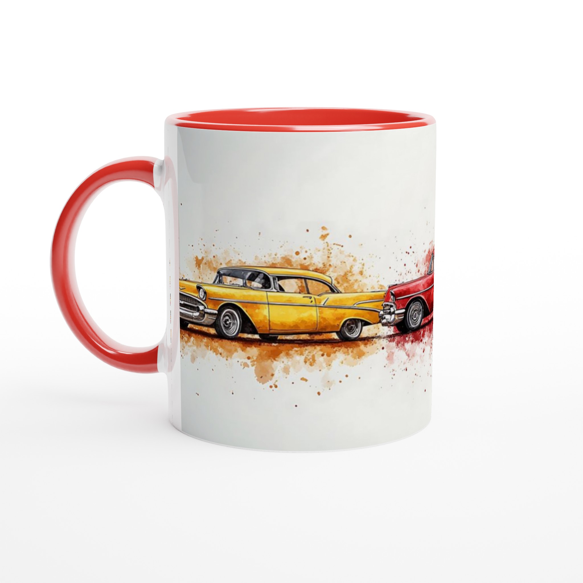 Låt morgonkaffet rulla in som en klassisk roadtrip! Med vår 11oz-keramikmugg får du varje morgon en explosion av färg och nostalgi. Den konstnärliga vattenfärgseffekten av tre ikoniska vintagebilar i solgult, brandrött och havsblått förvandlar varje klunk till en inspirerande stund.