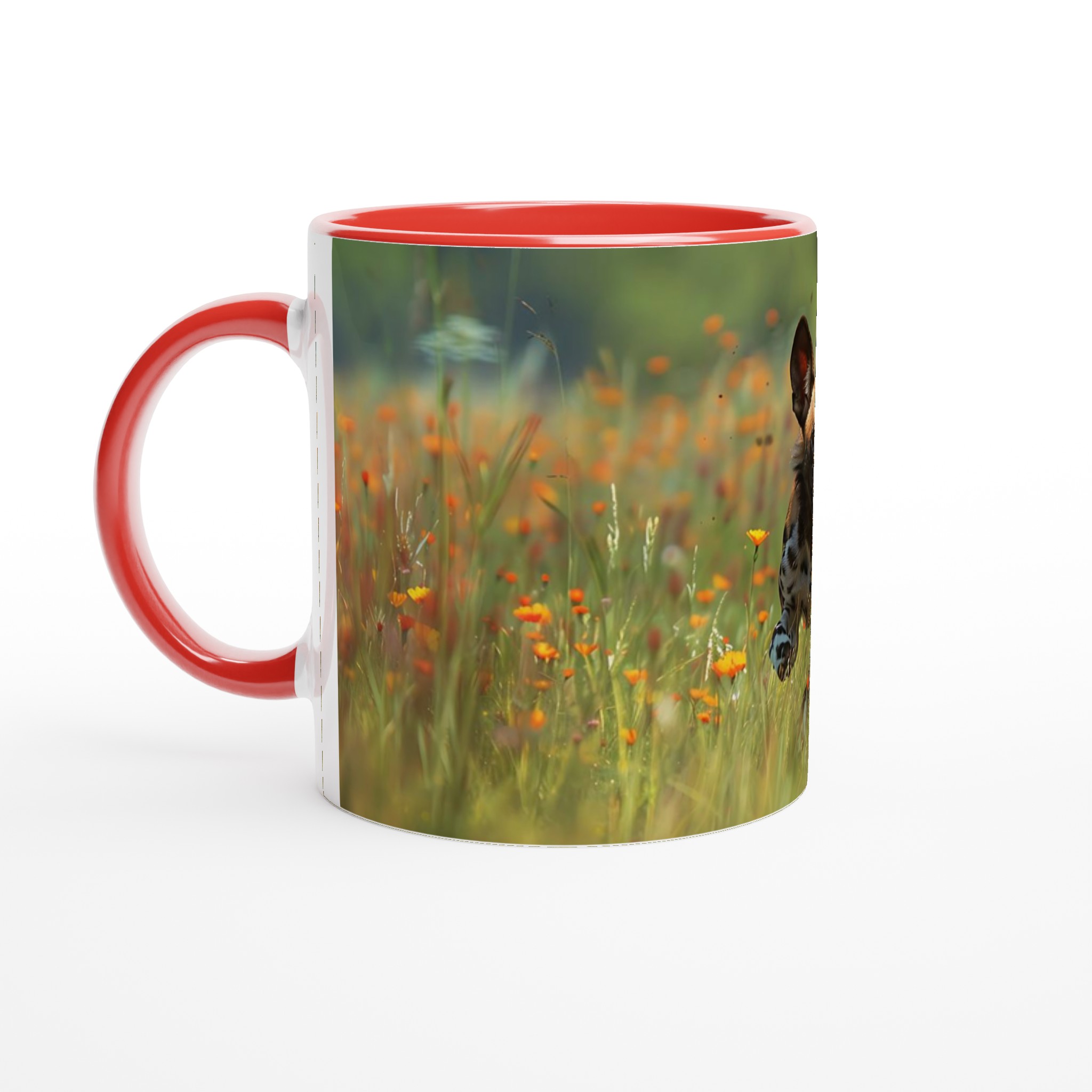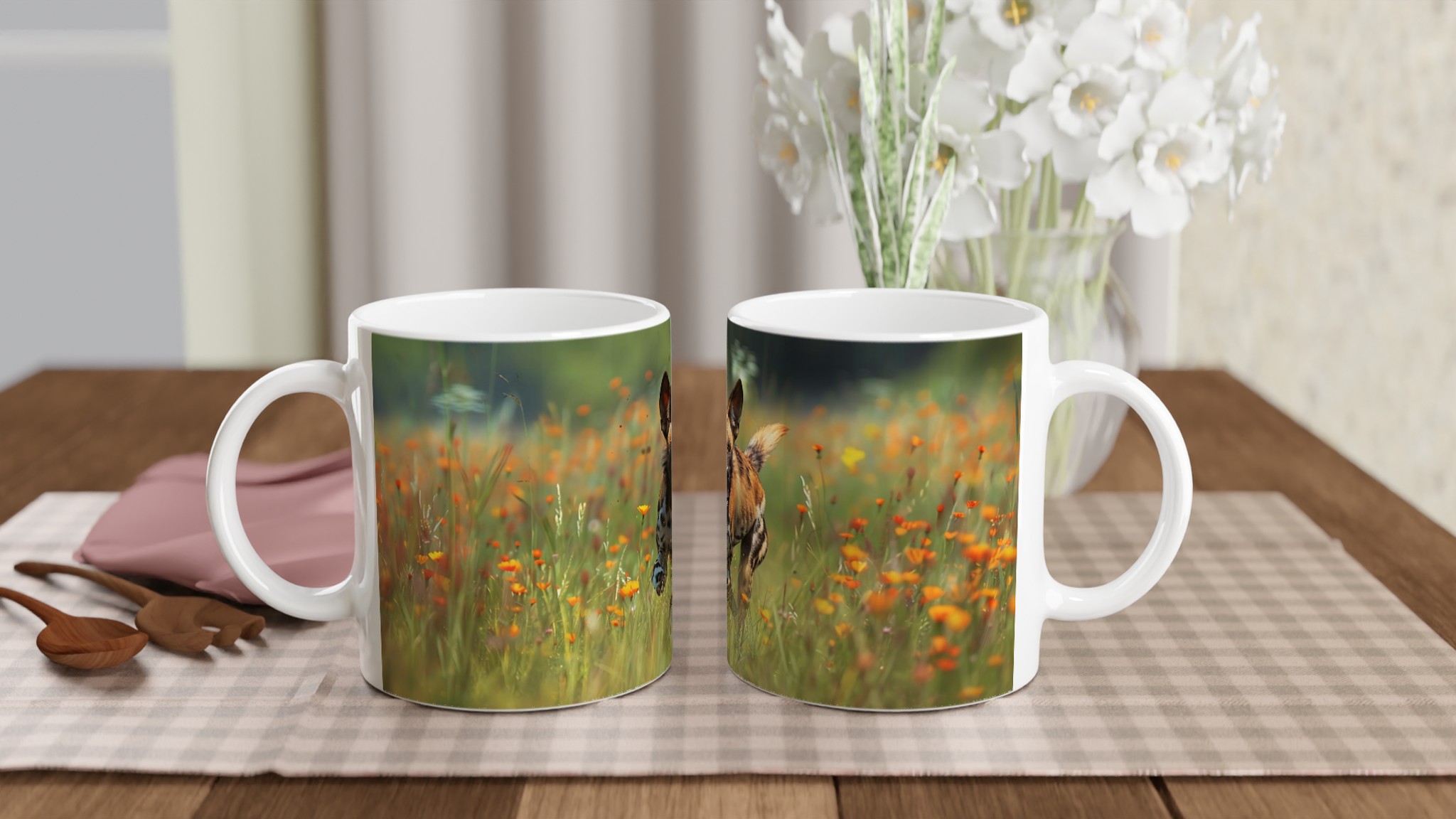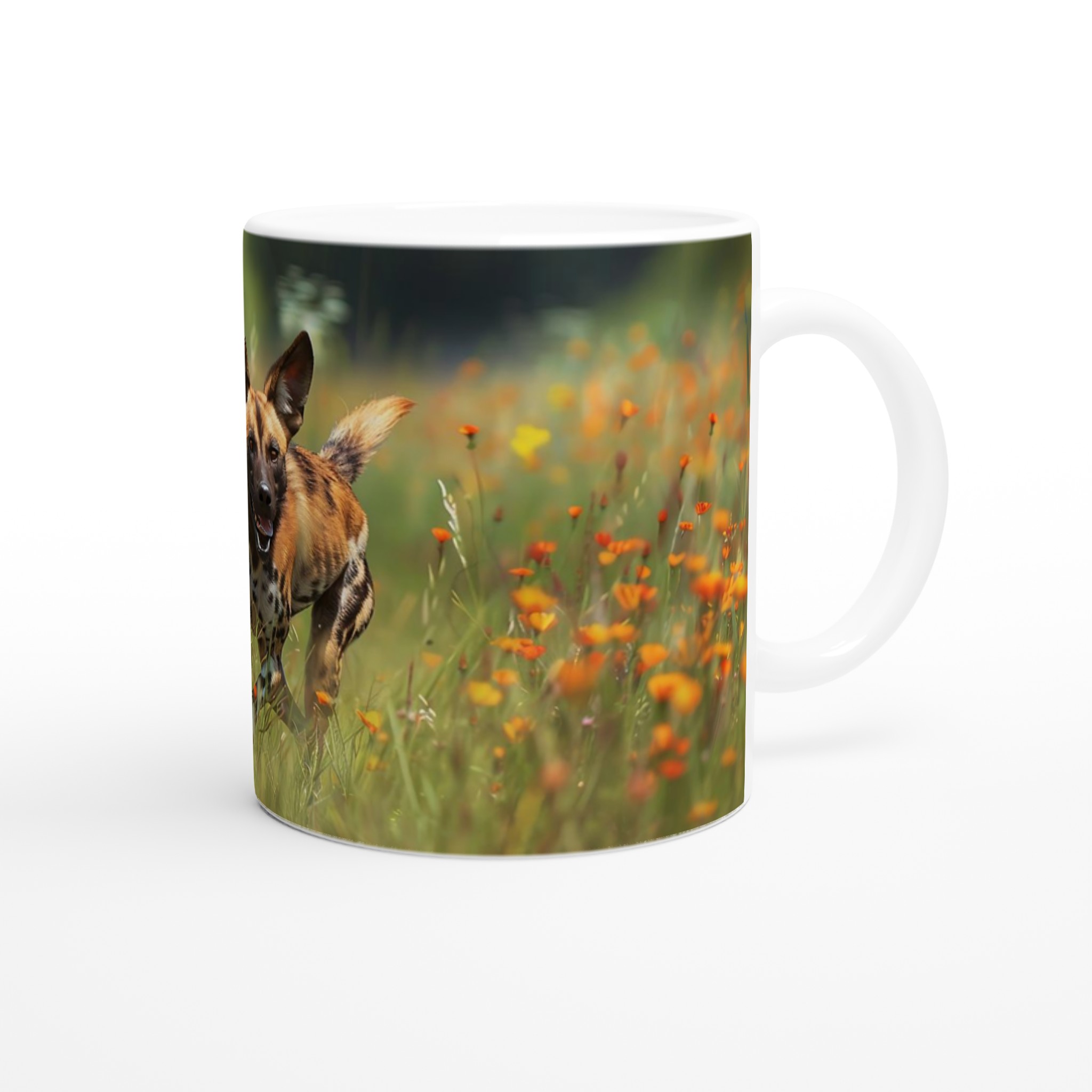 Den blanka ytan säkerställer att trycket av den springande vildhunden, omgiven av orangea och gula vårblommor, framhävs med klara och levande färger. Dessa färger och den djärva designen håller sig fina även efter många turer i mikron och diskmaskinen, vilket garanterar att dina vildmarksdrömmar håller i längden.