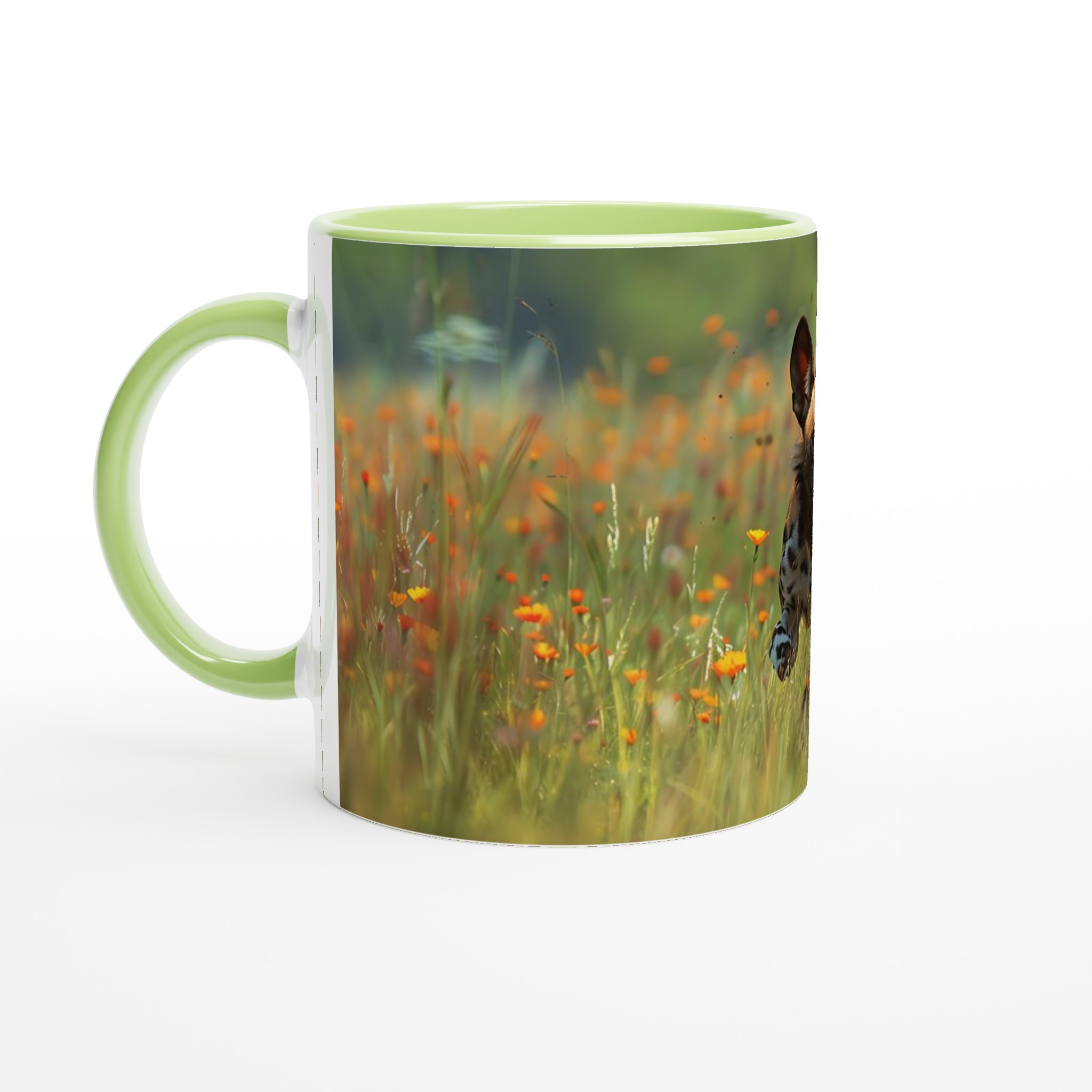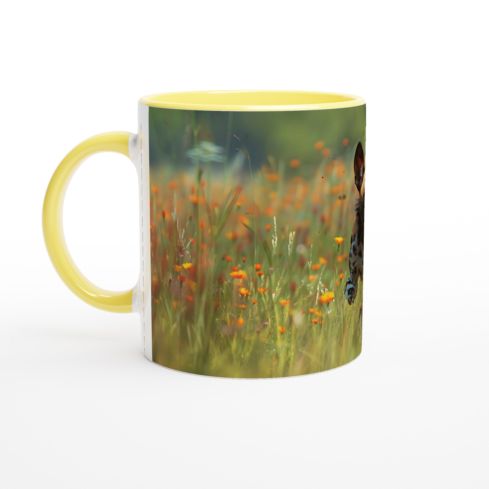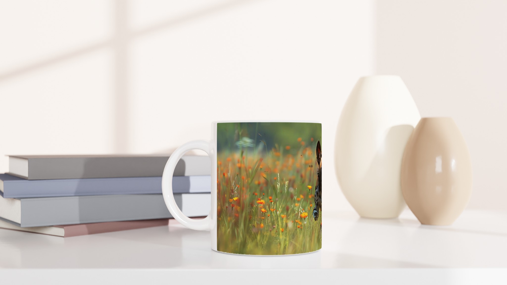 Den blanka ytan säkerställer att trycket av den springande vildhunden, omgiven av orangea och gula vårblommor, framhävs med klara och levande färger. Dessa färger och den djärva designen håller sig fina även efter många turer i mikron och diskmaskinen, vilket garanterar att dina vildmarksdrömmar håller i längden.