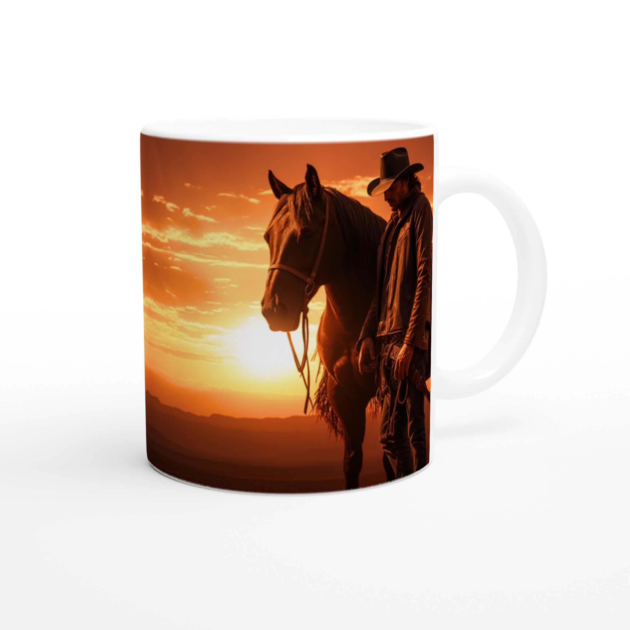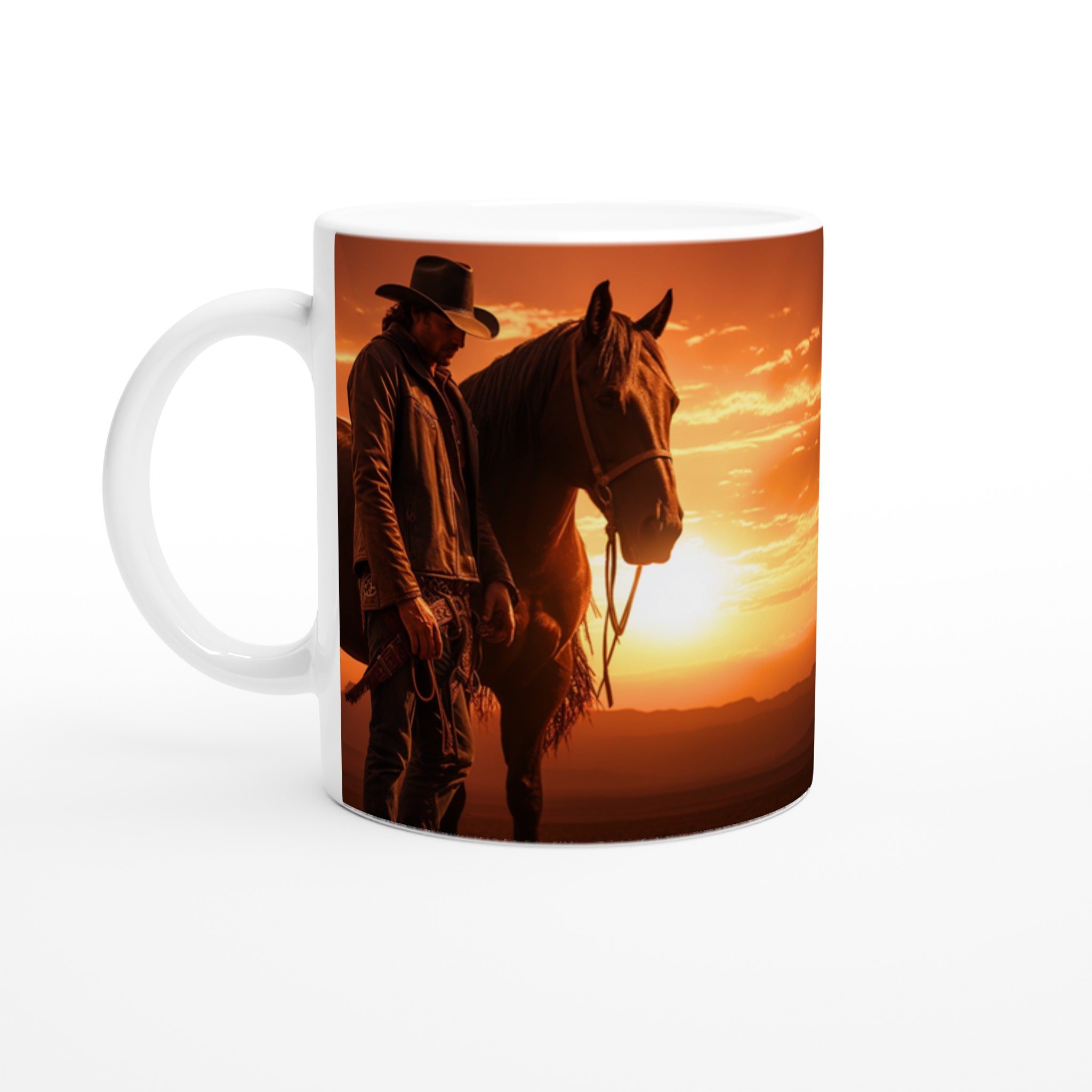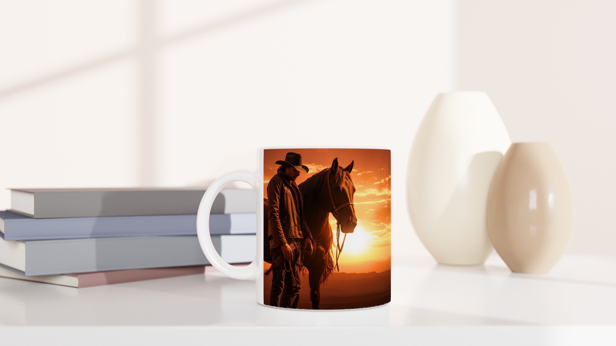Förvandla varje kaffepaus till ett episkt vilda västern-äventyr med vår exklusiva keramiska mugg. Föreställ dig den storslagna solnedgången över prärien, en ensam cowboy och hans trogna häst – nu kan du omfamna den friheten varje dag. Denna mugg är inte bara en behållare för din favoritdryck, den är en portal till äventyr, där varje klunk tar dig närmare horisonten. Dess högglansiga yta lyfter fram de varma tonerna i trycket och bevarar dess skönhet genom otaliga mikrovågs- och diskmaskinsturer.