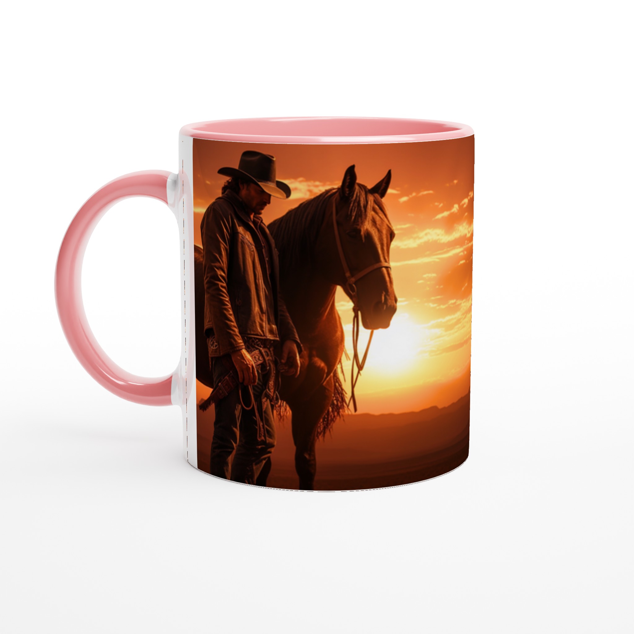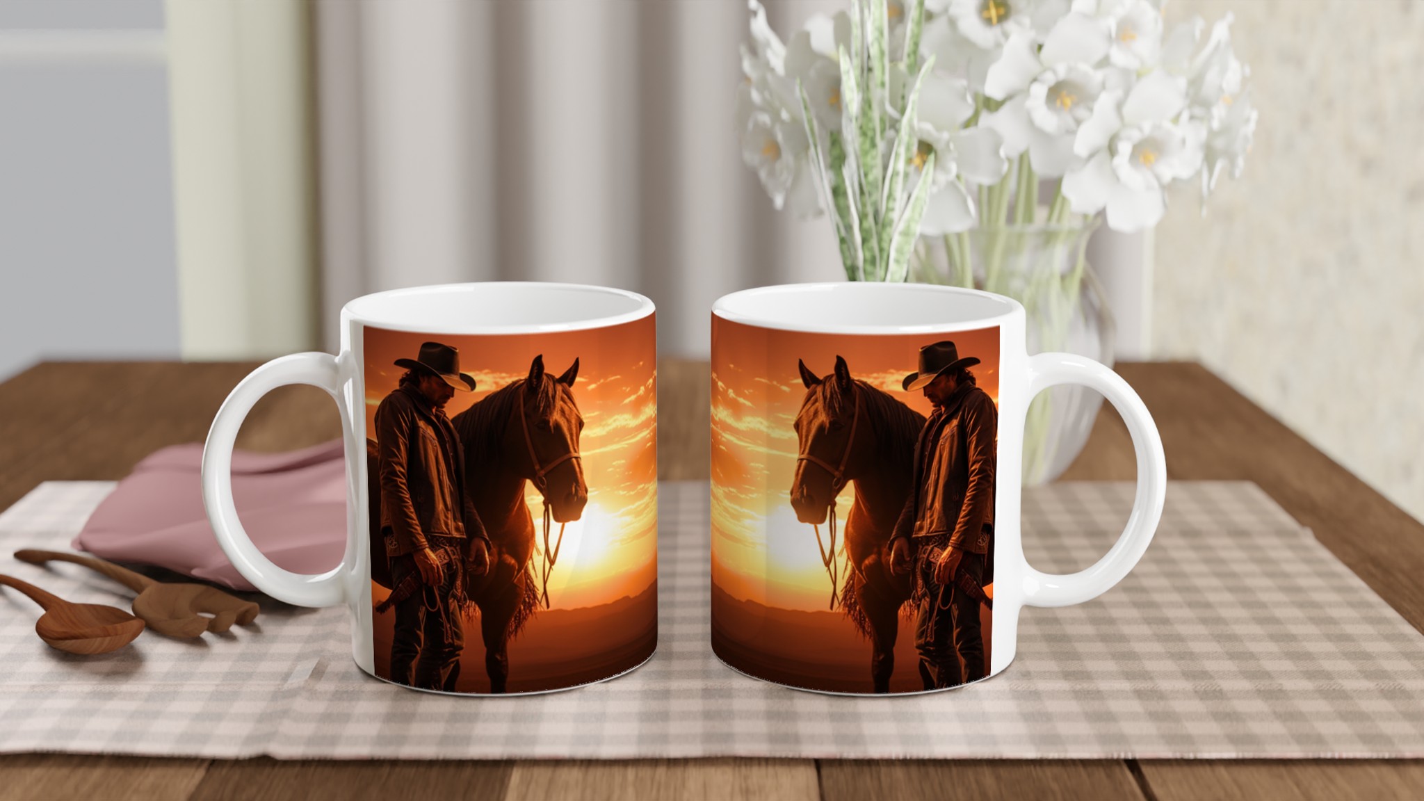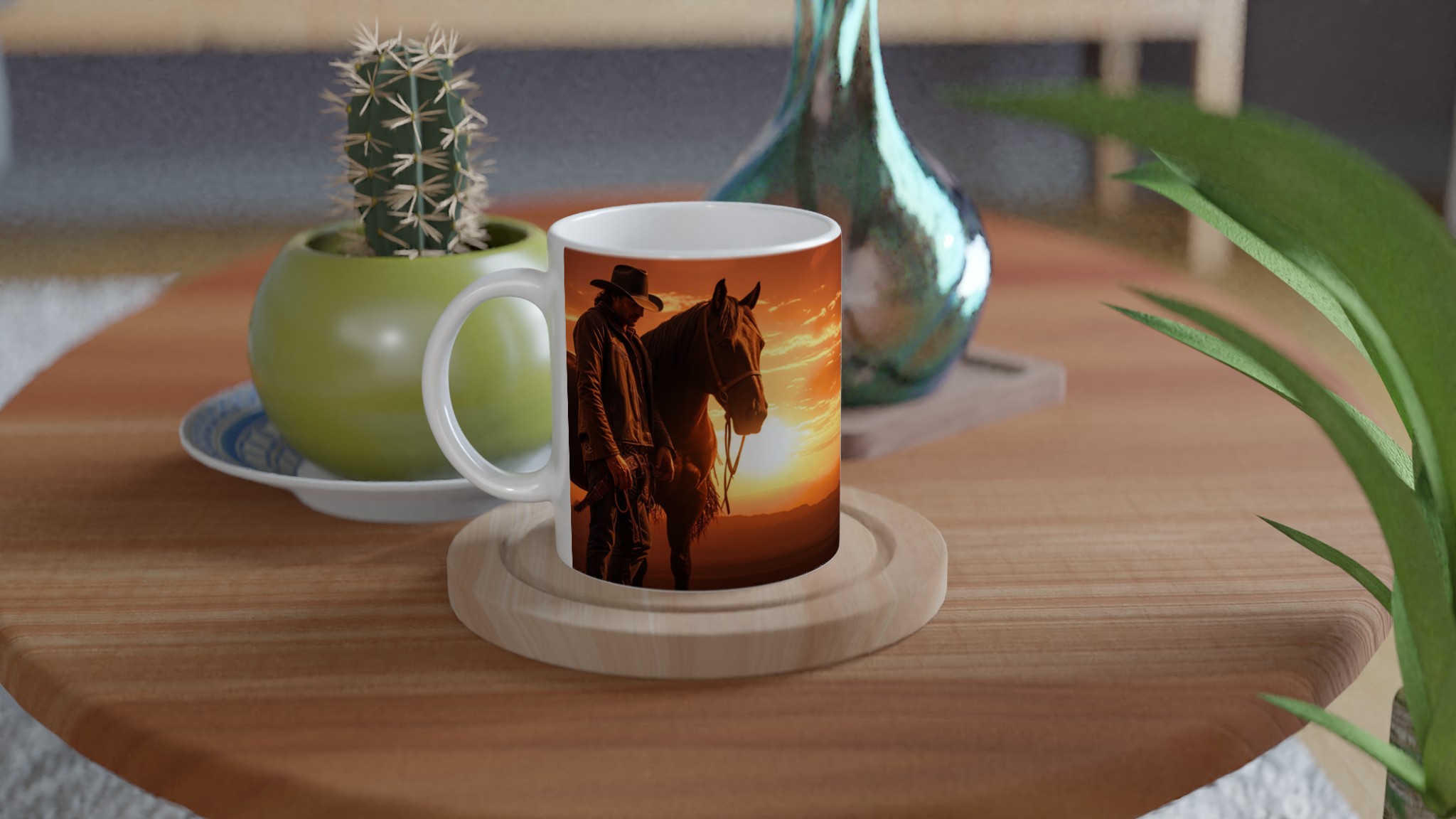 Förvandla varje kaffepaus till ett episkt vilda västern-äventyr med vår exklusiva keramiska mugg. Föreställ dig den storslagna solnedgången över prärien, en ensam cowboy och hans trogna häst – nu kan du omfamna den friheten varje dag. Denna mugg är inte bara en behållare för din favoritdryck, den är en portal till äventyr, där varje klunk tar dig närmare horisonten. Dess högglansiga yta lyfter fram de varma tonerna i trycket och bevarar dess skönhet genom otaliga mikrovågs- och diskmaskinsturer.