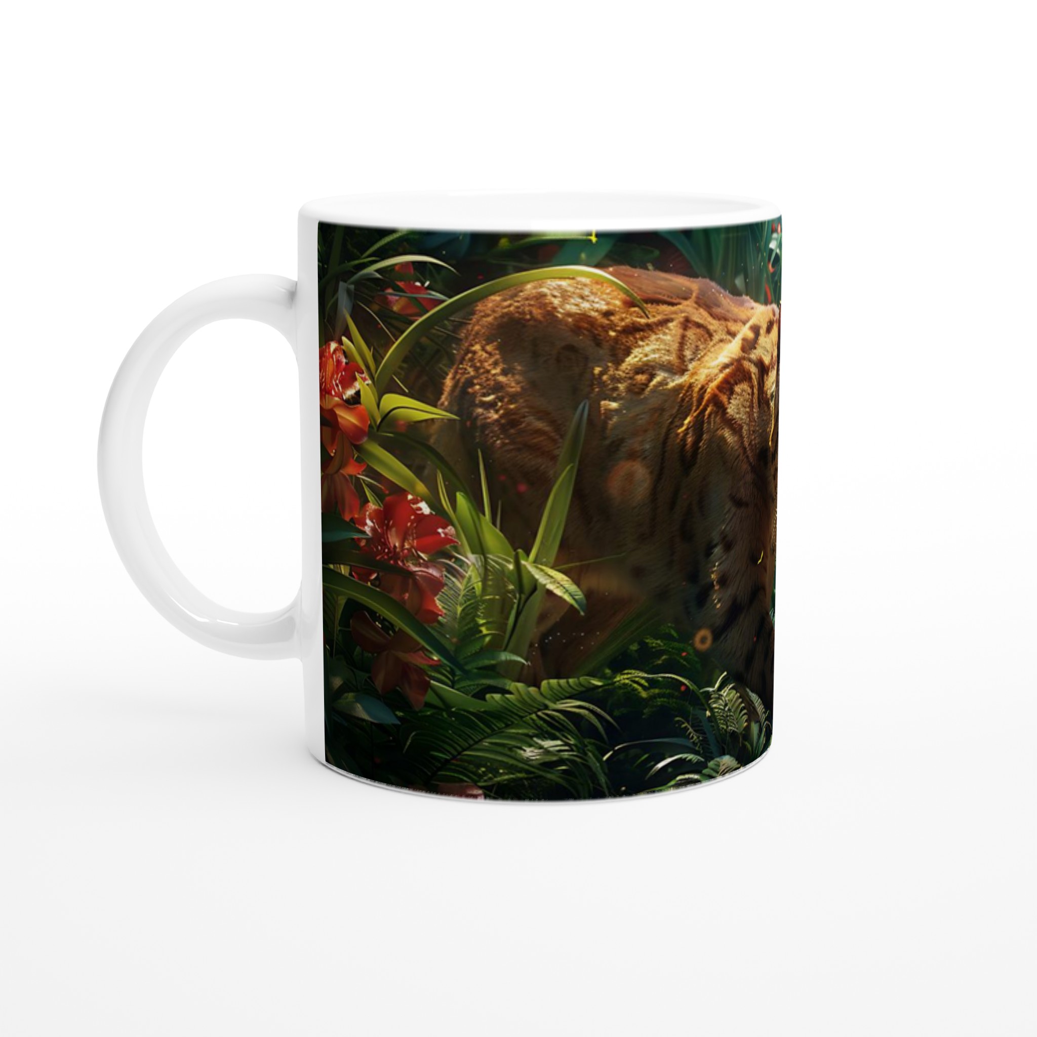 Fånga vildmarkens lockelse varje gång du tar en klunk med denna fängslande keramiska mugg. Motivet av en majestätisk vildkatt smygandes genom en frodig djungel, med levande lövverk och exotiska blommor, förvandlar varje fikapaus till en mini-expedition. Den rika färgpaletten och detaljrikedomen skapar en nästan magisk stämning, perfekt för dig som drömmer om äventyr.