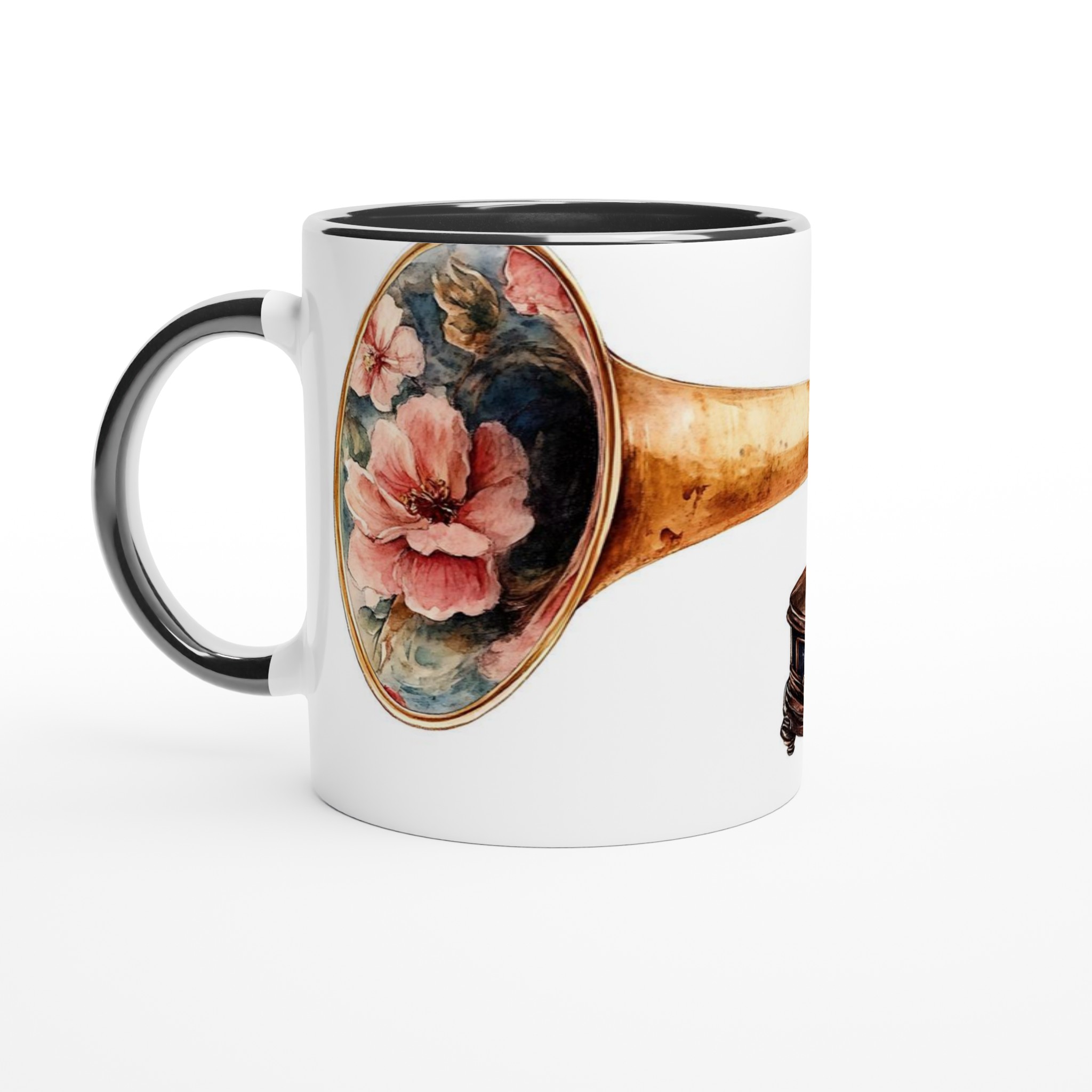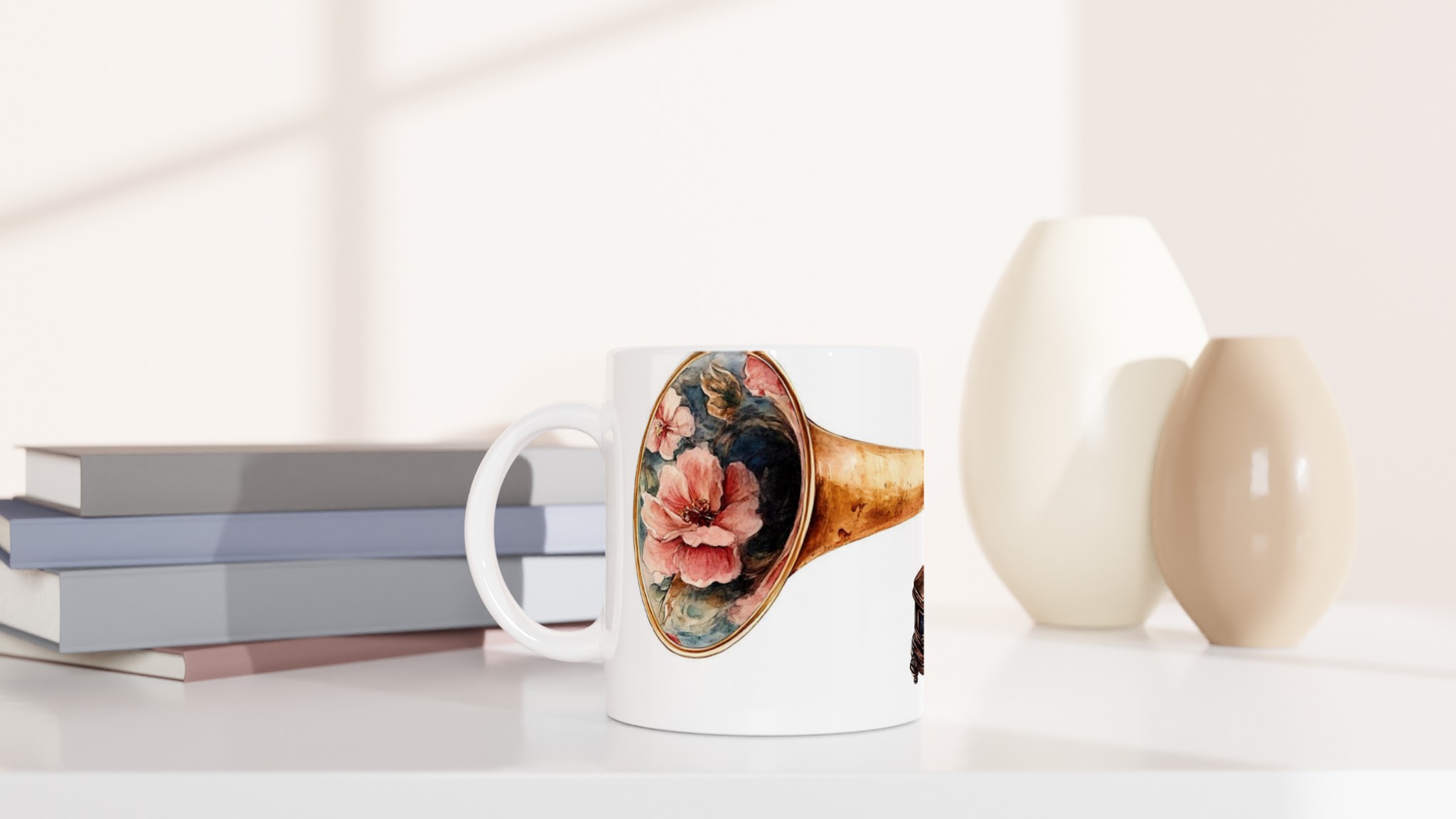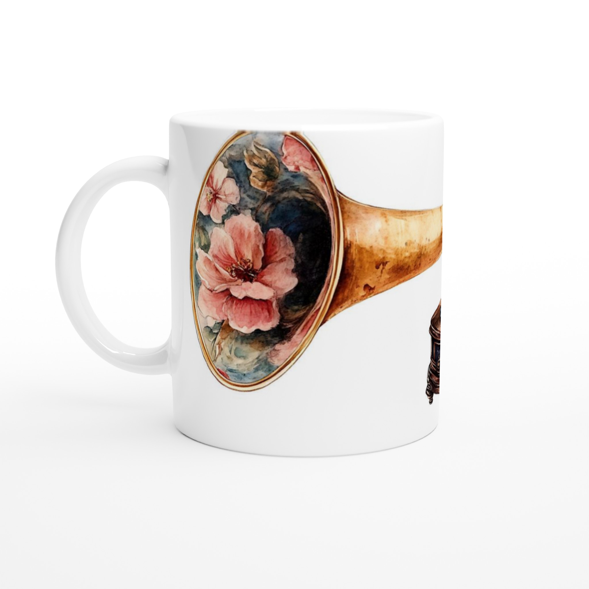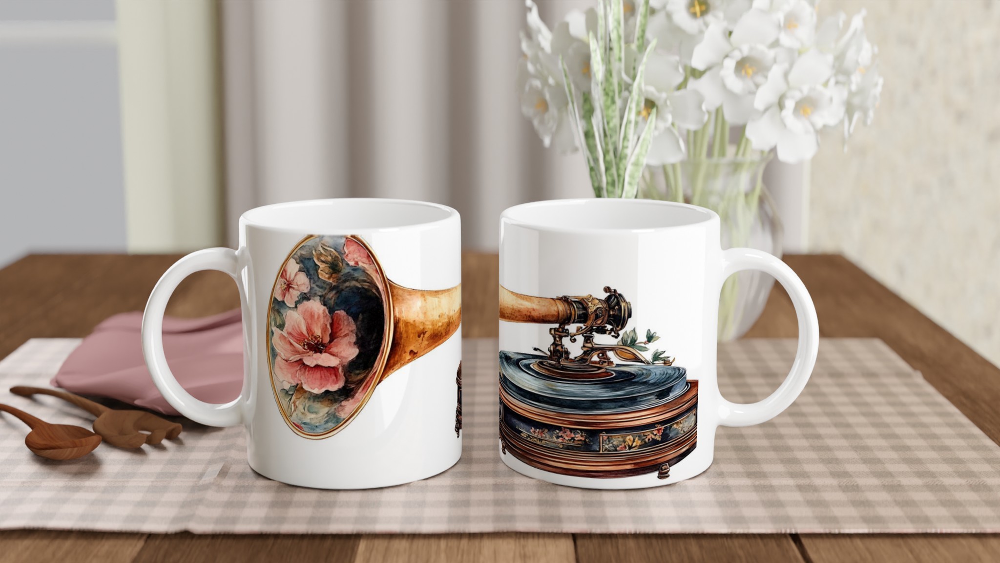 Låt dig förtrollas av en tidlös charm varje gång du tar en klunk. Denna stilrena keramiska mugg, prydd med en utsökt akvarell av en vintage grammofon med blommiga detaljer, blir snabbt en vardagsfavorit. Perfekt för morgonkaffet, kvällens varma choklad eller när du bara vill njuta av en kopp te medan du drömmer dig bort till svunna tider och ljuv musik.