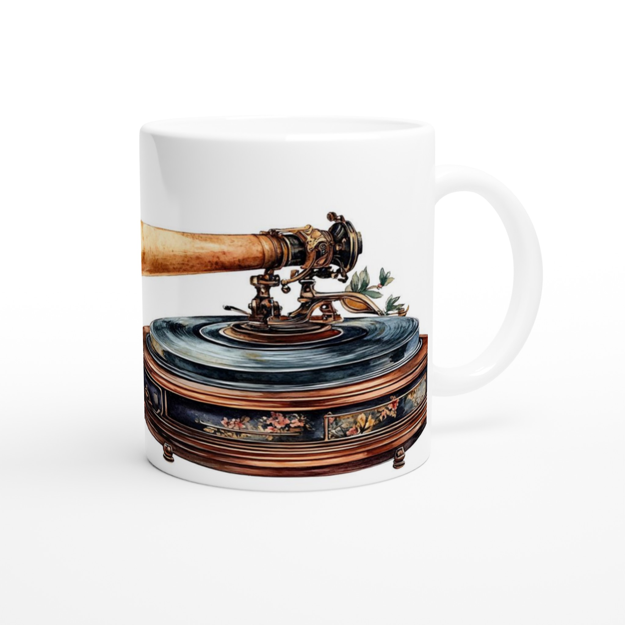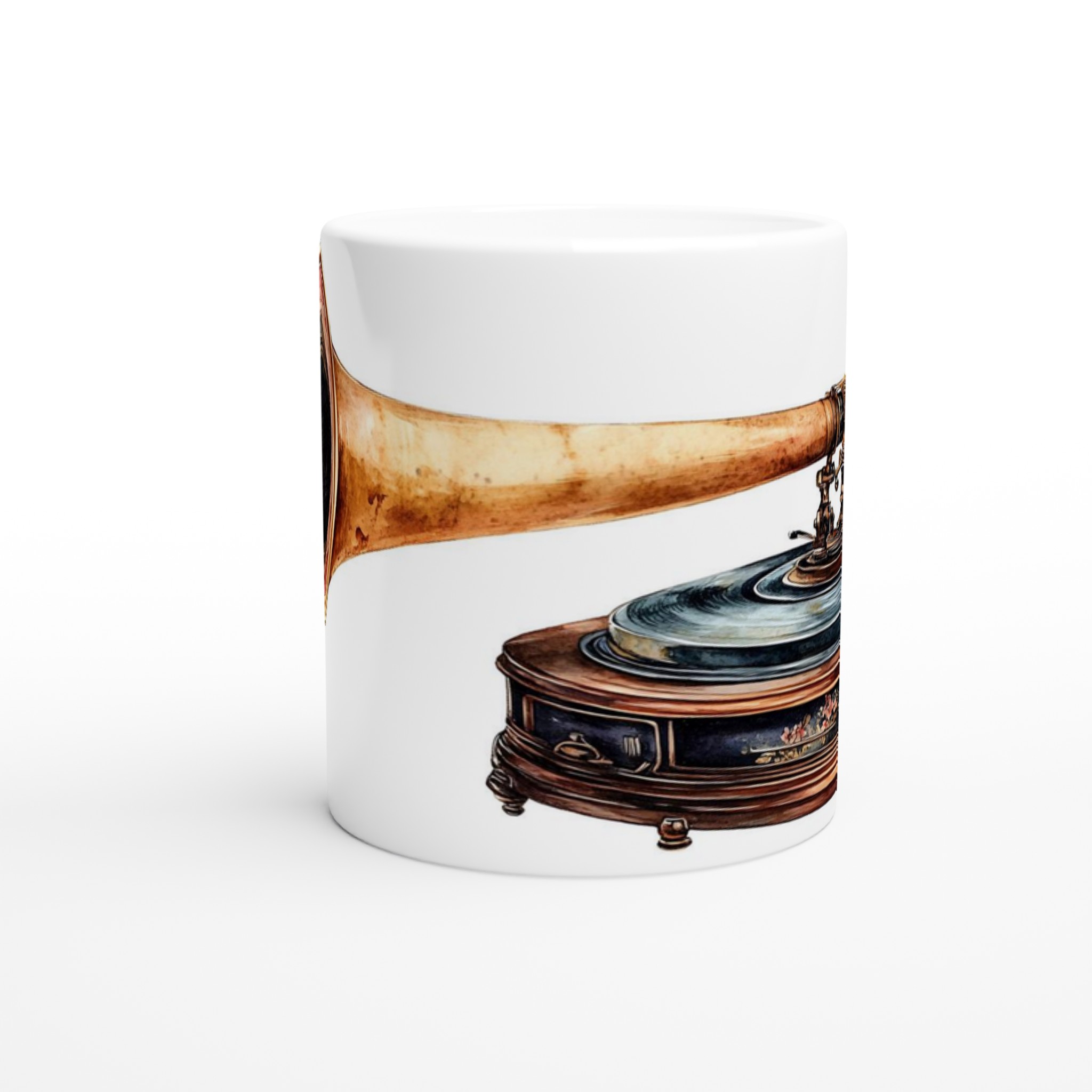Den blanka vita ytan på muggen lyfter fram de drömska färgerna från den akvarellmålade grammofonen, vilket ger ett konstnärligt och inbjudande intryck. Trycken framhävs med klara och levande färger, som håller sig fina även efter många turer i mikron och diskmaskinen, så att du kan njuta av din dagliga dos av nostalgi år efter år.