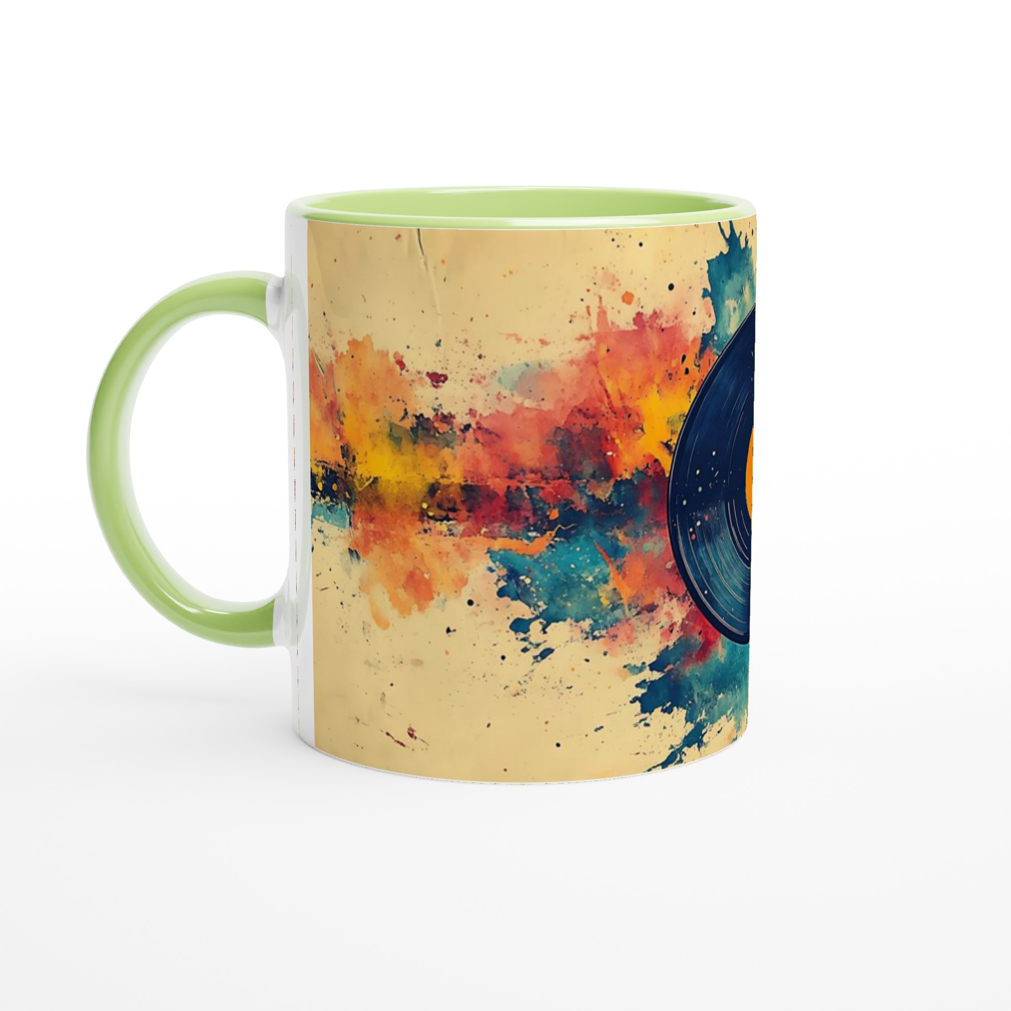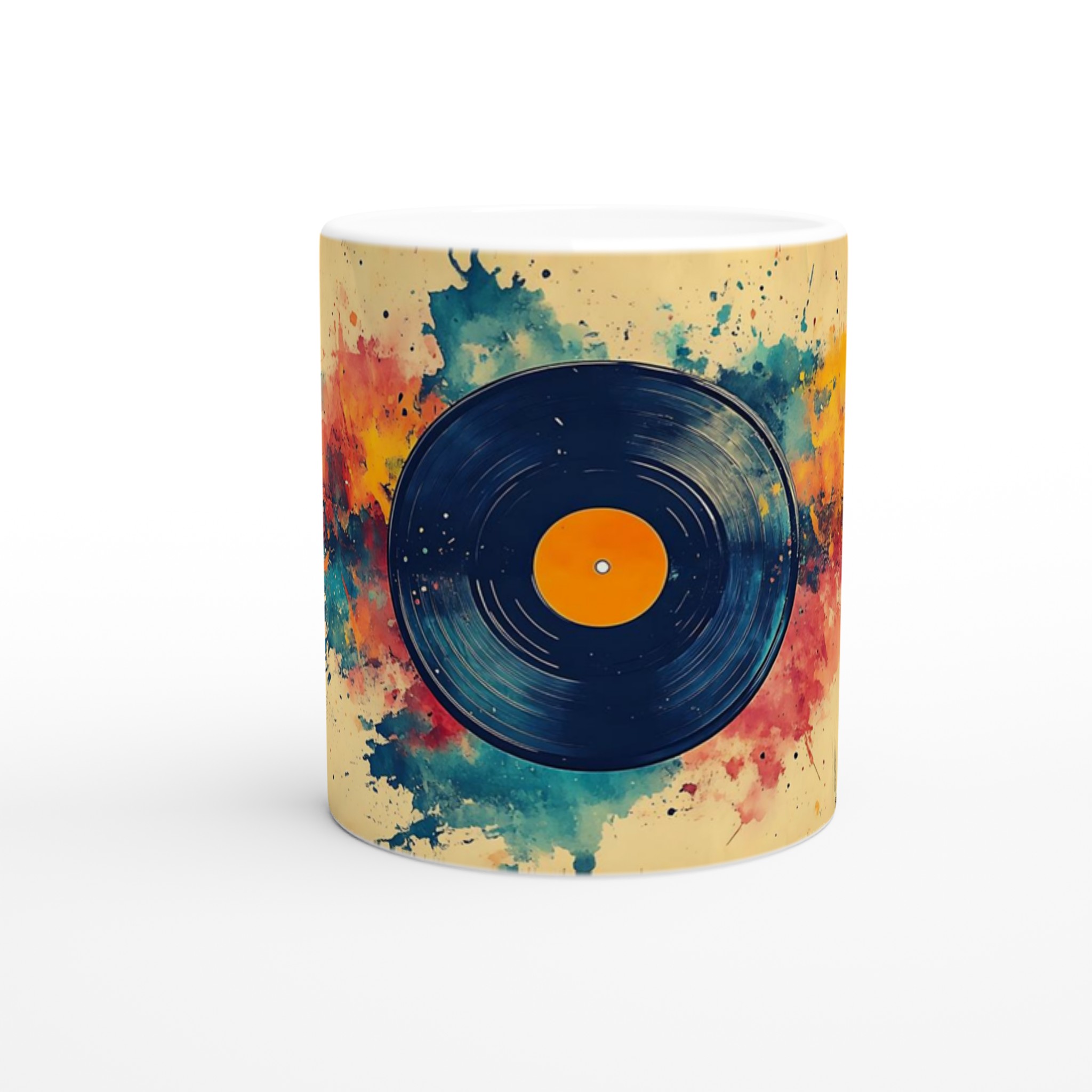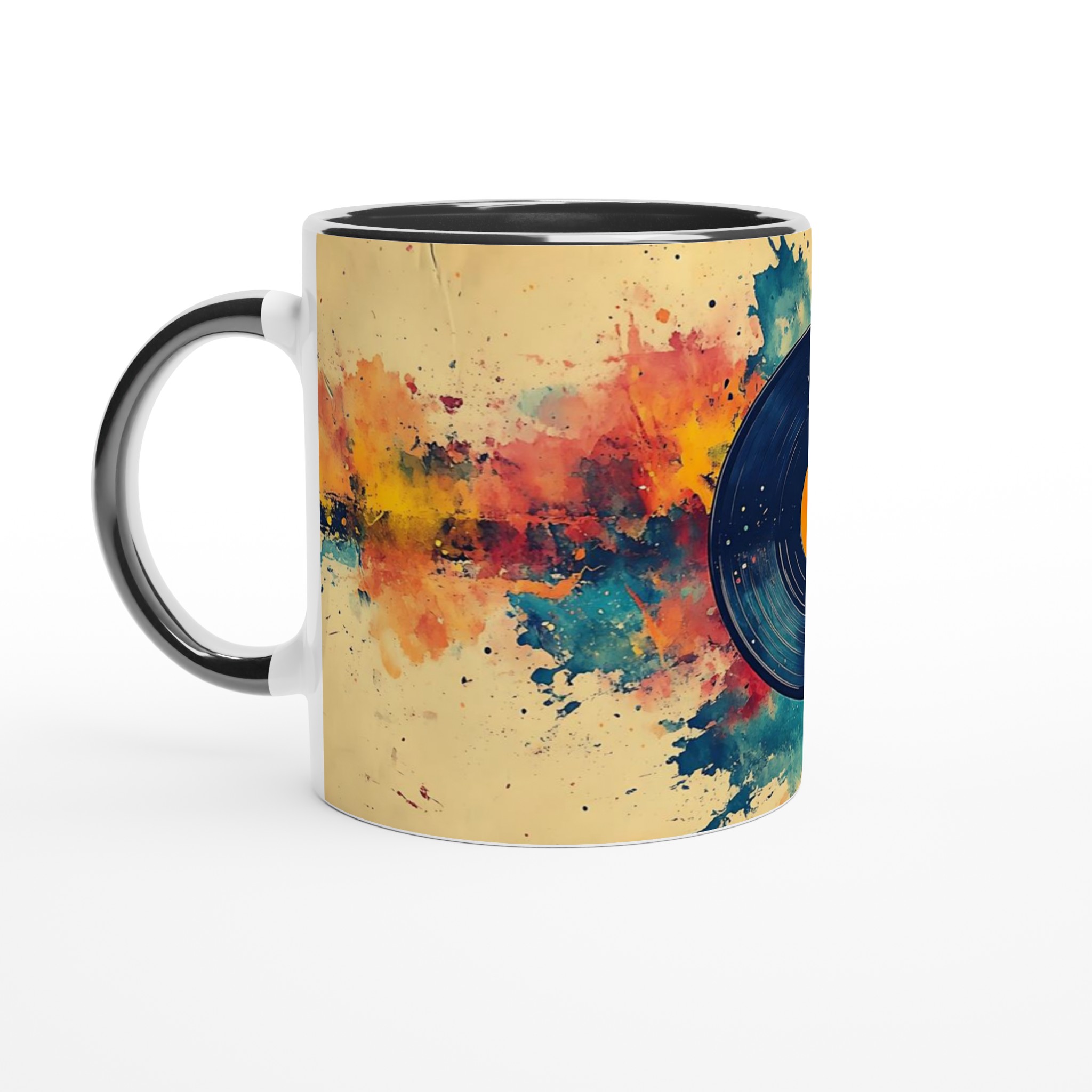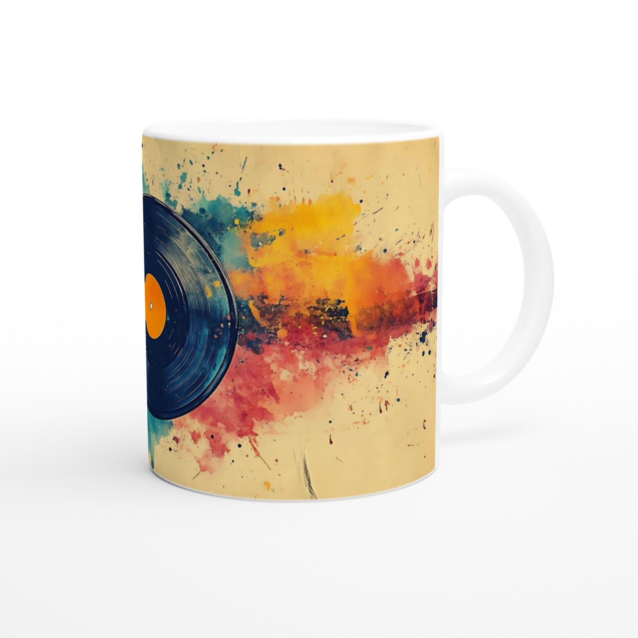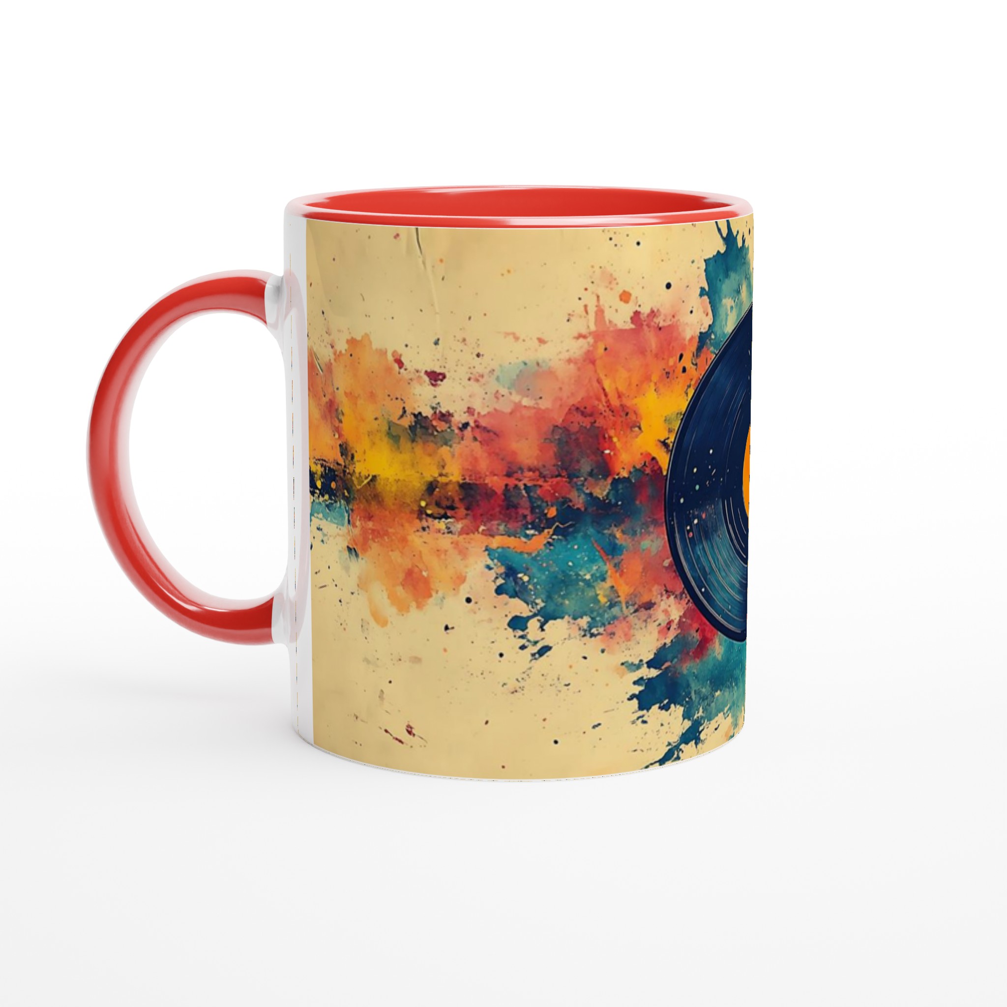 Förvandla din dryckesstund till en konstupplevelse med denna unika keramiska mugg, inspirerad av en levande akvarellexplosion kring en klassisk vinylskiva. Den varma färgpaletten av gult, orange, rött och blått, tillsammans med den konstnärliga stänkdesignen, ger en energisk och kreativ känsla som lyser upp varje dag.