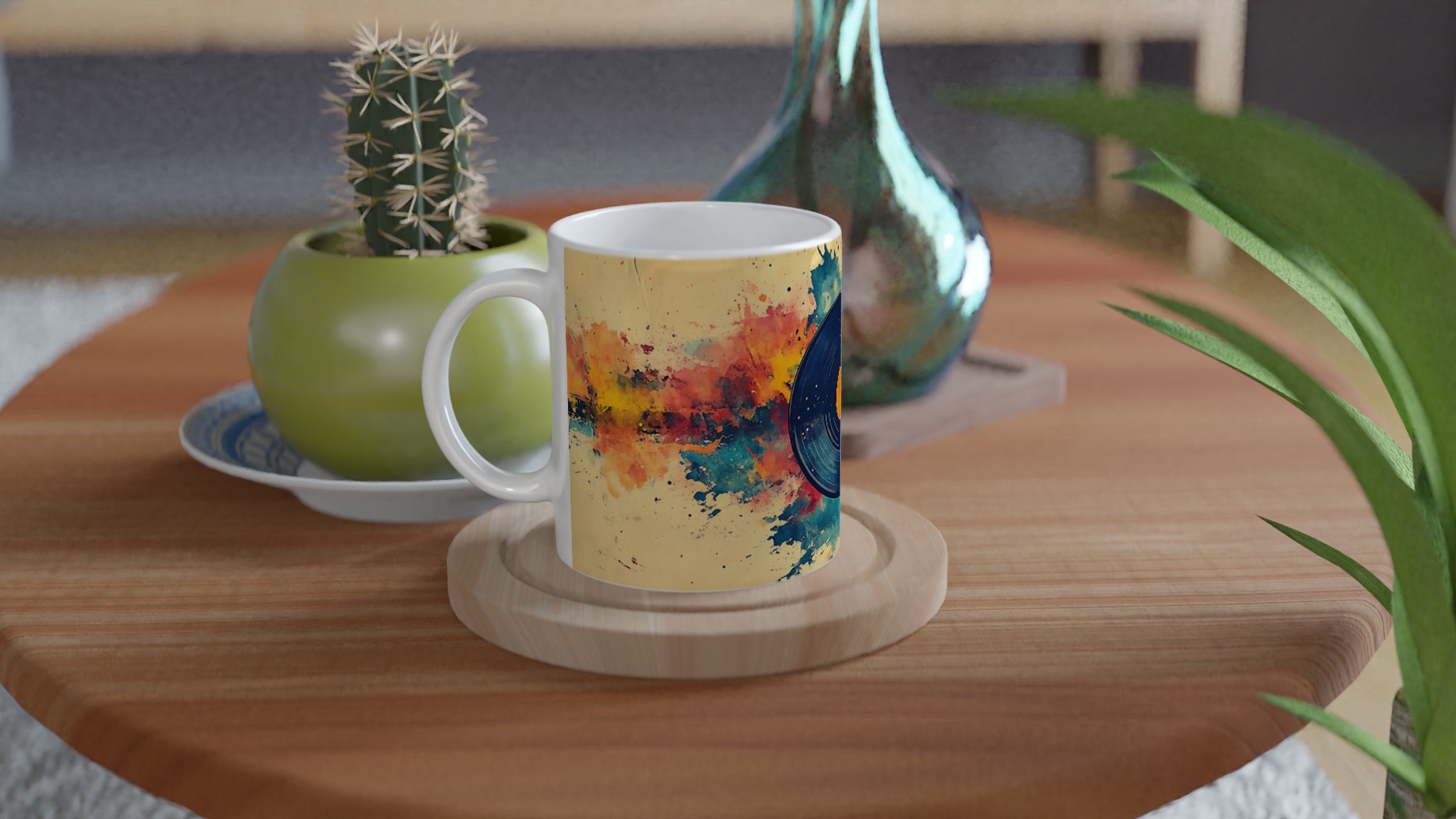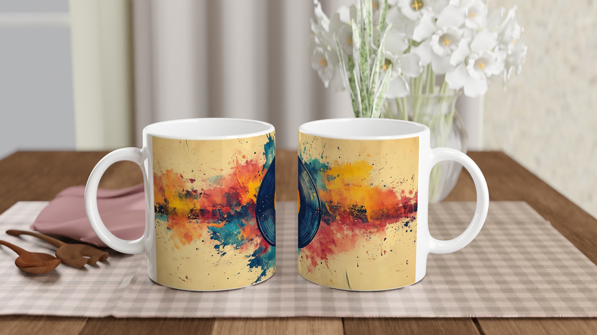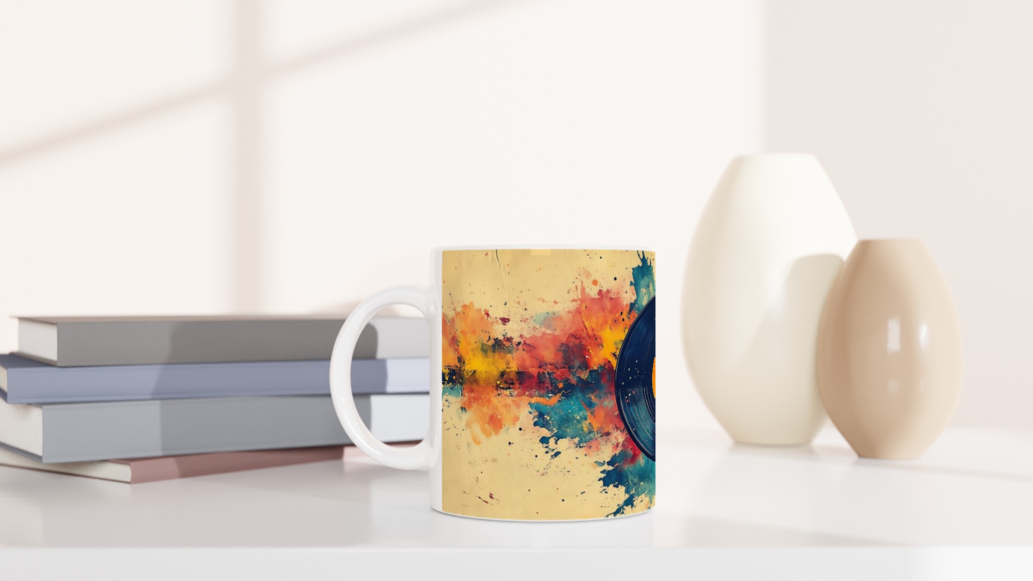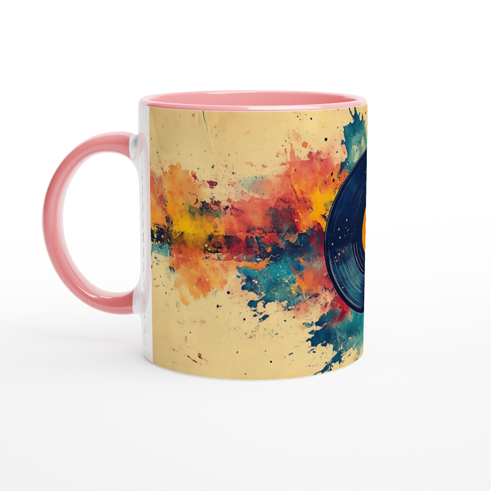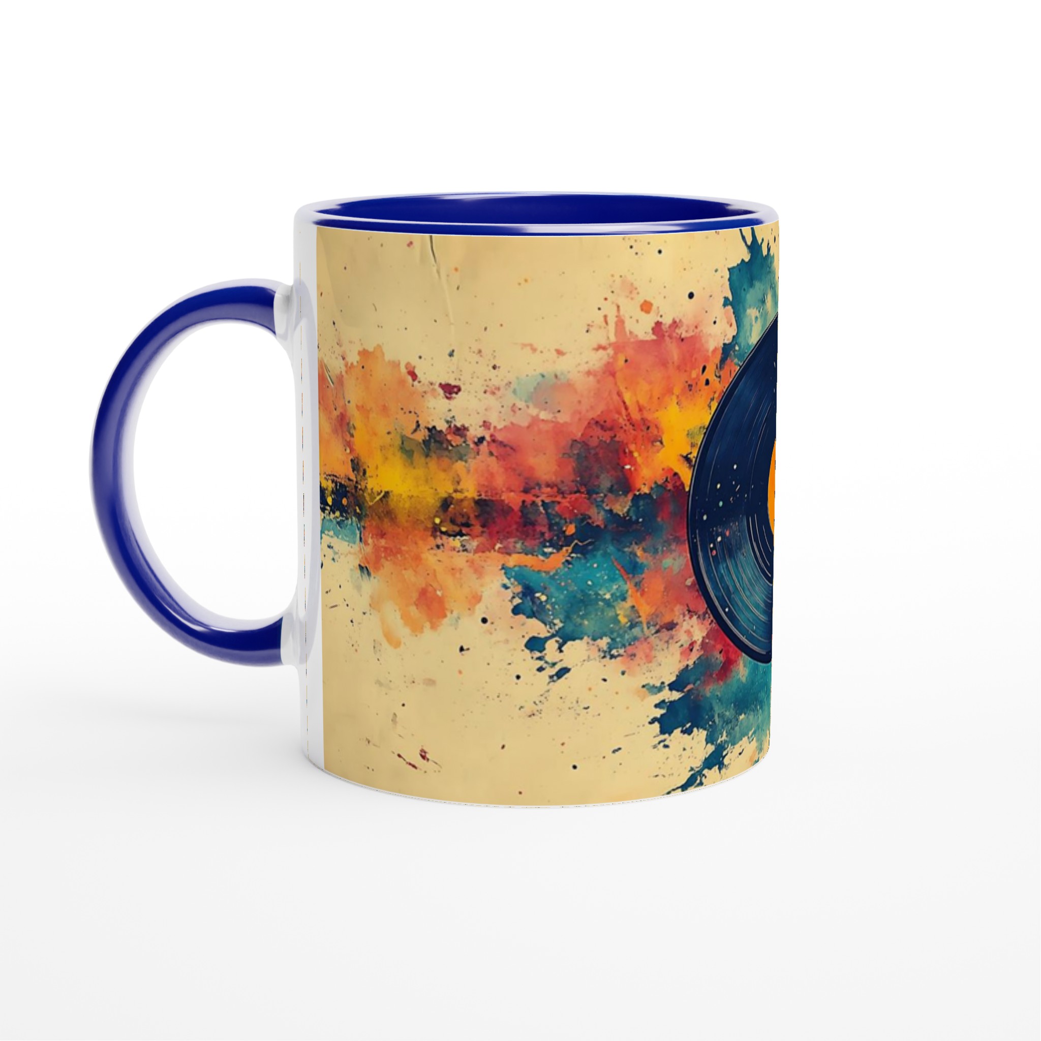 Förvandla din dryckesstund till en konstupplevelse med denna unika keramiska mugg, inspirerad av en levande akvarellexplosion kring en klassisk vinylskiva. Den varma färgpaletten av gult, orange, rött och blått, tillsammans med den konstnärliga stänkdesignen, ger en energisk och kreativ känsla som lyser upp varje dag.