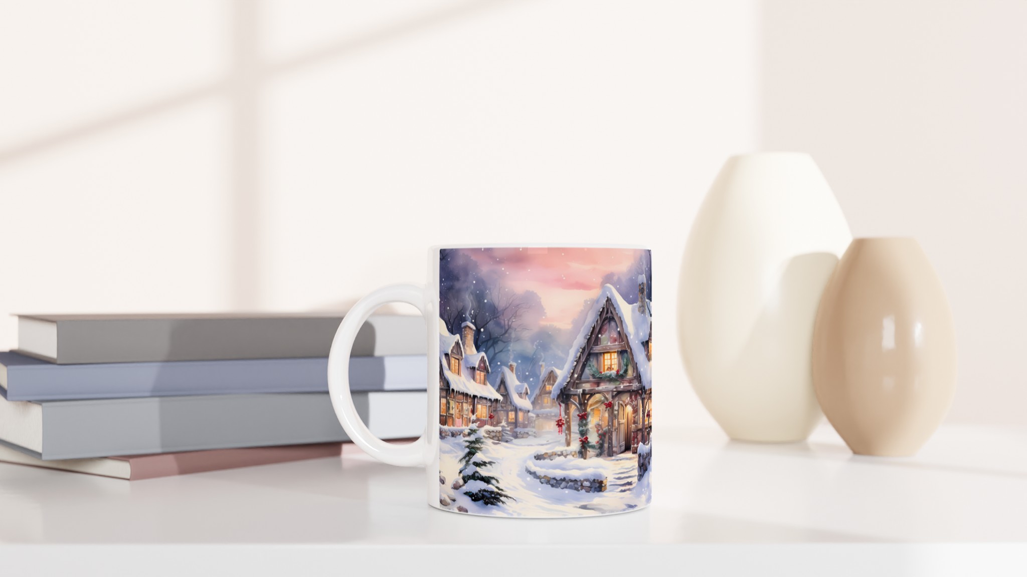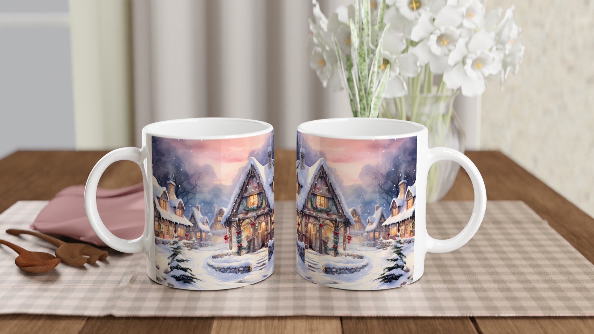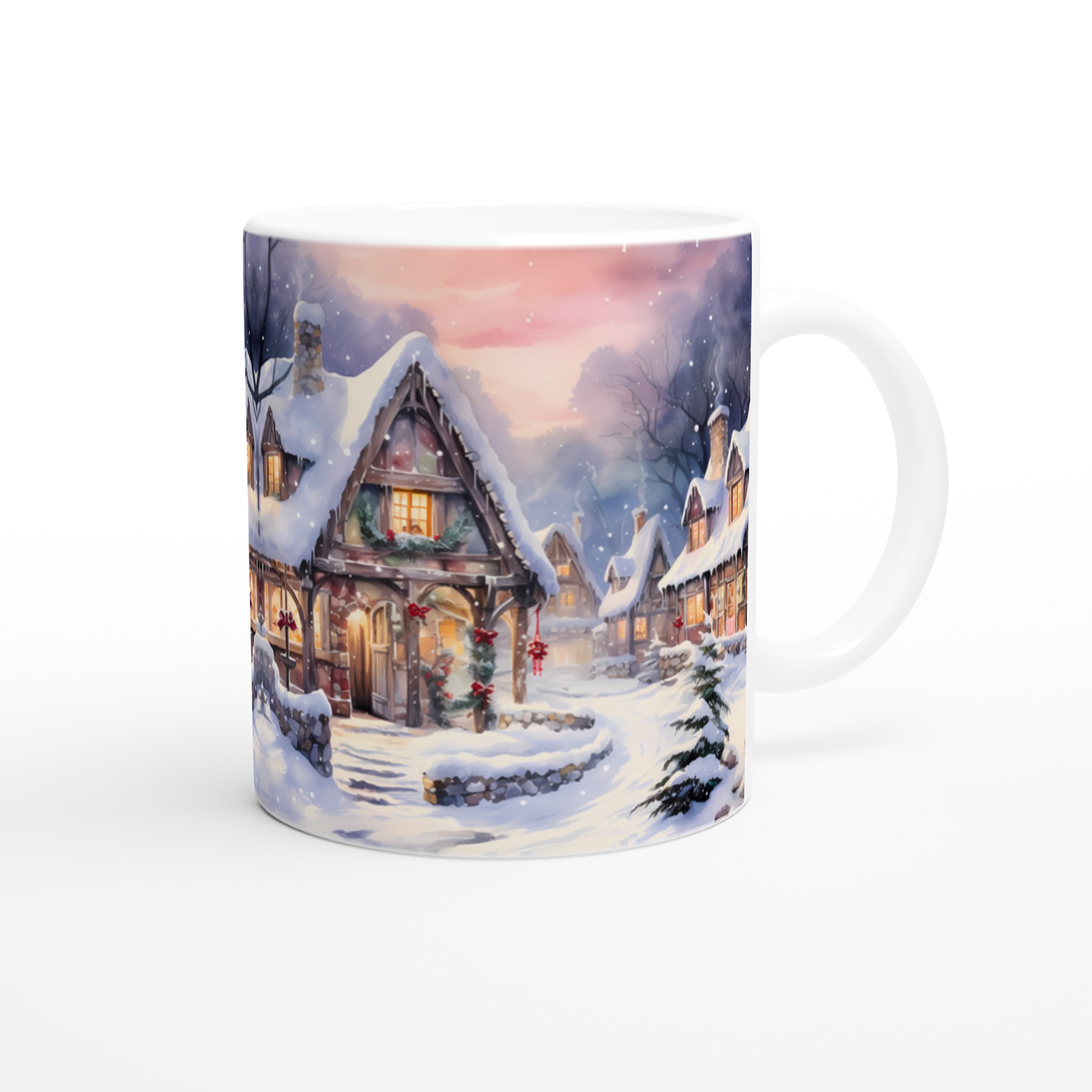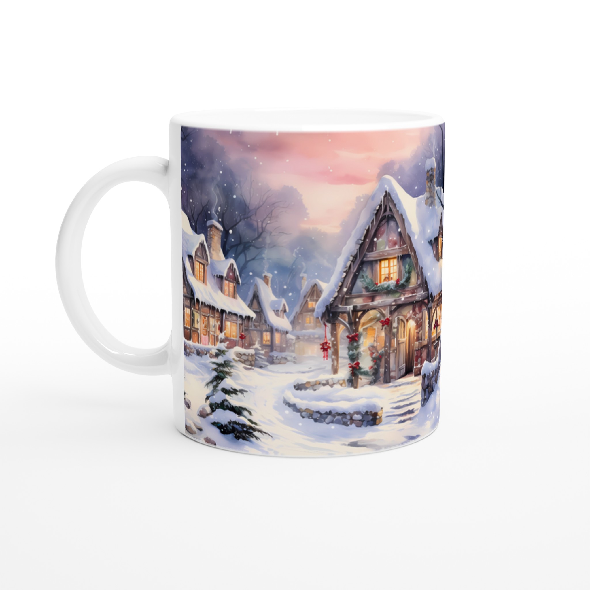 Föreställ dig att du sitter i en mysig stuga, omgiven av snötyngda tak och den varma glöden från fönstren. Den här keramiska muggen fångar den magiska känslan av en vinterdröm med sitt förtrollande julbystmotiv, perfekt för att värma själen under kalla dagar.