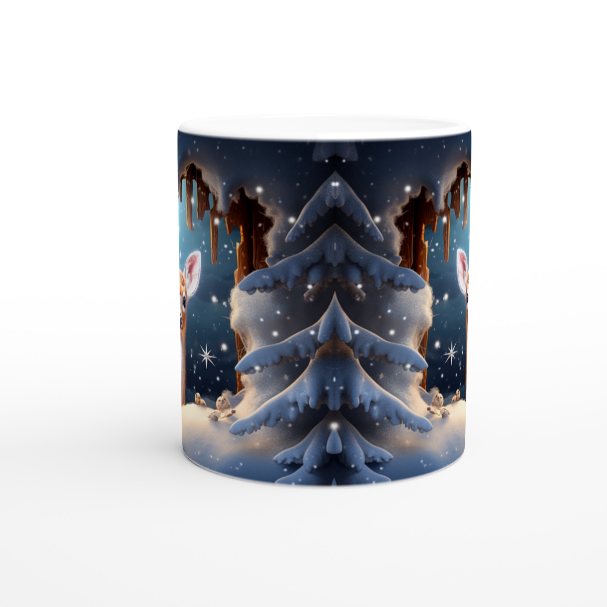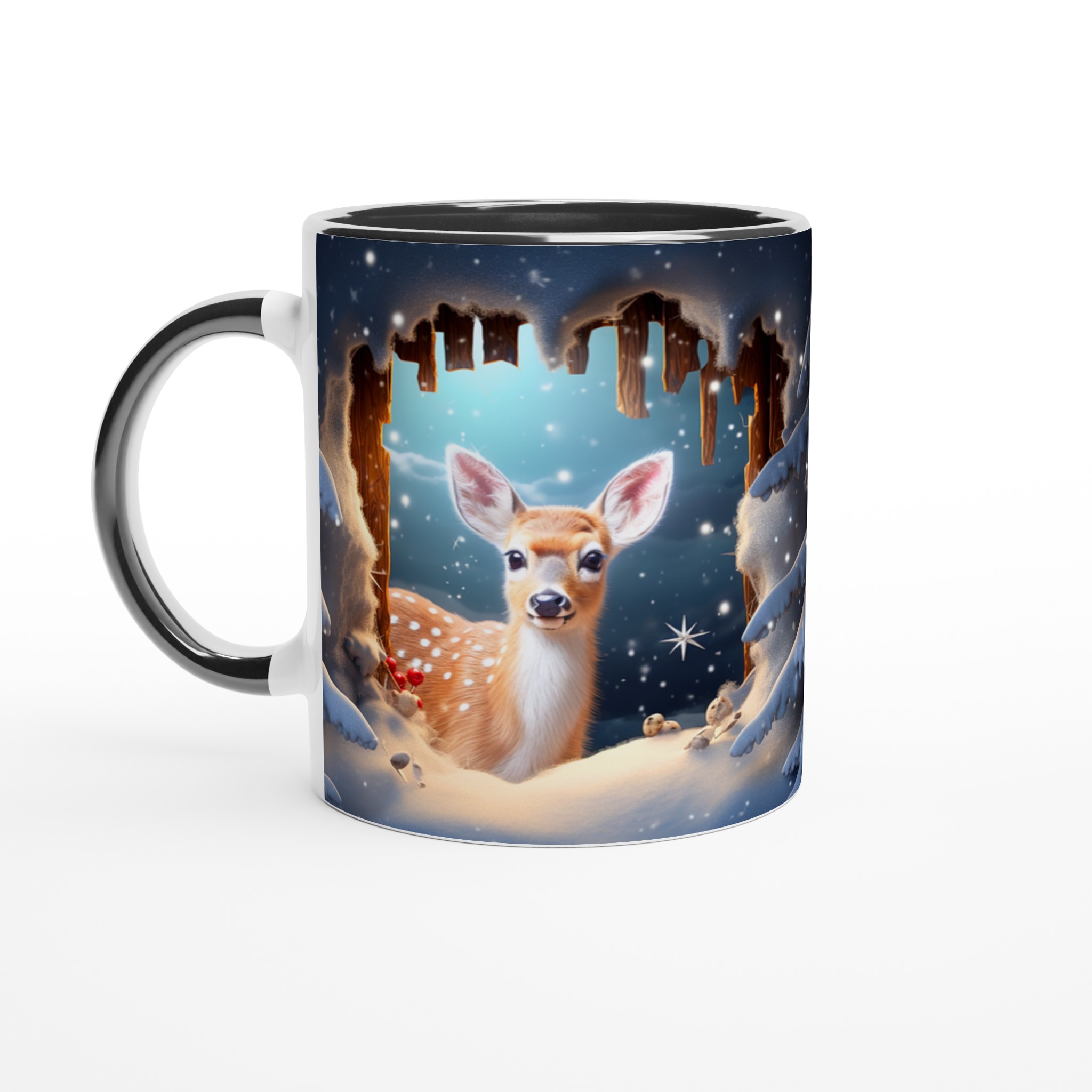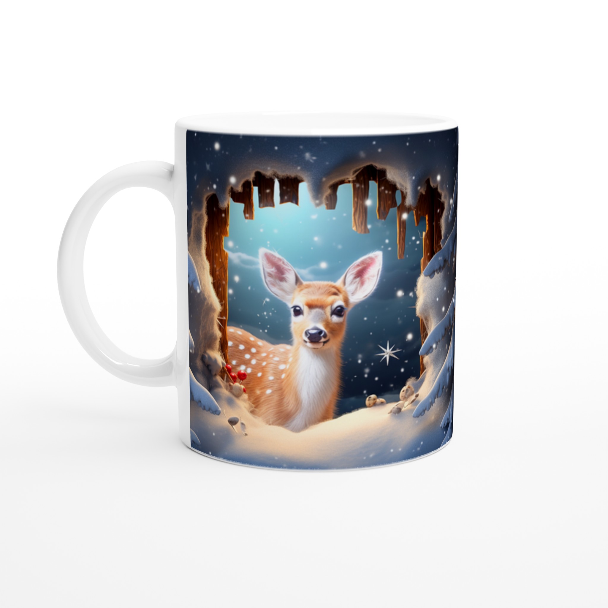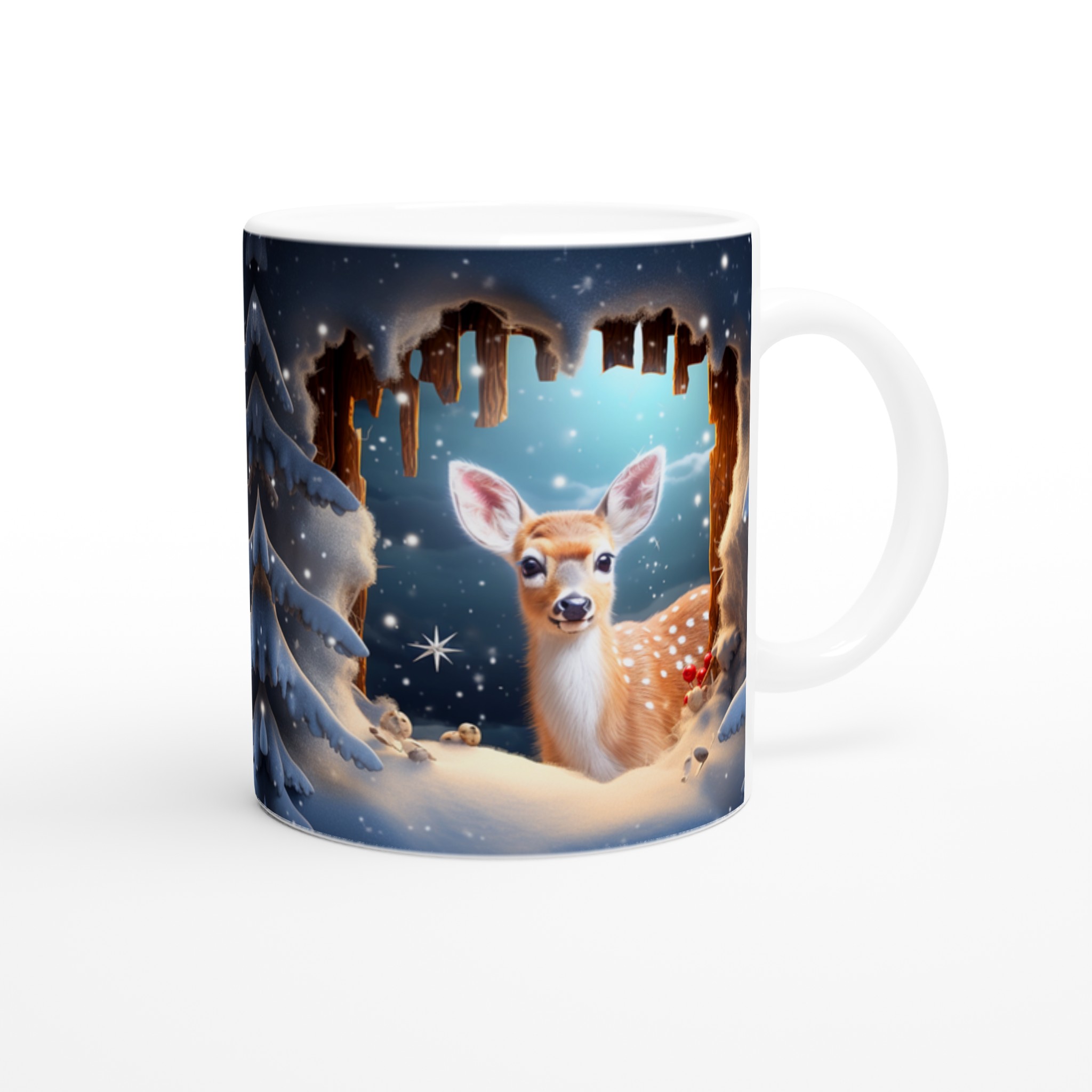 Föreställ dig en mysig vintermorgon, insvept i en filt, med en värmande dryck i din hand. Denna förtrollande keramiska mugg, prydd med ett bedårande vinterrådjur omgivet av snöklädda granar, skapar den perfekta stämningen för alla dina varma favoritdrycker. Perfekt för morgonkaffet, kvällens varma choklad eller när du bara vill njuta av en kopp te. Den blanka ytan framhäver illustrationen med klara och levande färger, som håller sig fina även efter många turer i mikron och diskmaskinen.
