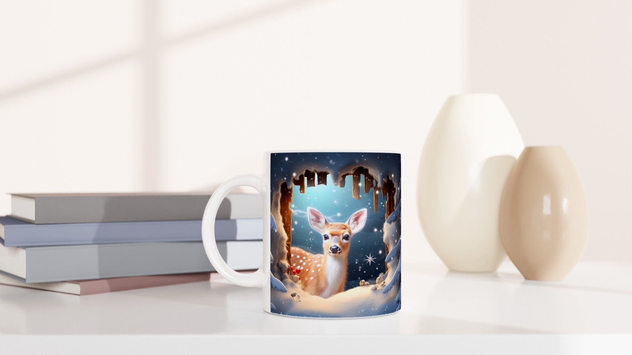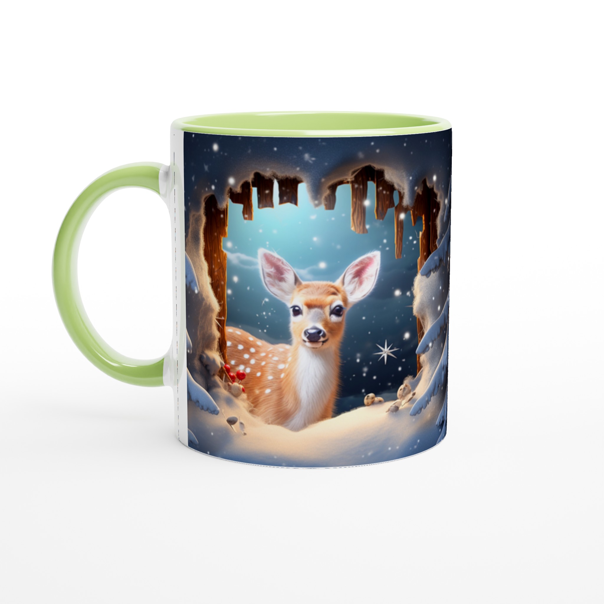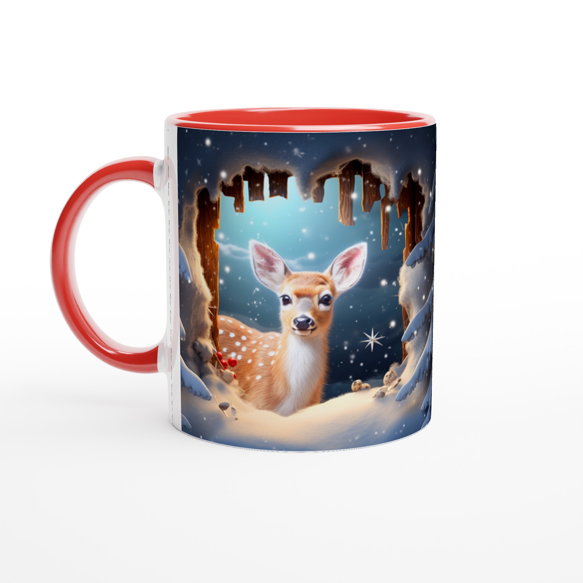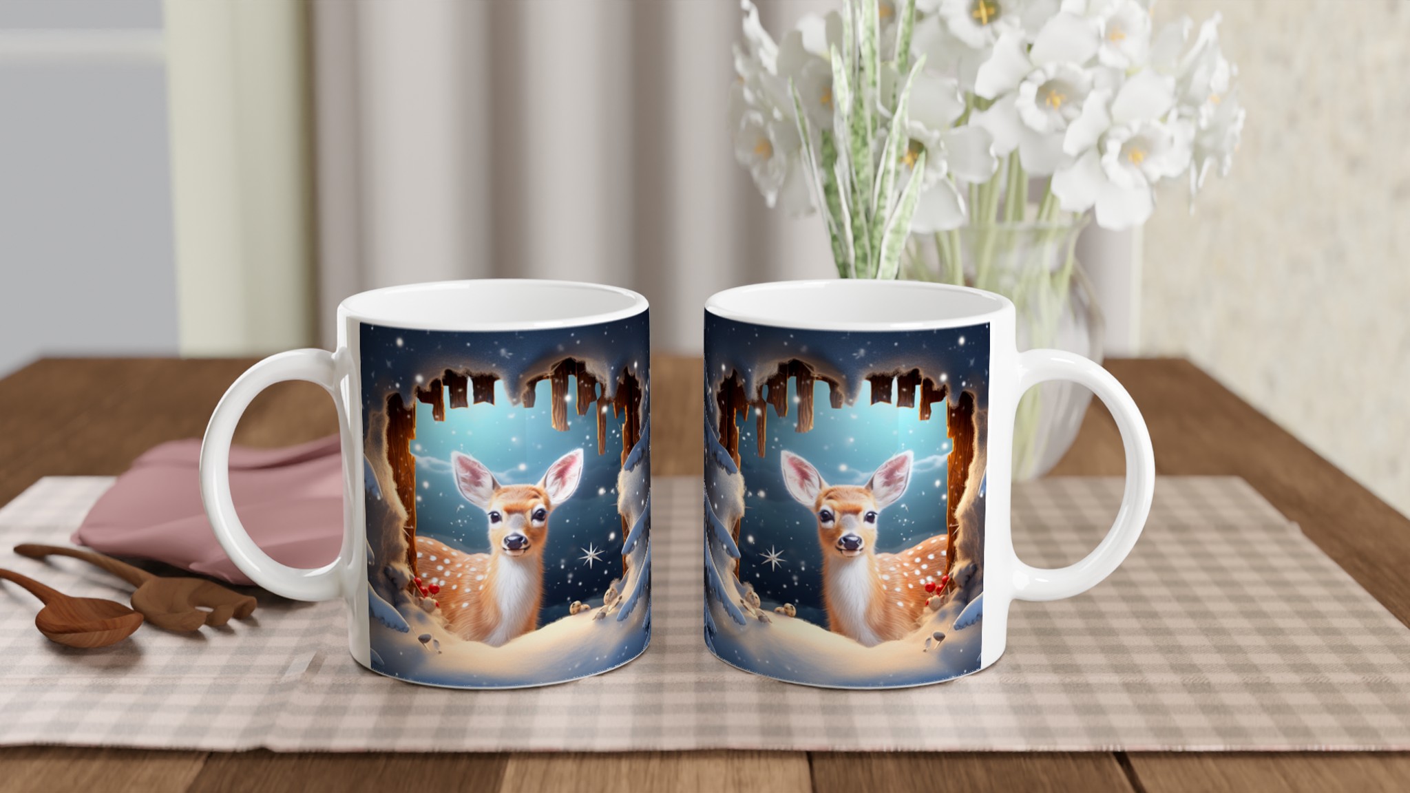 Föreställ dig en mysig vintermorgon, insvept i en filt, med en värmande dryck i din hand. Denna förtrollande keramiska mugg, prydd med ett bedårande vinterrådjur omgivet av snöklädda granar, skapar den perfekta stämningen för alla dina varma favoritdrycker. Perfekt för morgonkaffet, kvällens varma choklad eller när du bara vill njuta av en kopp te. Den blanka ytan framhäver illustrationen med klara och levande färger, som håller sig fina även efter många turer i mikron och diskmaskinen.