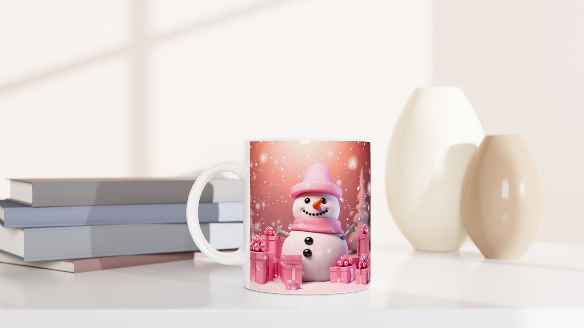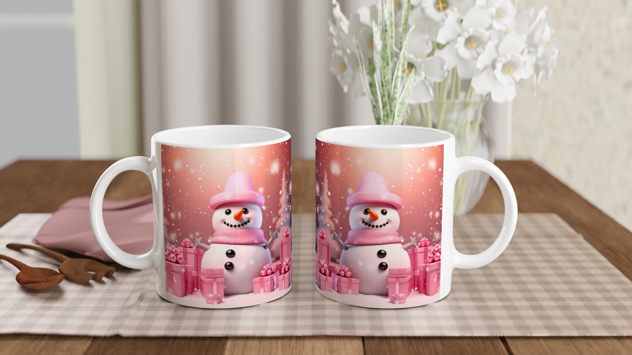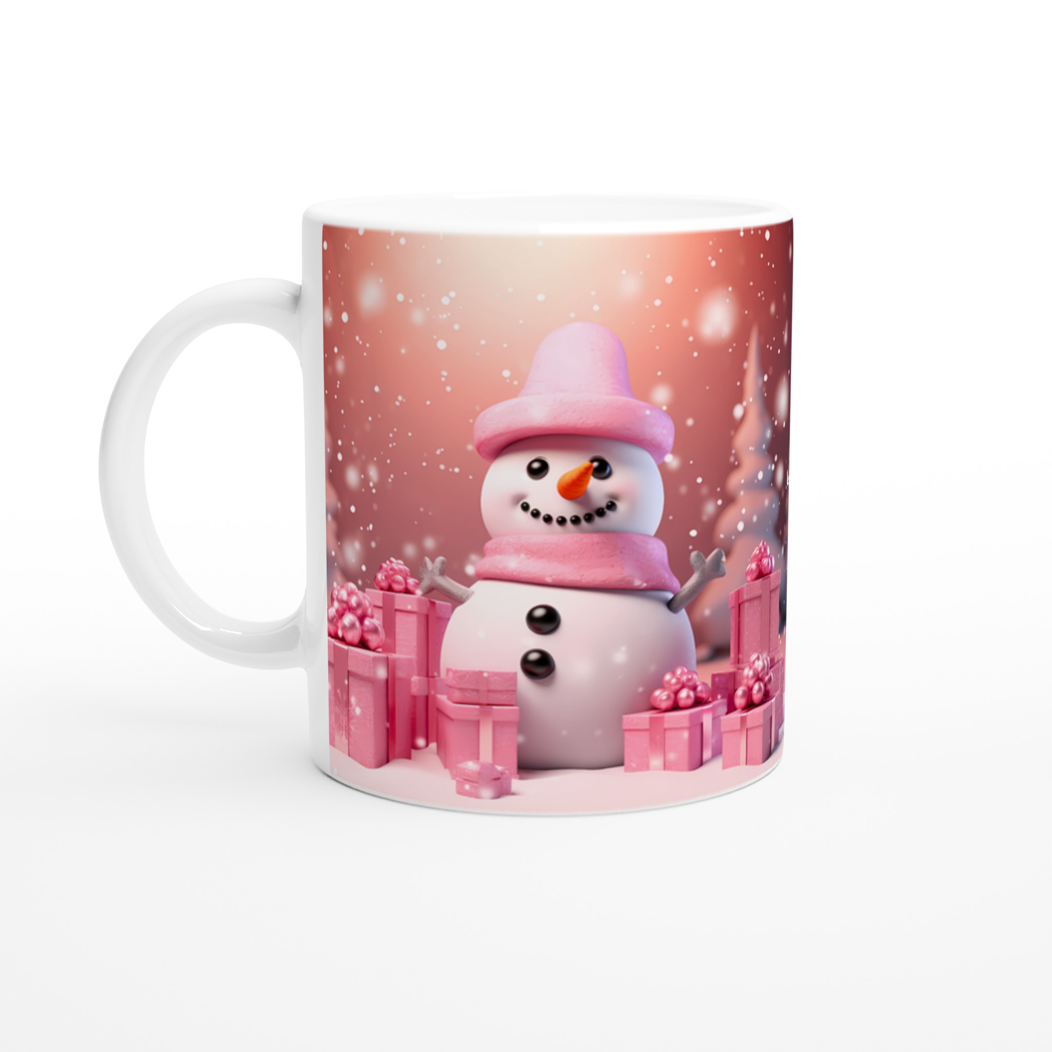 Lys upp din dag med vår charmiga ”Vintermys Mugg”! Denna bedårande keramiska mugg är prydd med en vänlig snögubbe i en mysig rosa mössa och halsduk, omgiven av glittrande rosa julklappar under ett lugnt snöfall. Den rosa och vita färgpaletten skapar en drömlik och festlig stämning, perfekt för att sprida glädje under de kalla månaderna eller året runt.