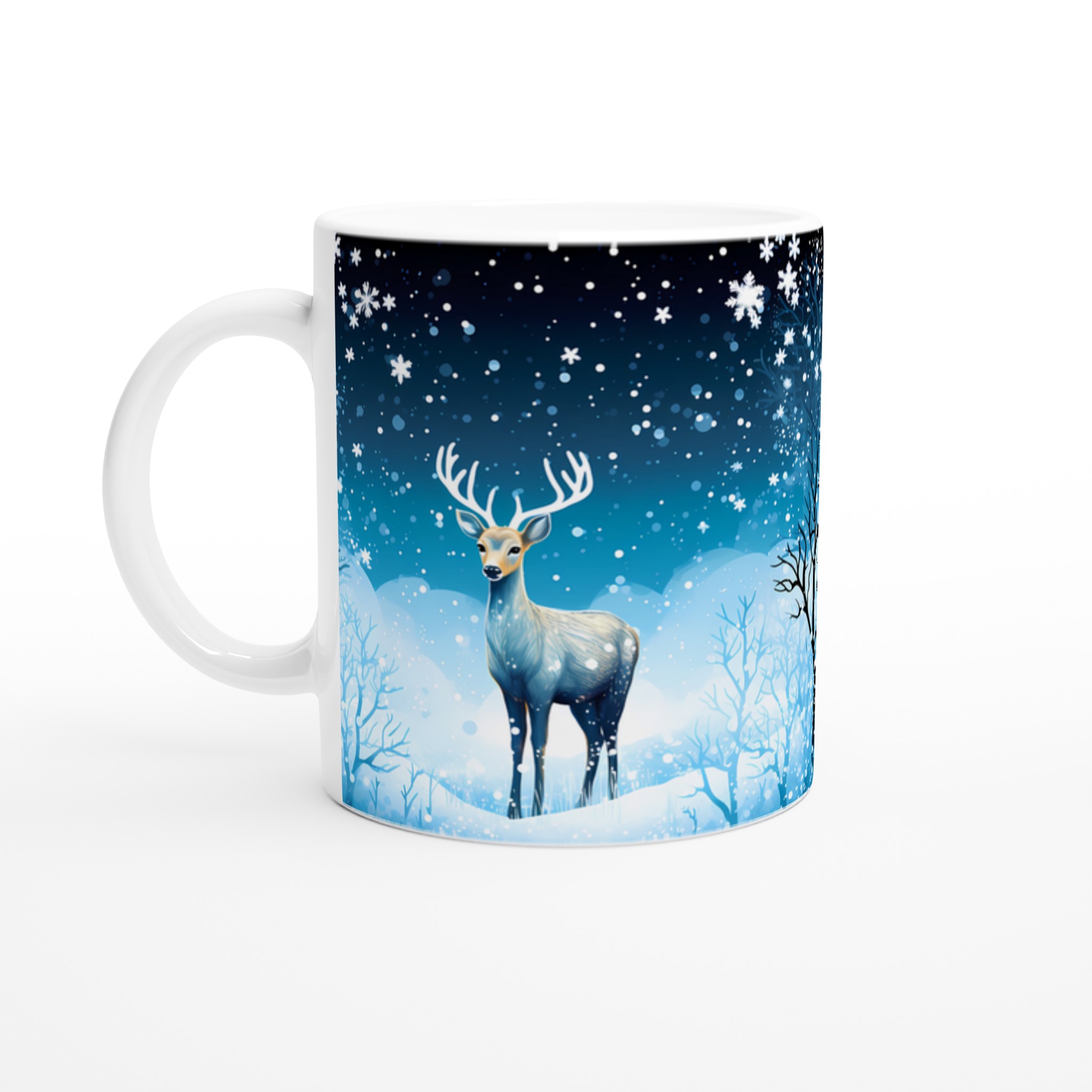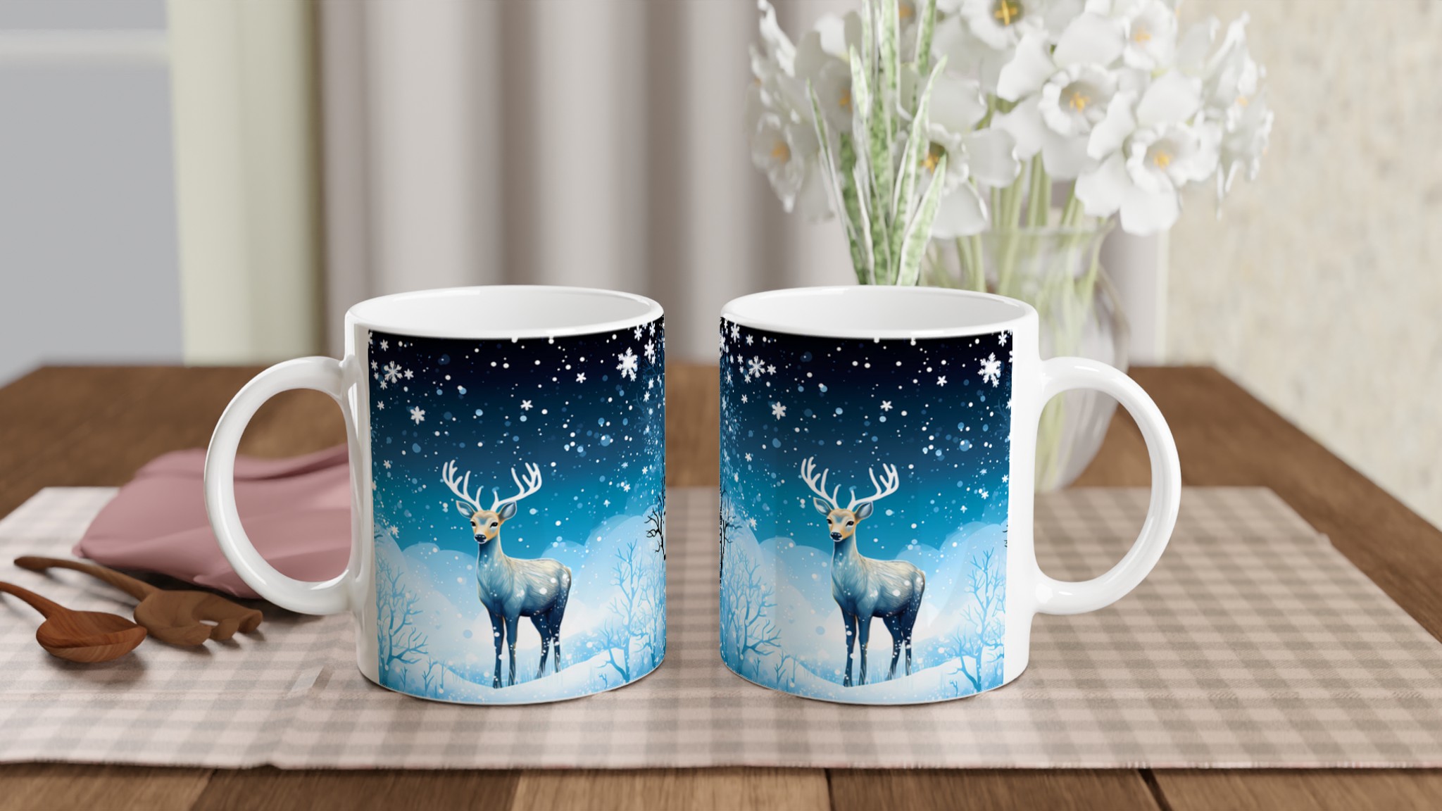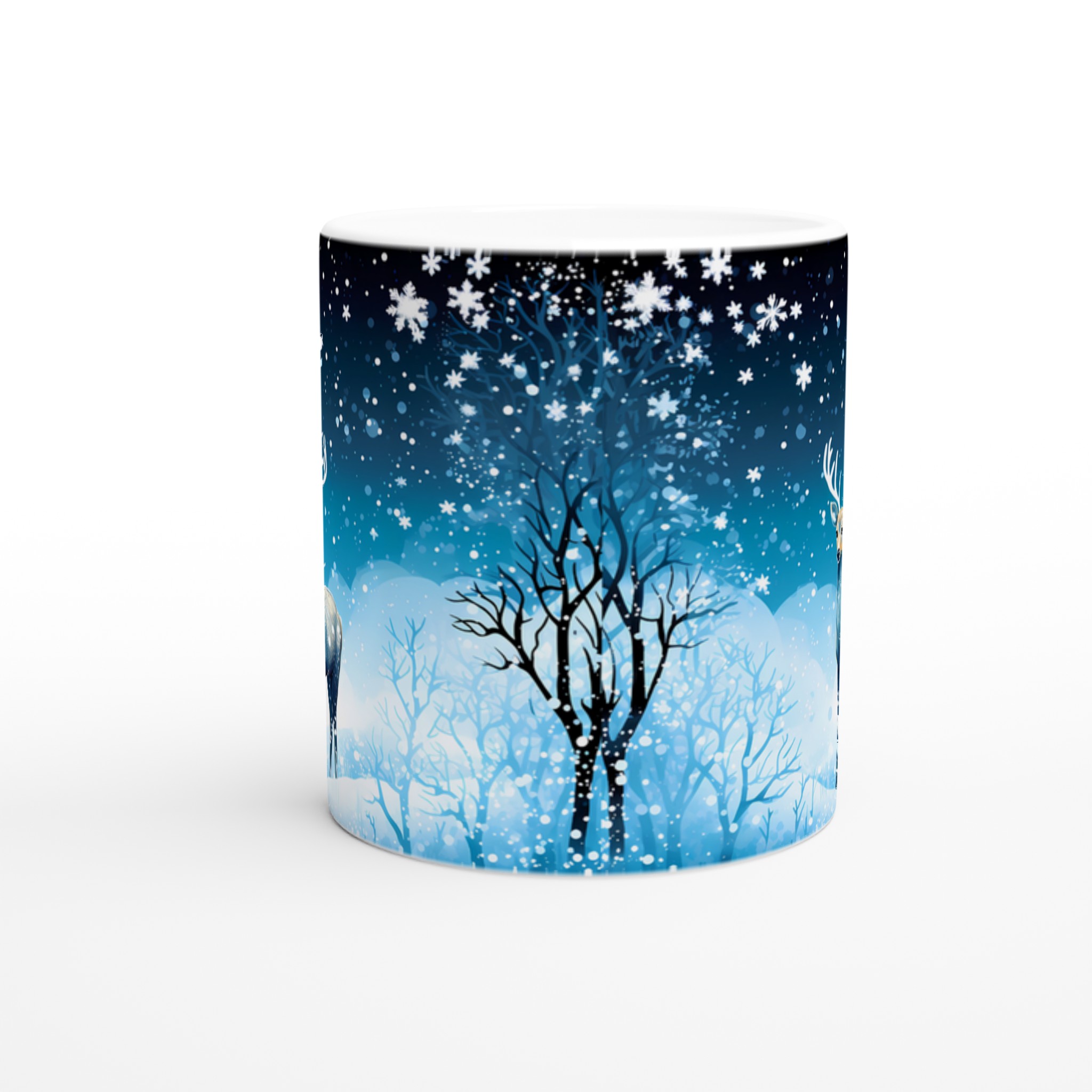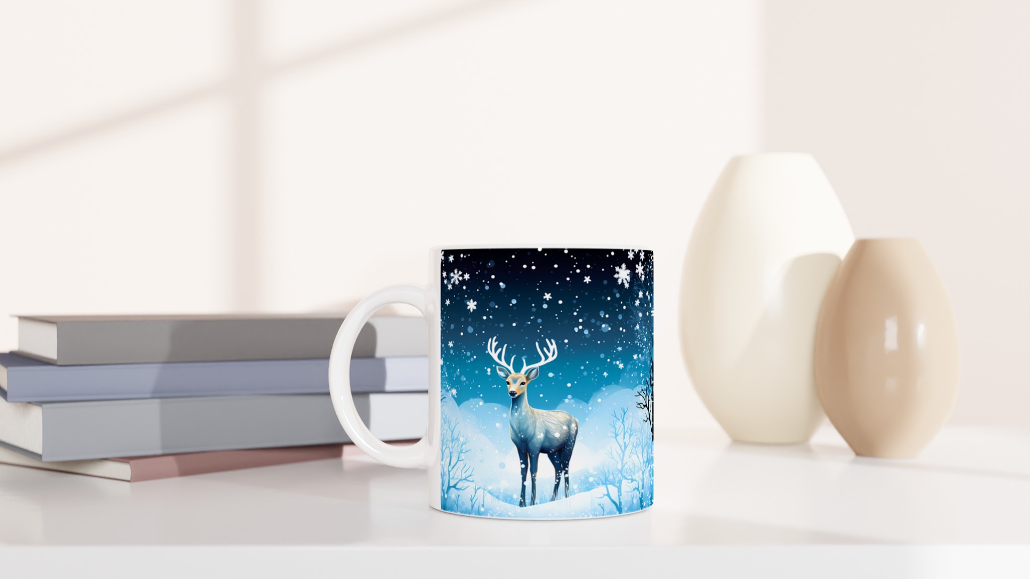 Låt dig förtrollas av vintermagin varje gång du tar en klunk! Denna stilrena keramiska mugg, prydd med ett majestätiskt rådjur i ett snöigt vinterlandskap, blir snabbt en vardagsfavorit. Perfekt för morgonkaffet, kvällens varma choklad eller när du bara vill njuta av en kopp te. De klara och levande färgerna i det vackra vintermotivet framhävs elegant på den blanka ytan och håller sig fina även efter många turer i mikron och diskmaskinen.