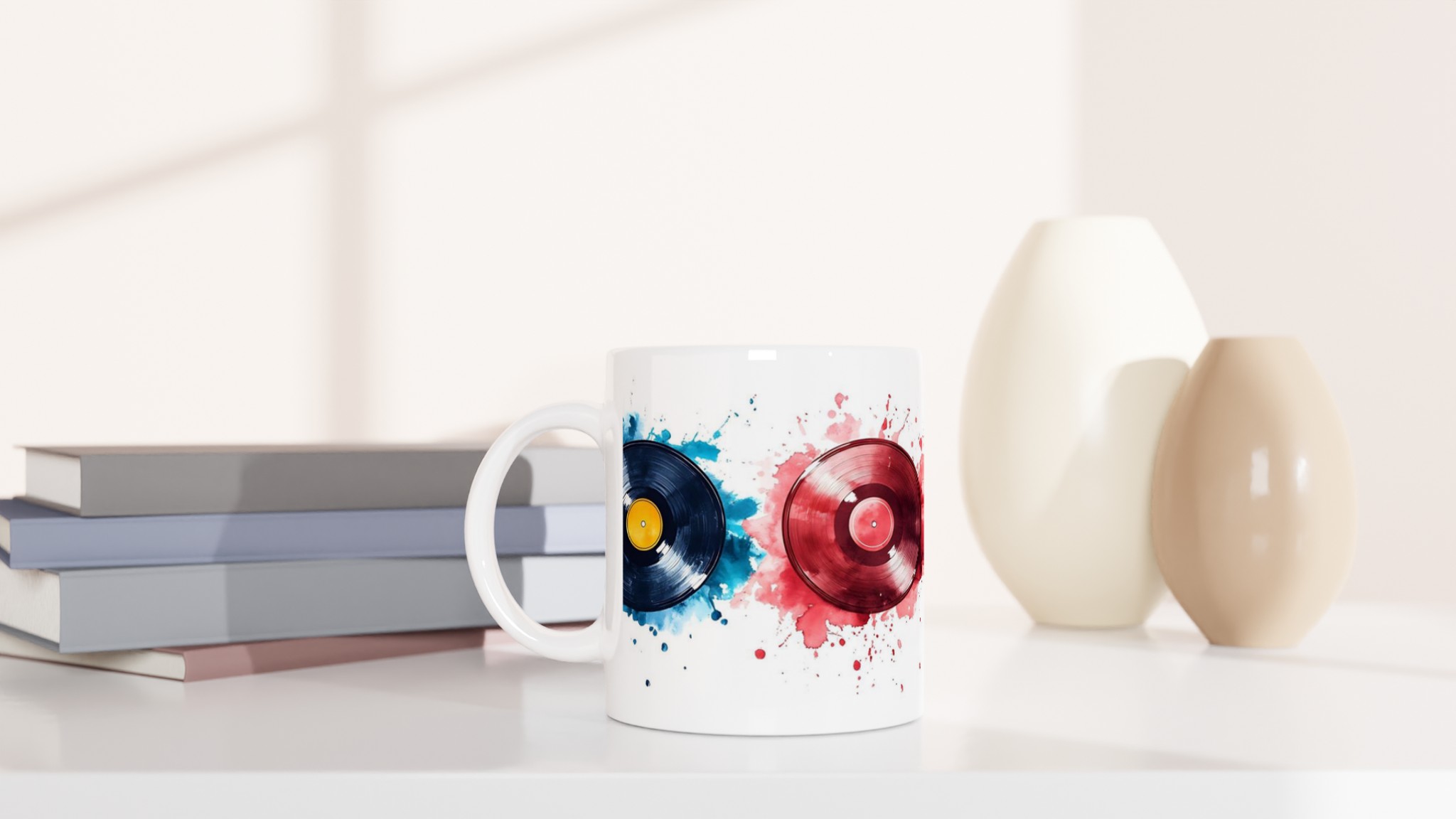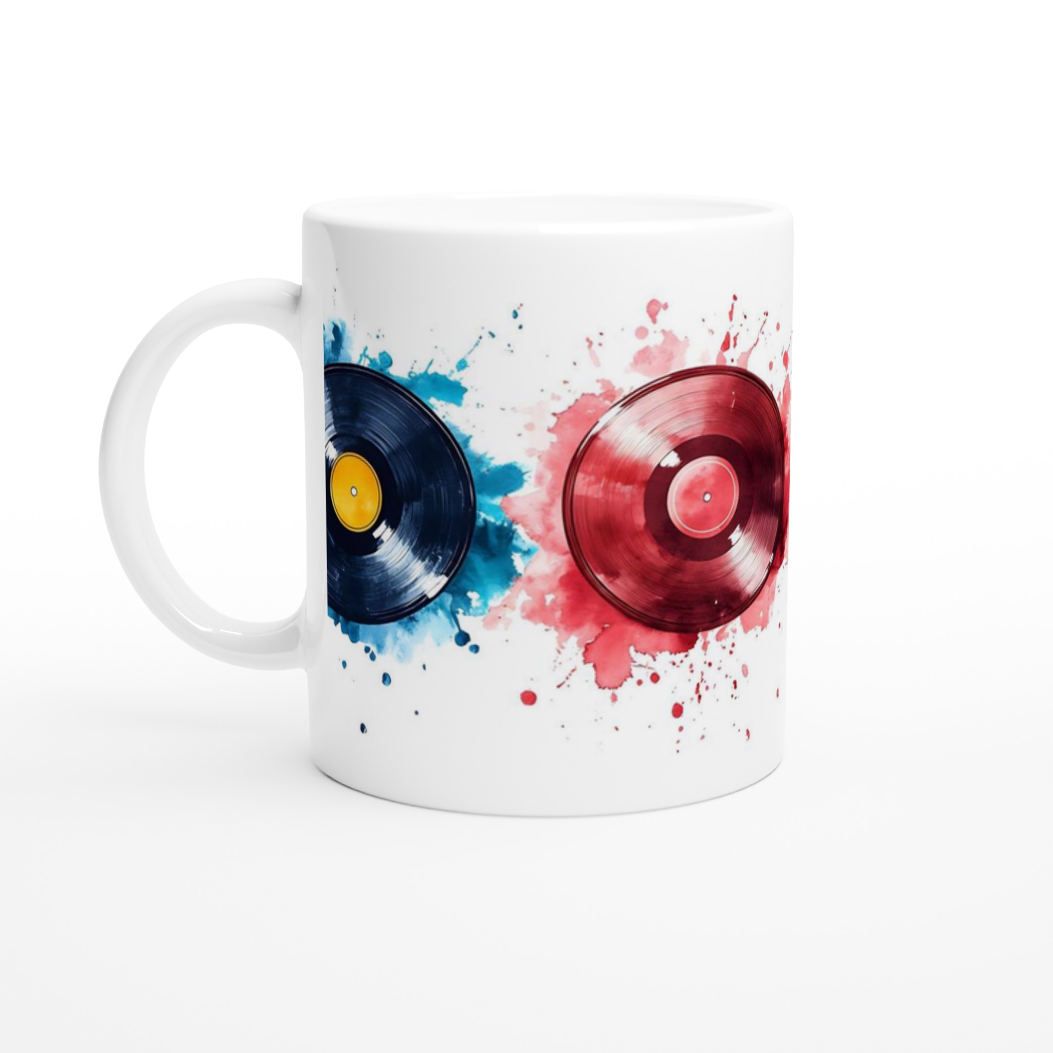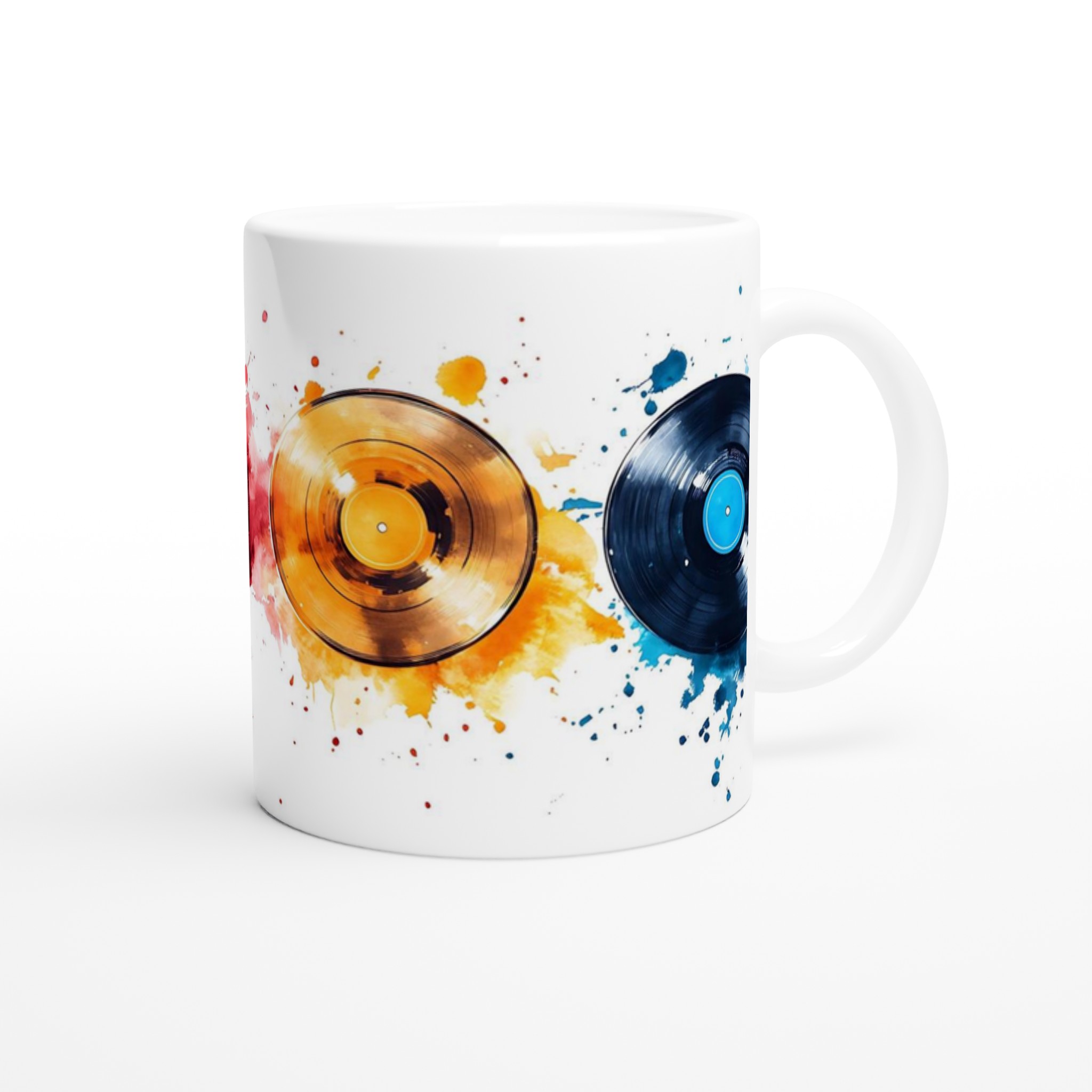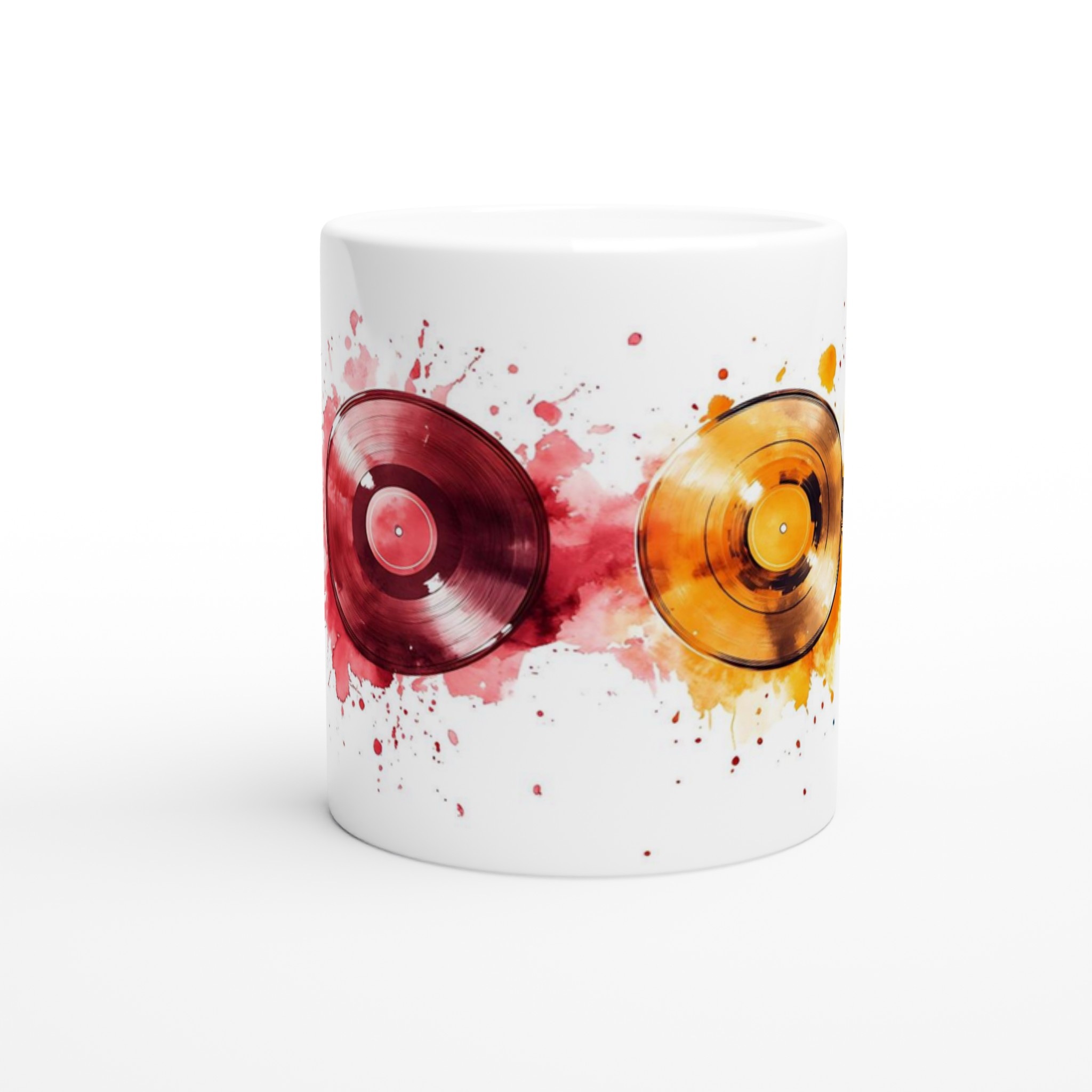 Inspirerad av vinylskivans tidlösa charm och omgiven av konstnärliga akvarellstänk i livfulla toner, är denna mugg mer än bara ett drickkärl; den är en hyllning till musik och färg. Den blanka vita ytan ger ett skarpt och levande tryck som verkligen sticker ut, oavsett om det är en personlig design, ett roligt citat eller en present till någon du tycker om.