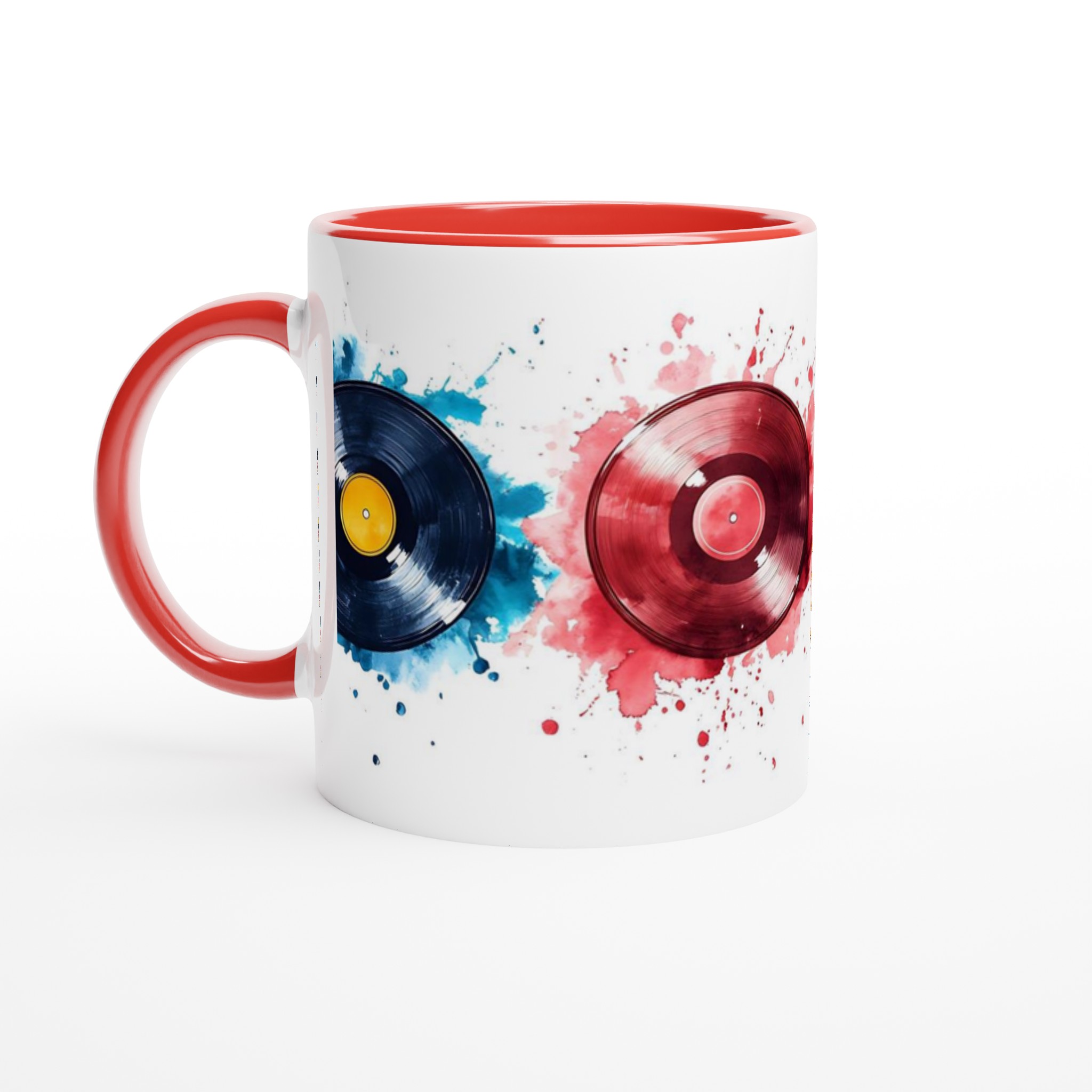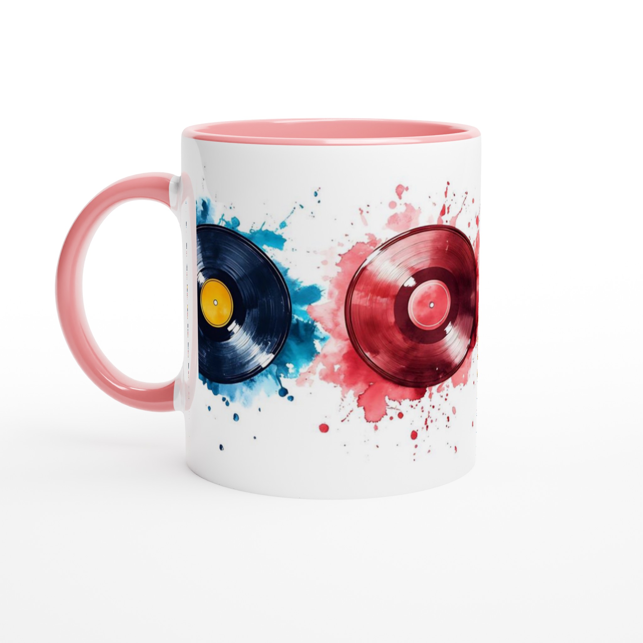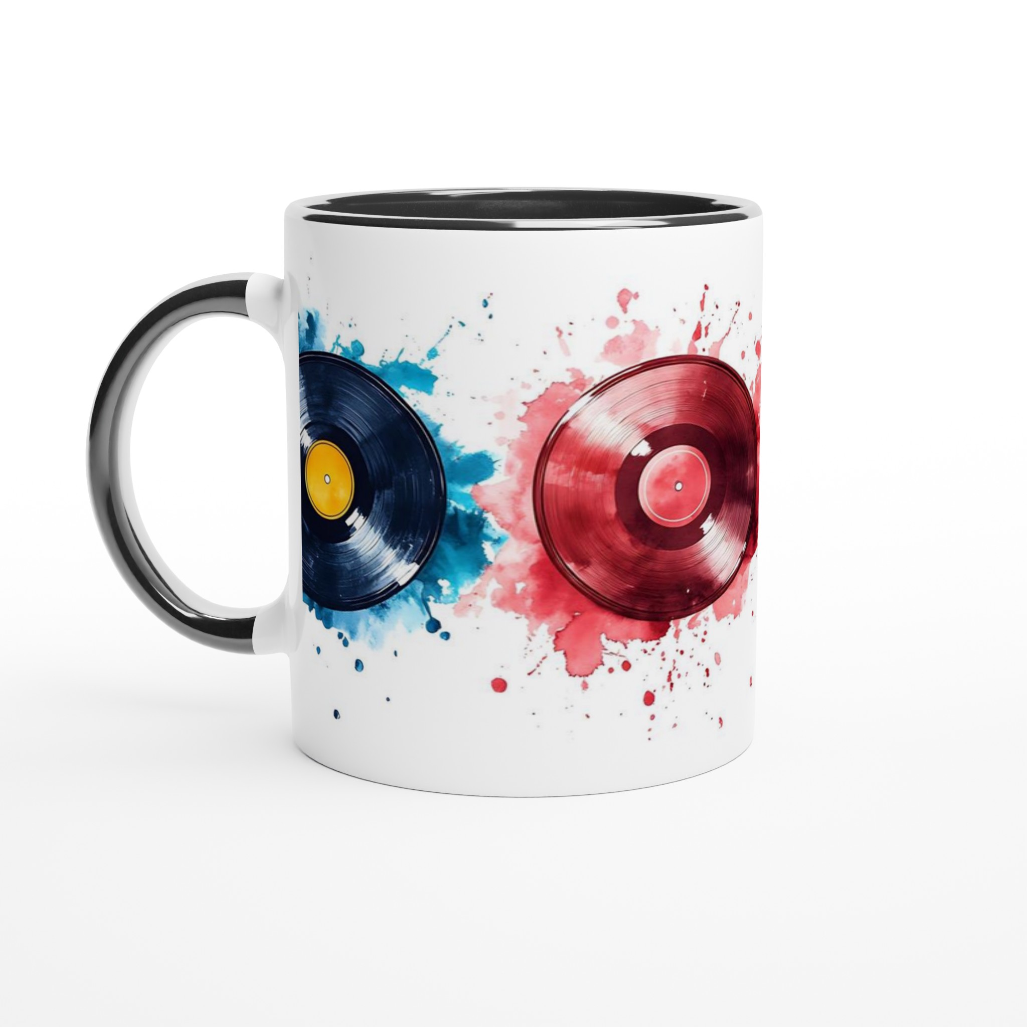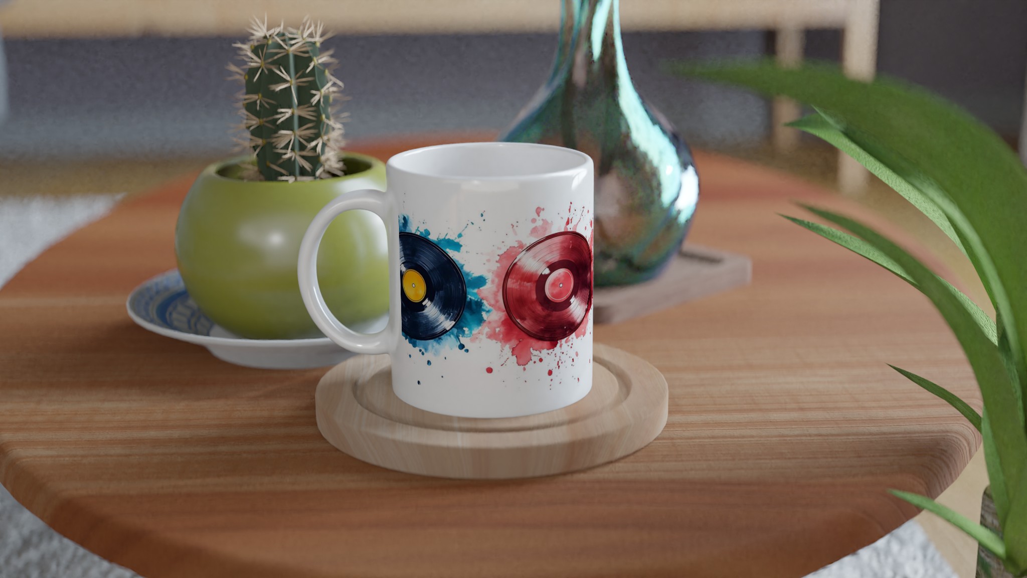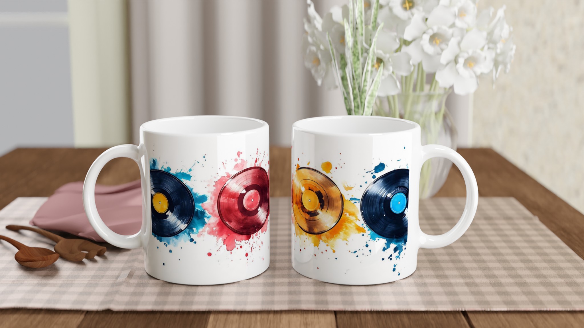 Inspirerad av vinylskivans tidlösa charm och omgiven av konstnärliga akvarellstänk i livfulla toner, är denna mugg mer än bara ett drickkärl; den är en hyllning till musik och färg. Den blanka vita ytan ger ett skarpt och levande tryck som verkligen sticker ut, oavsett om det är en personlig design, ett roligt citat eller en present till någon du tycker om.