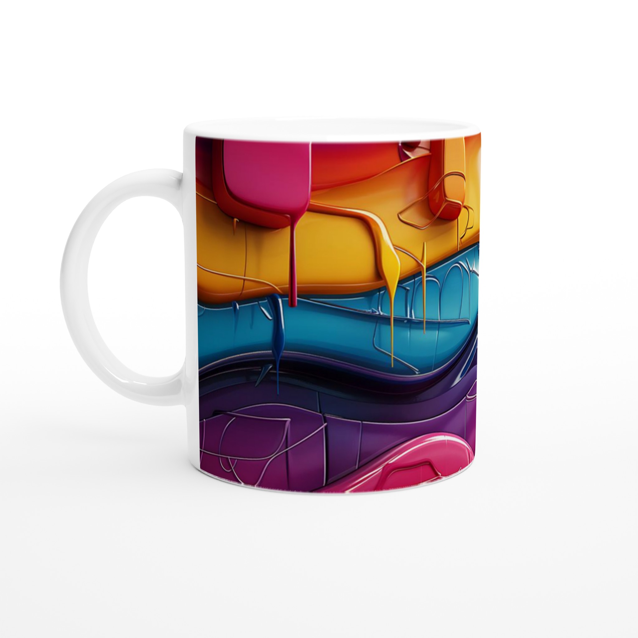 Denna mugg är inte bara en behållare för din favoritdryck; den är en canvas för konst. Med ett dynamiskt abstrakt mönster inspirerat av gatukonstens djärvhet och livfullhet, fångar den essensen av kreativitet. De flytande linjerna och de djupa, rika färgerna av orange, blått, lila och rosa skapar en känsla av rörelse och modern konst, perfekt för den som uppskattar en touch av det oväntade i sin vardag.