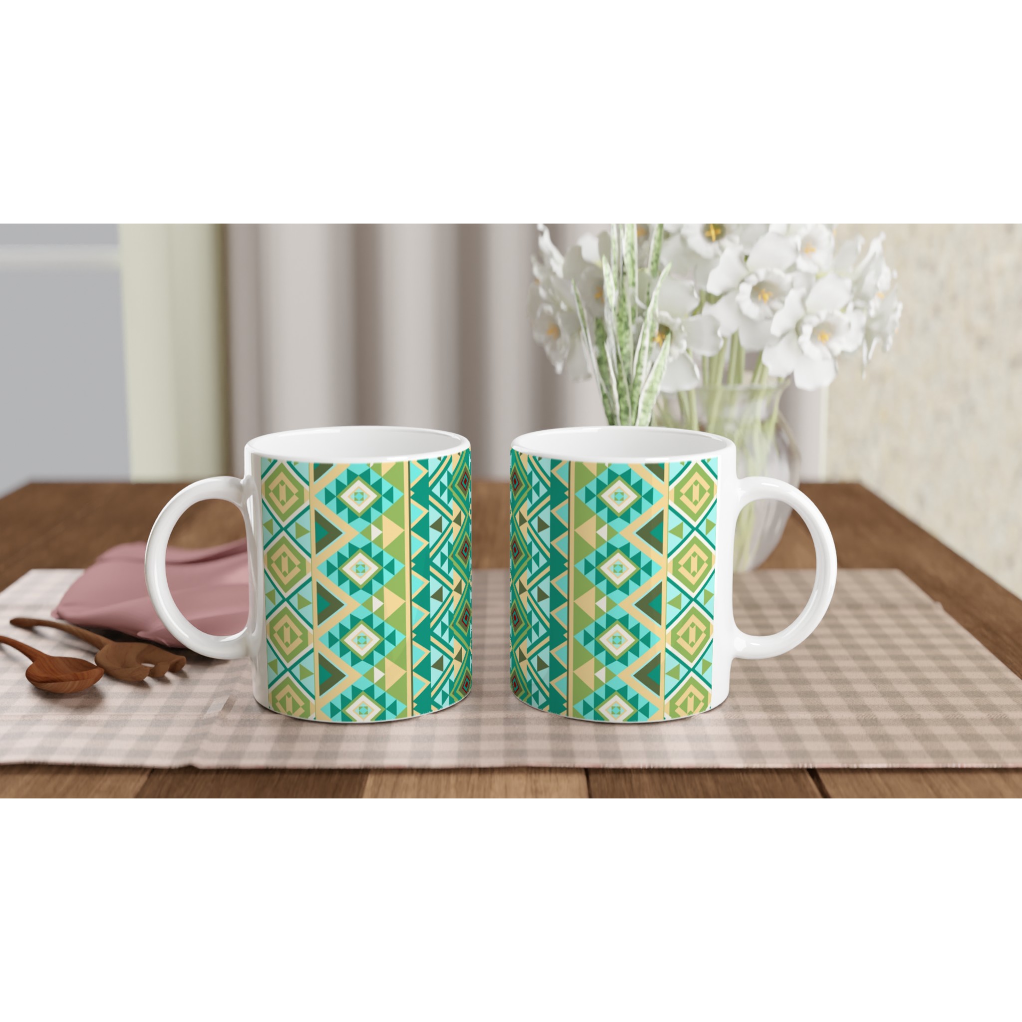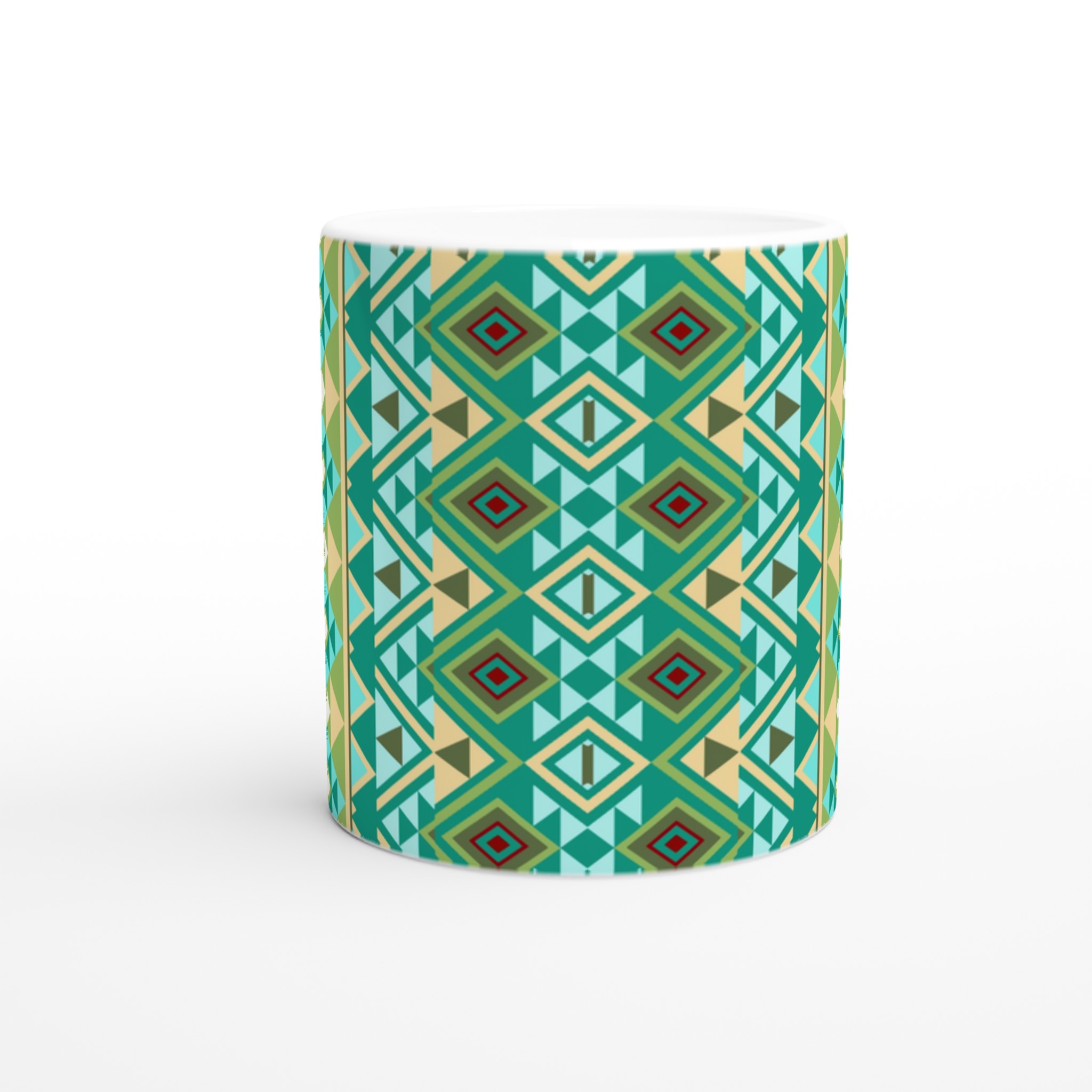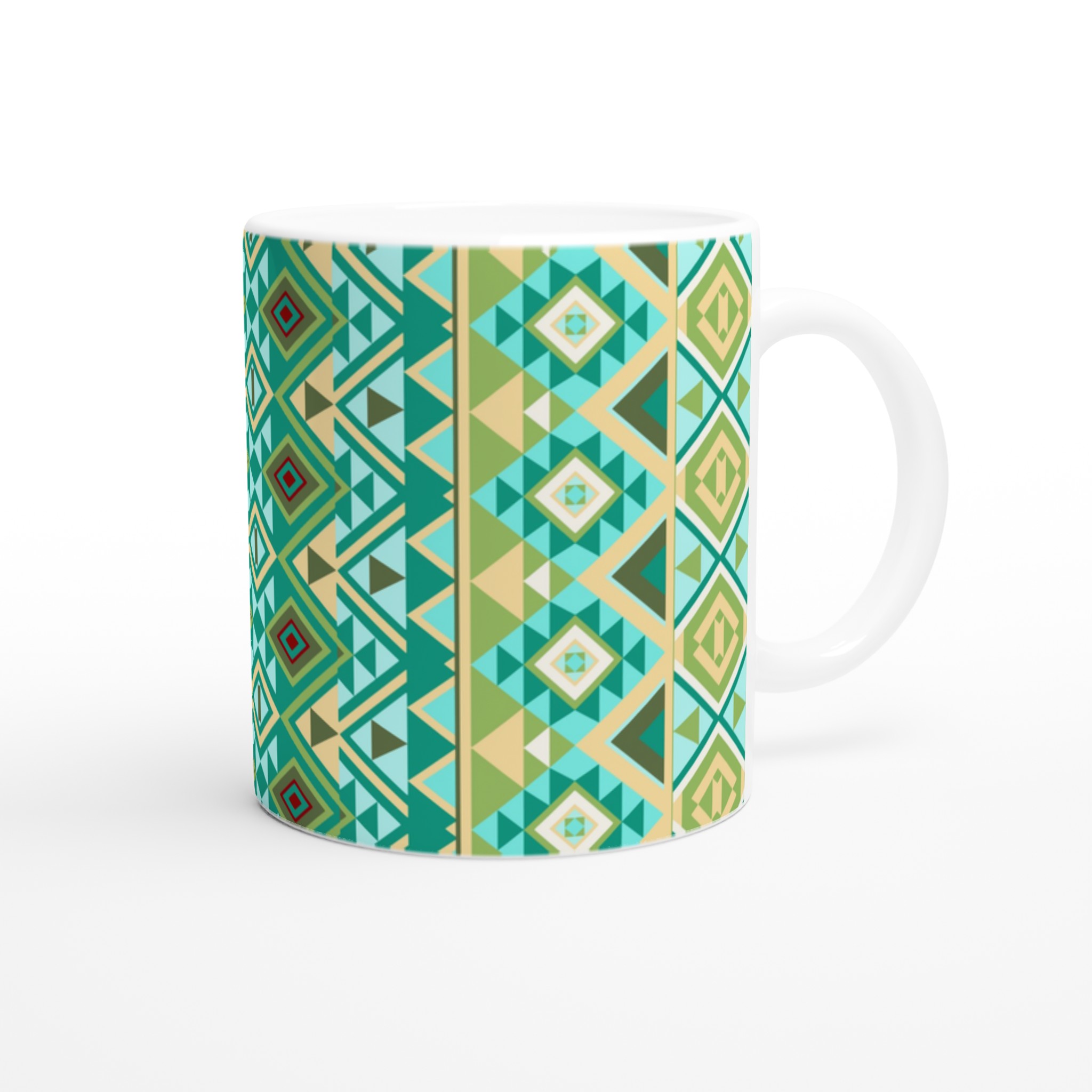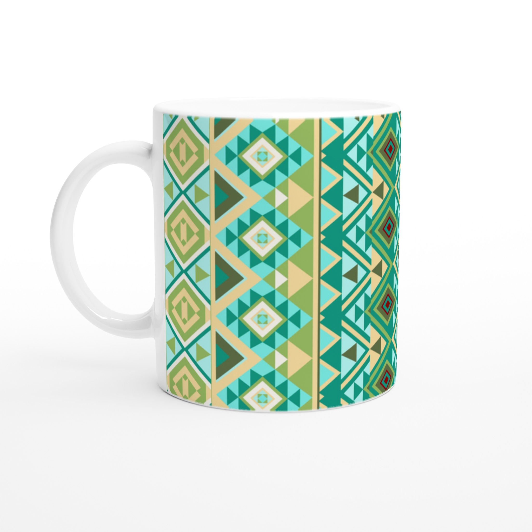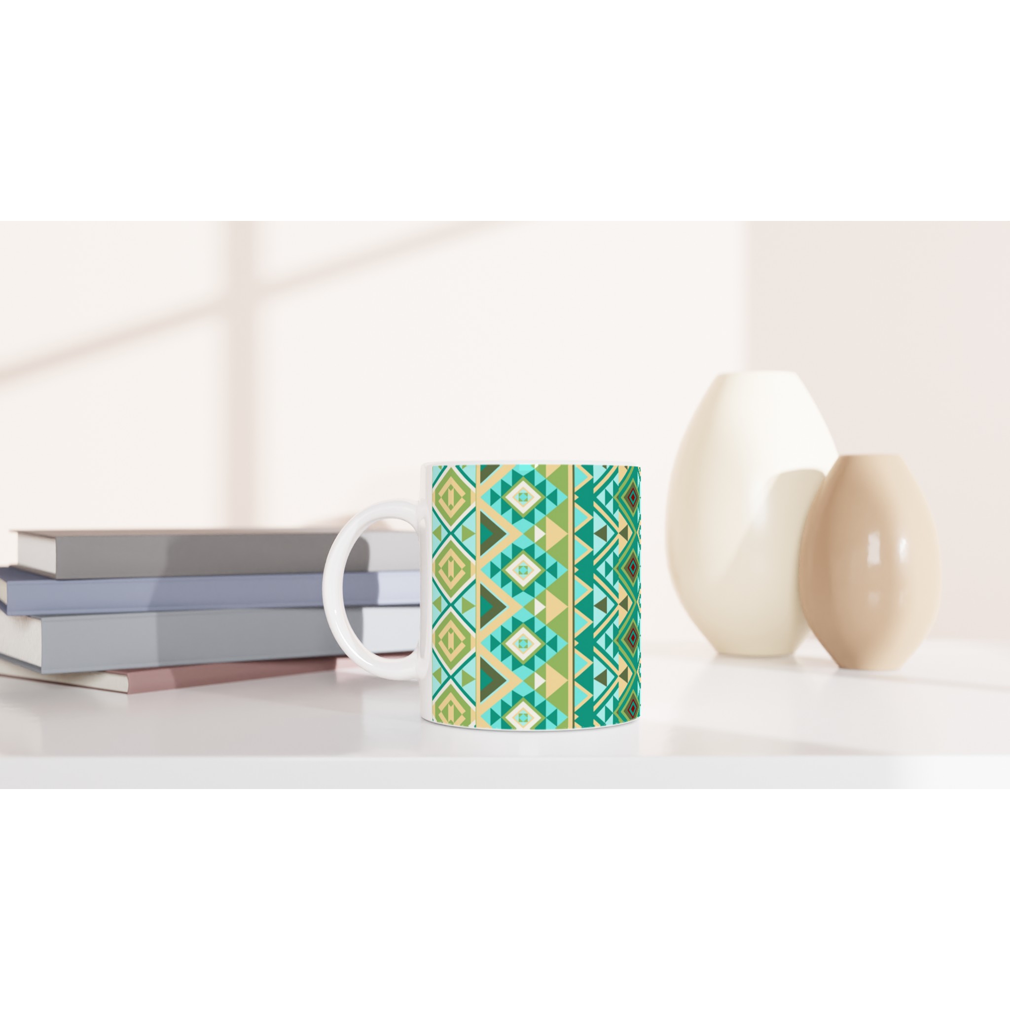 Lyft din fikastund med denna fängslande keramikmugg, prydd med ett trendigt geometriskt mönster i lugnande nyanser av turkos och grönt. Denna mugg är en hyllning till den bohemiska stilen och ger en touch av karaktär till varje ögonblick – vare sig det är morgonkaffet, en värmande kopp te eller en härlig varm choklad.
