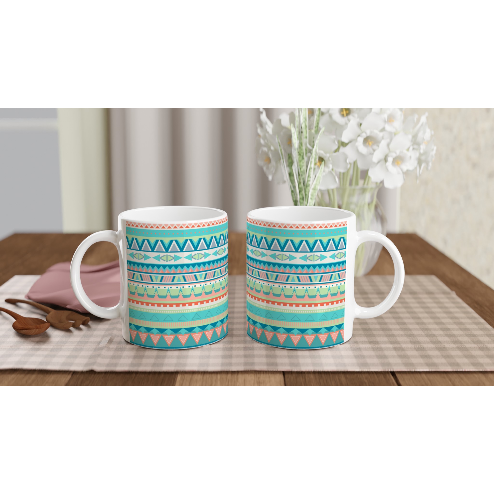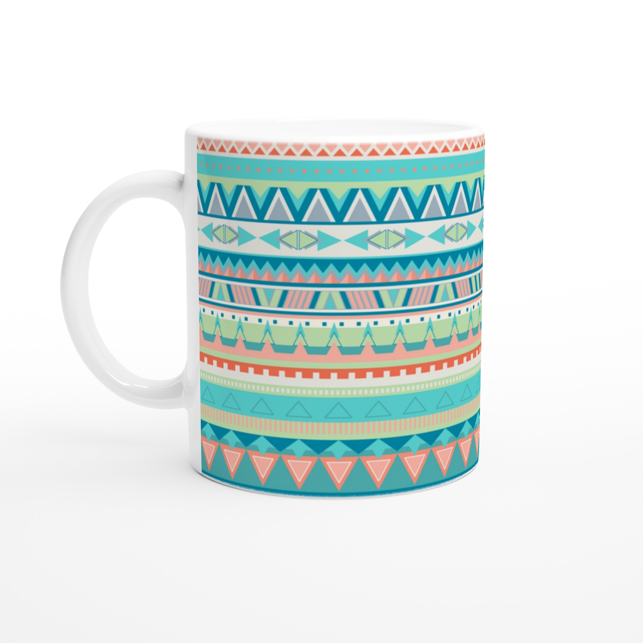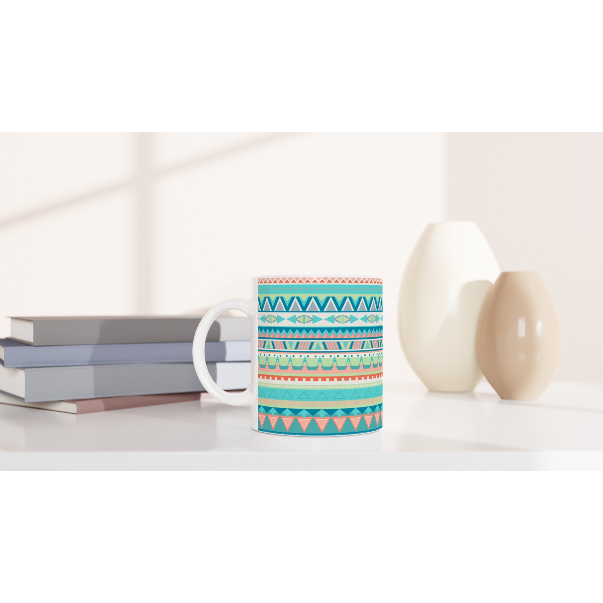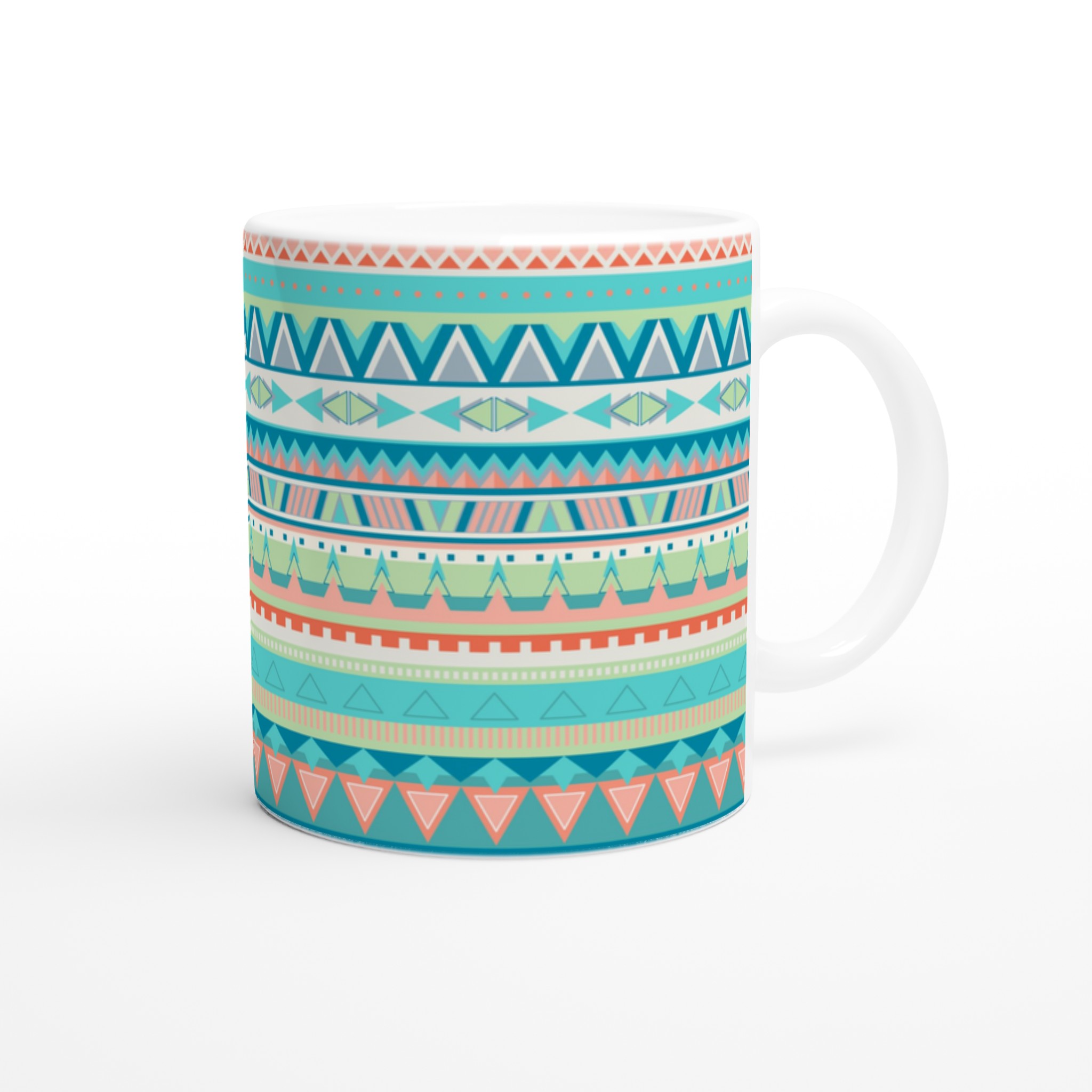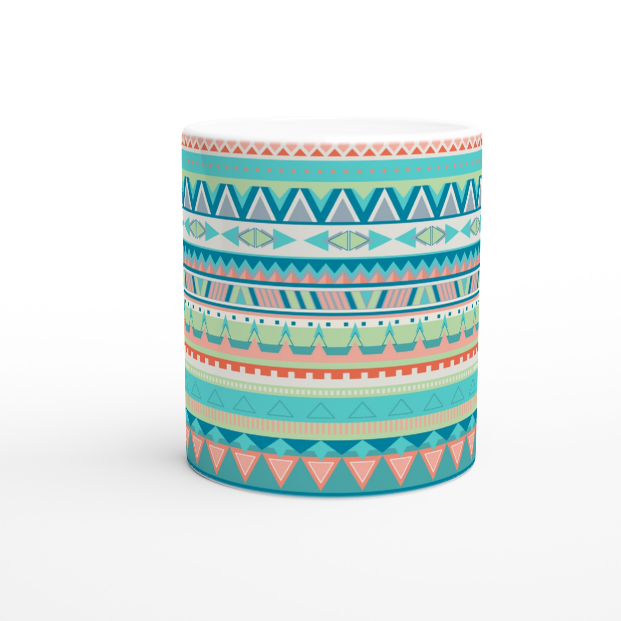 Fånga den livfulla energin från aztekiska mönster med denna stilrena och vackra keramikmugg. De lekfulla geometriska formerna i uppfriskande korall- och turkosnyanser ger en modern twist till ditt dagliga ritual, oavsett om det är morgonkaffet, en värmande kopp te eller en härlig varm choklad. Den blanka vita ytan låter detta unika tryck framträda klart och färgstarkt, vilket gör muggen till en riktig favorit i vardagen.