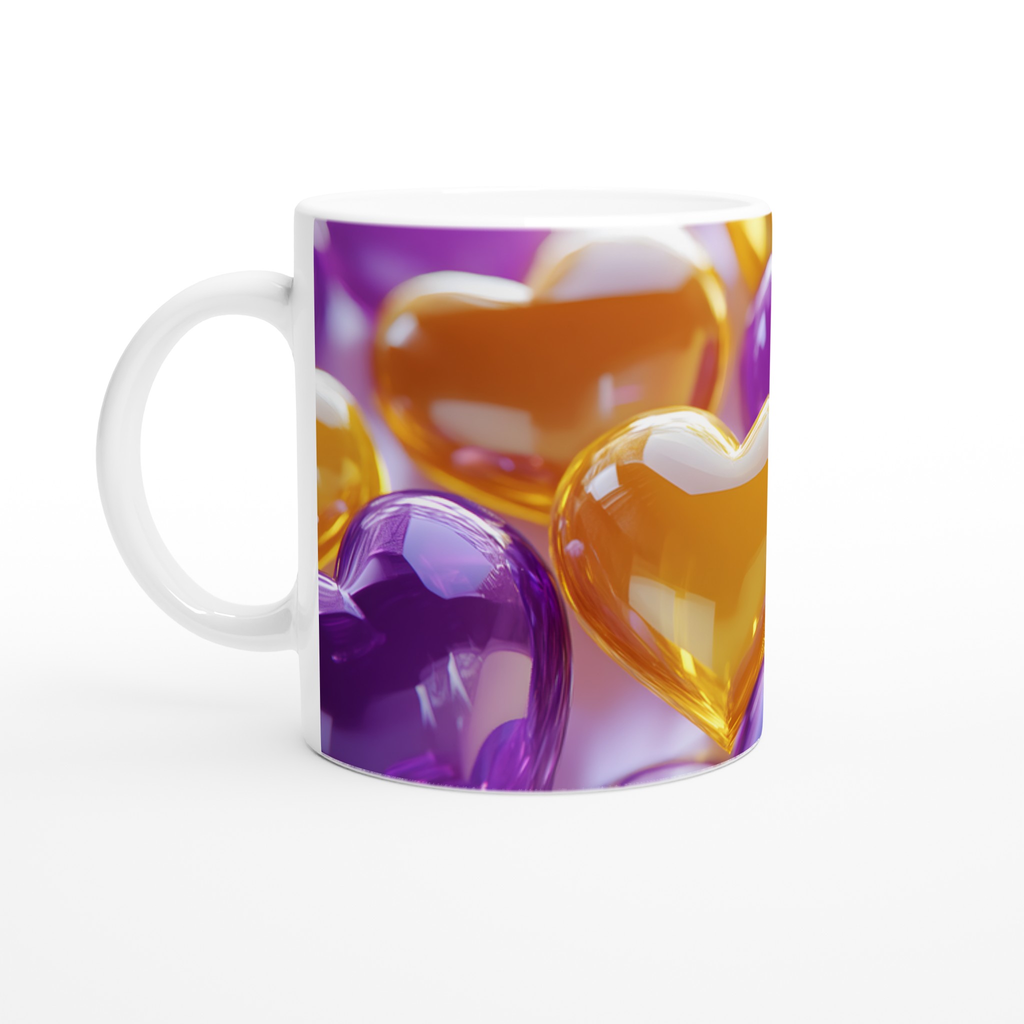 Denna stilrena och vackra keramikmugg är perfekt för alla dagens stunder – morgonkaffet, en värmande kopp te eller en härlig varm choklad. Med sitt livfulla tryck av glänsande orange och lila hjärtan, förmedlar den en känsla av glädje och romantik. Den blanka vita ytan gör att trycken framträder klart och färgstarkt, vilket gör muggen till en riktig favorit i vardagen. Tack vare den höga kvaliteten behåller trycket sin lyster även efter många omgångar i både mikrovågsugn och diskmaskin.