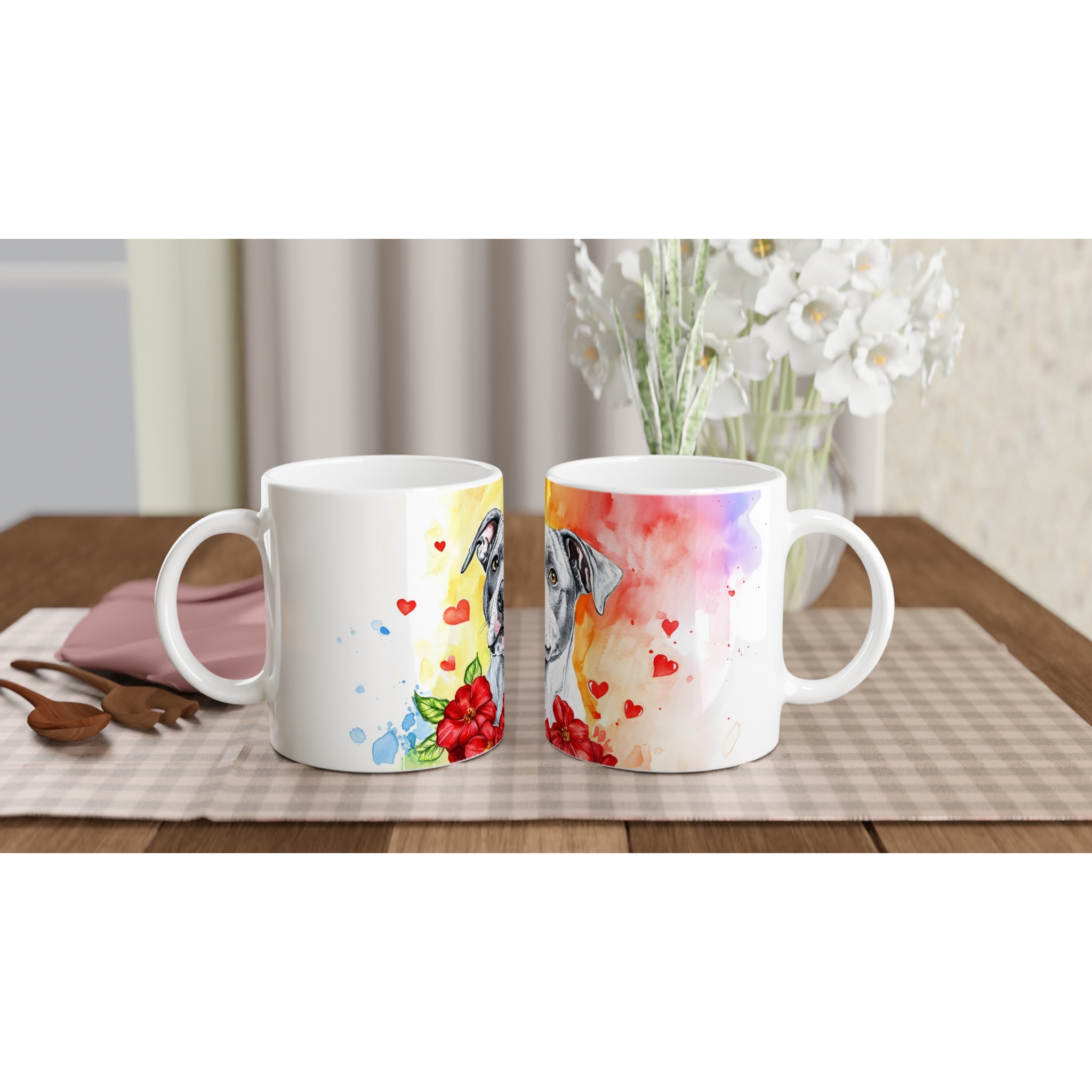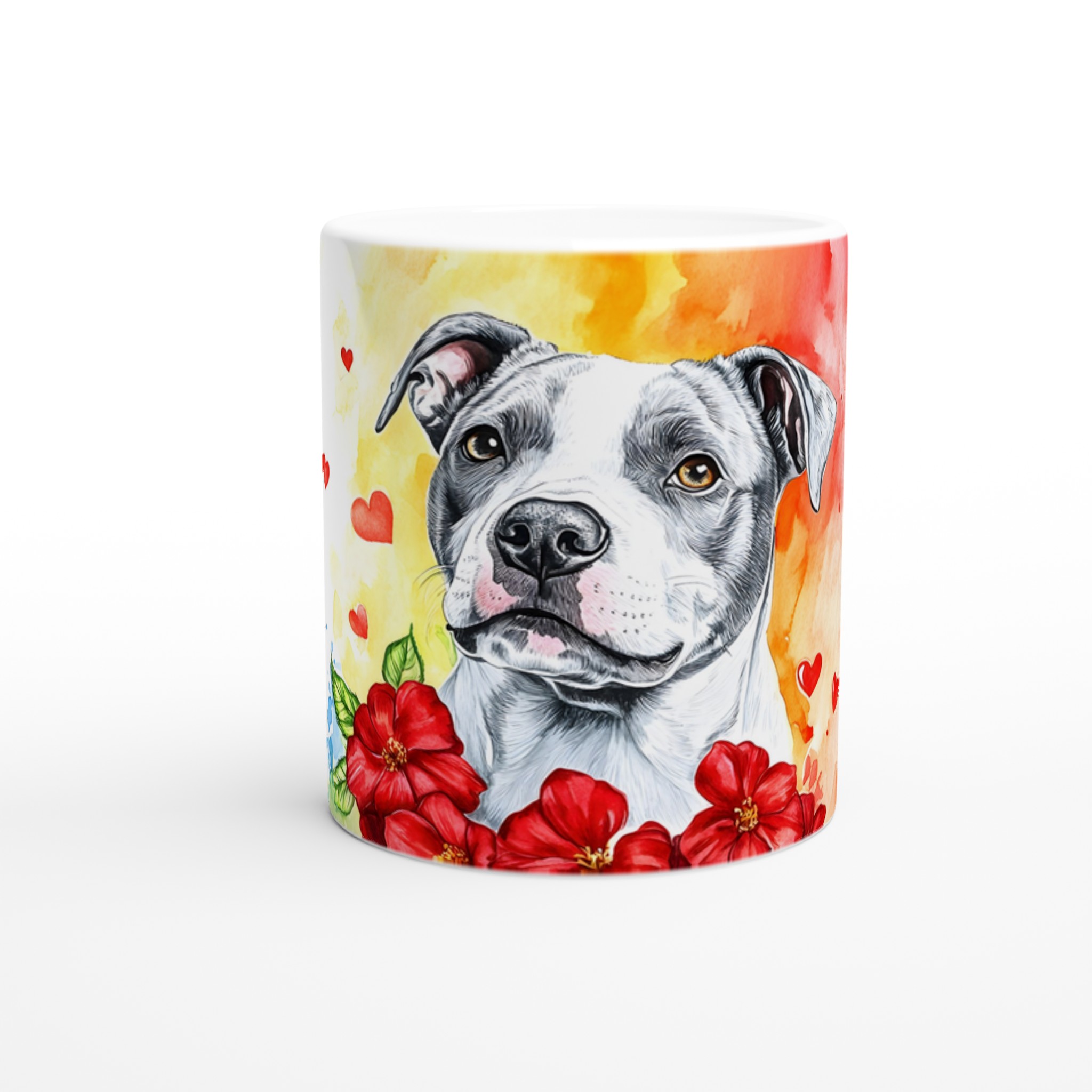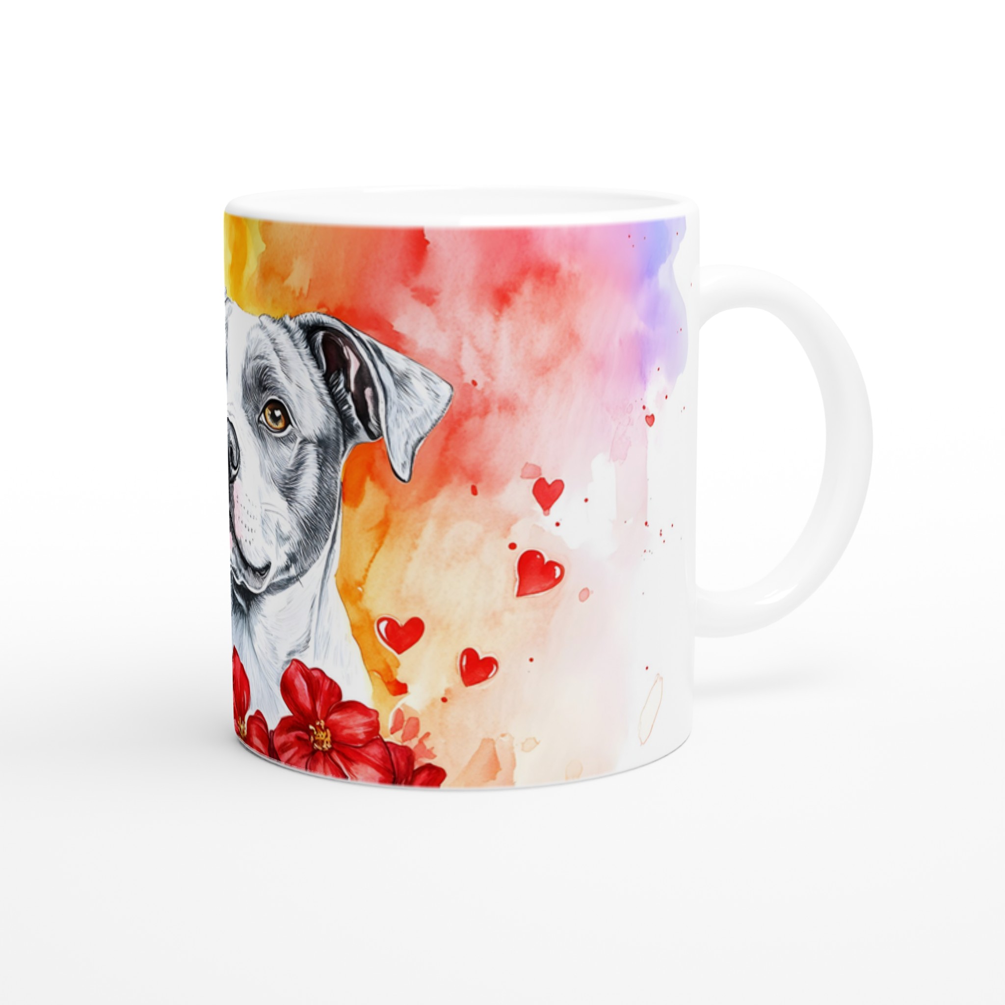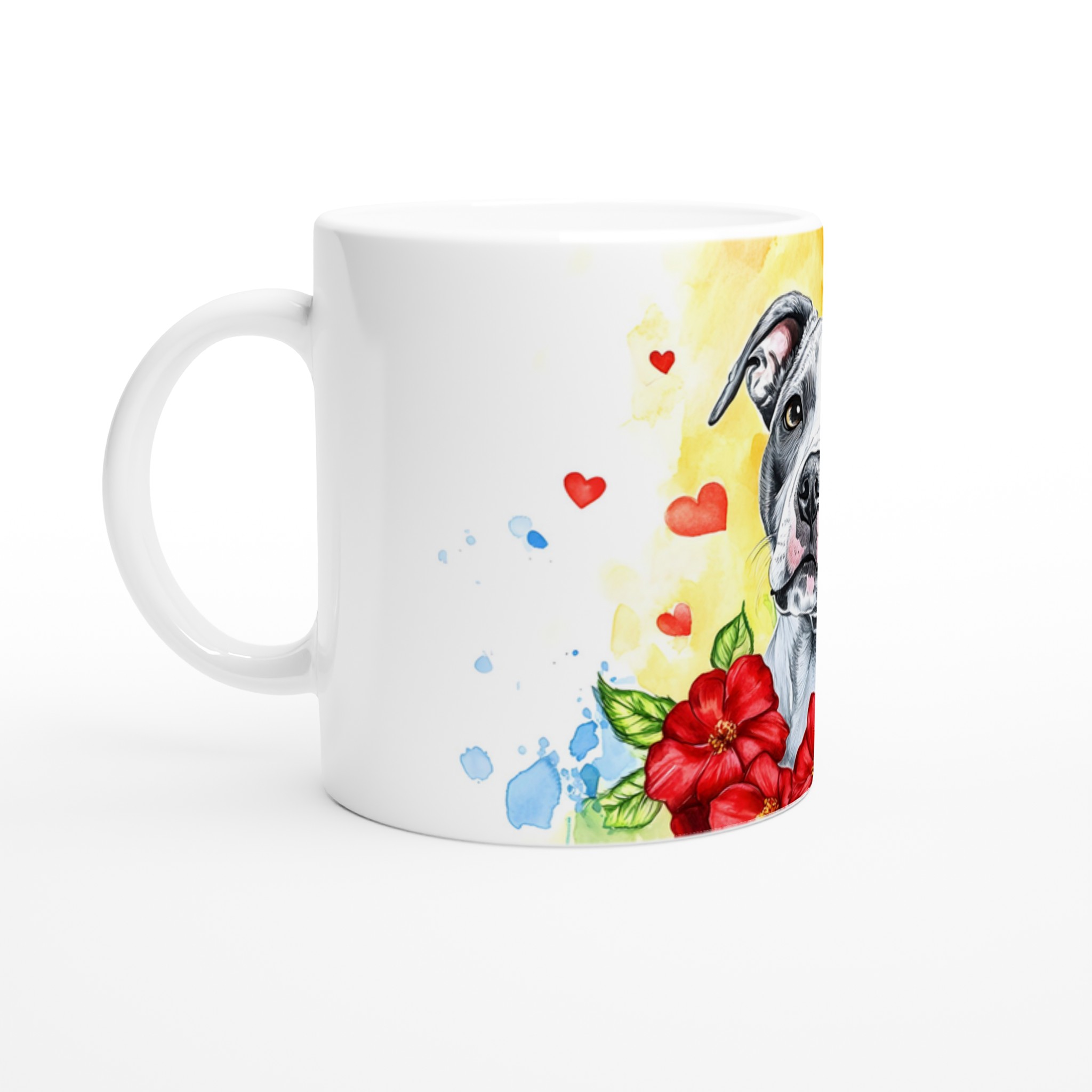 Vakna upp till kärlek varje morgon med denna charmiga keramikmugg! Prydd med en bedårande Pitbull-valp i en lekfull akvarellstil, omgiven av livfulla röda blommor och hjärtan, skapar denna mugg en omedelbar känsla av glädje och värme. De mjuka färgövergångarna i bakgrunden – från soligt gult till passionerat rött och lugnande blått – ger varje klunk en konstnärlig touch. Perfekt för ditt morgonkaffe, en avkopplande kopp te eller en mysig varm choklad, blir den snabbt din nya favorit.