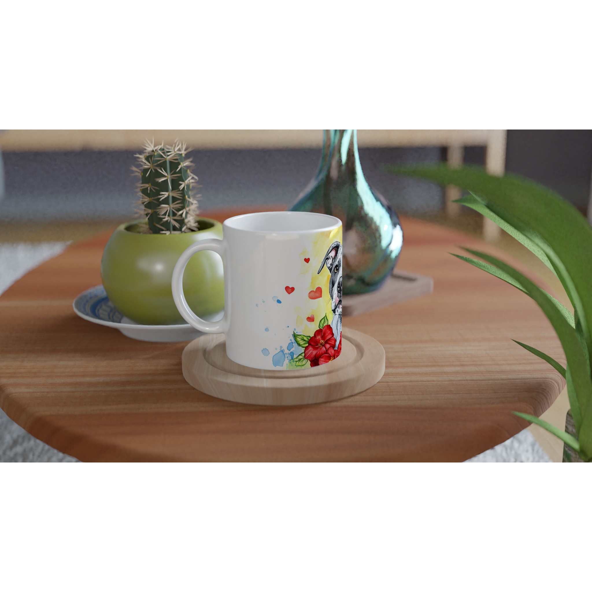 Den blanka vita ytan lyfter fram det färgstarka trycket med enastående klarhet, så att varje detalj i den söta valpen och de romantiska blommorna kommer till sin rätt. Denna högkvalitativa mugg är inte bara vacker utan också praktisk – trycket behåller sin lyster och färgintensitet, även efter otaliga omgångar i mikrovågsugnen och diskmaskinen. En idealisk present för hundälskare, alla hjärtans dag eller bara för att sprida lite extra kärlek i vardagen!