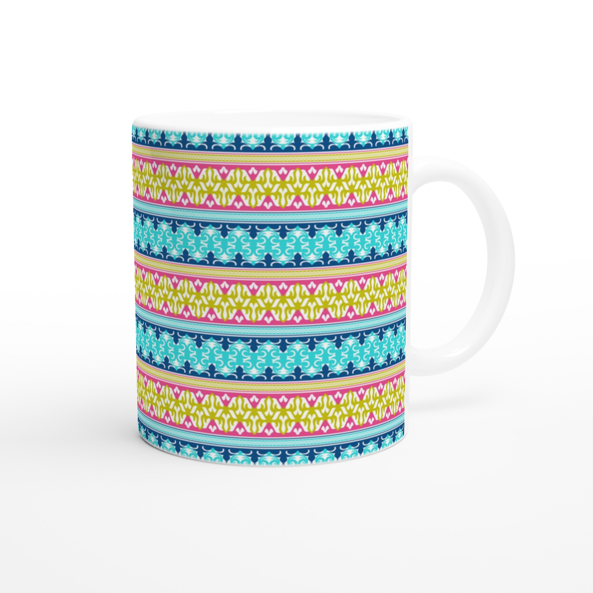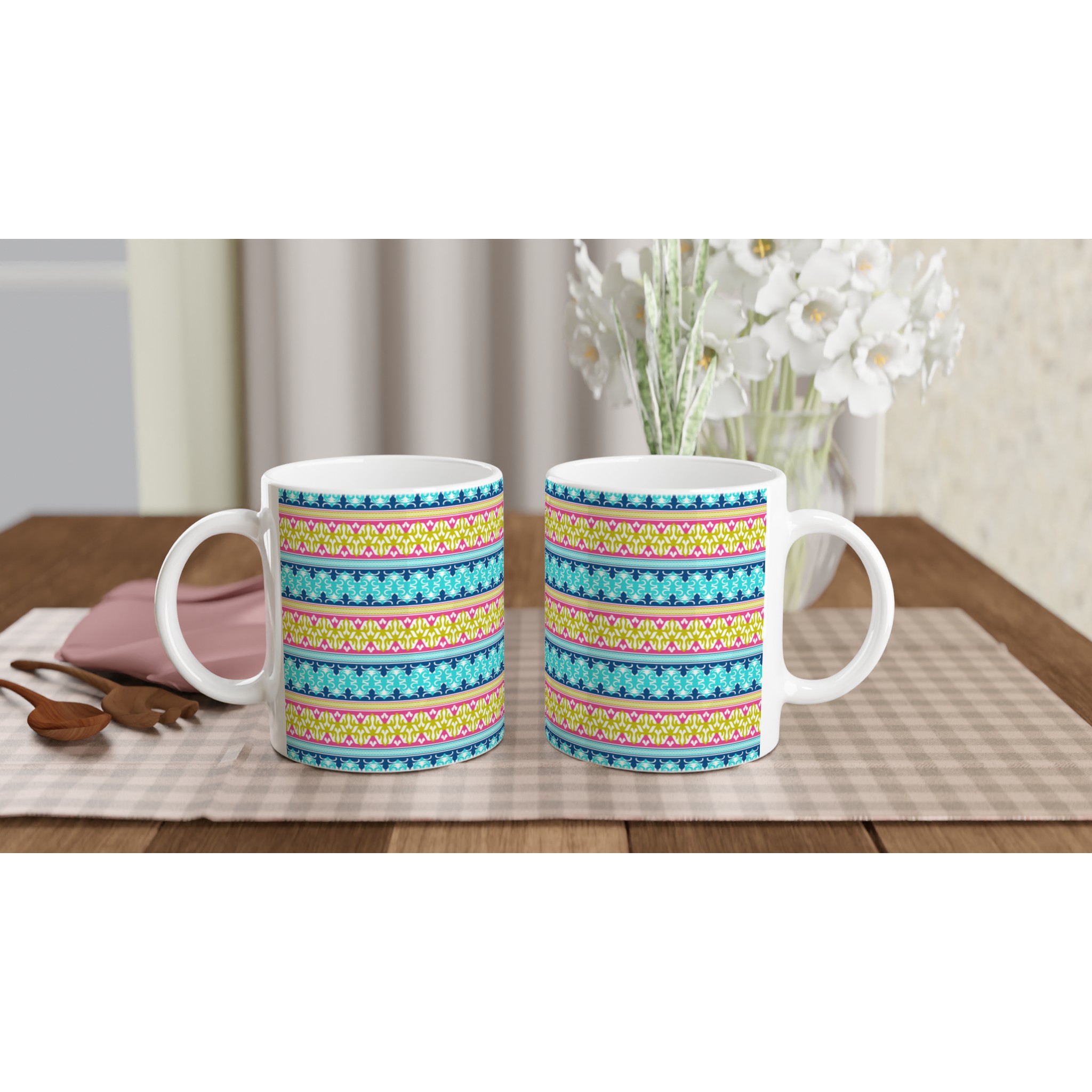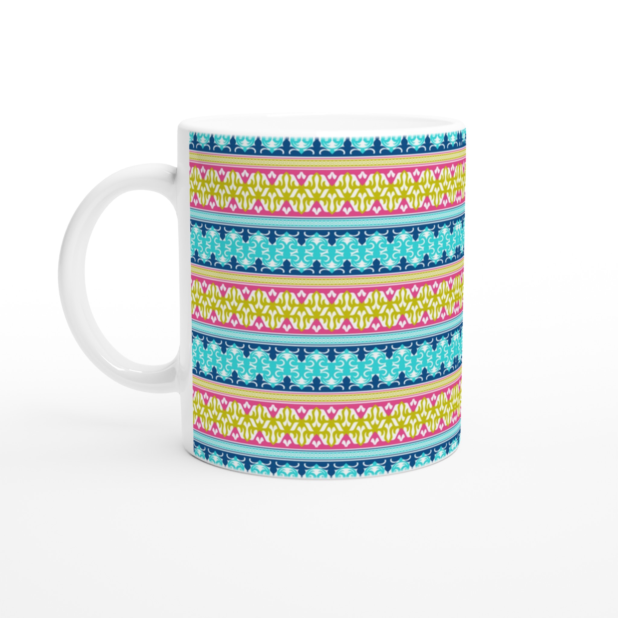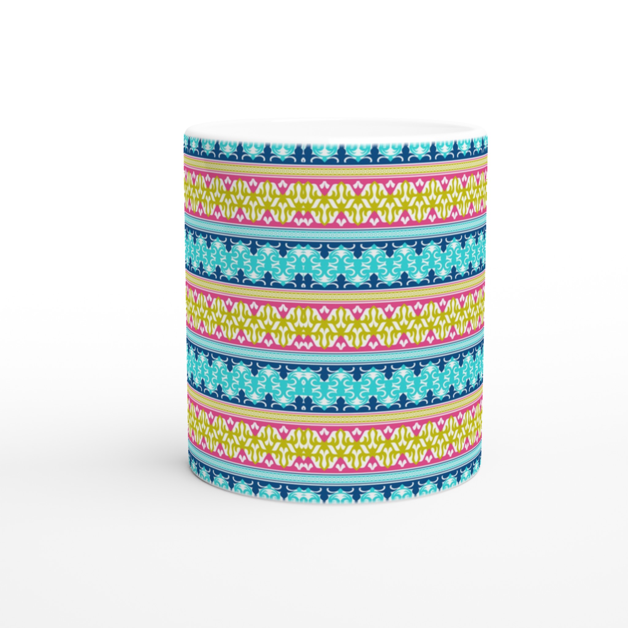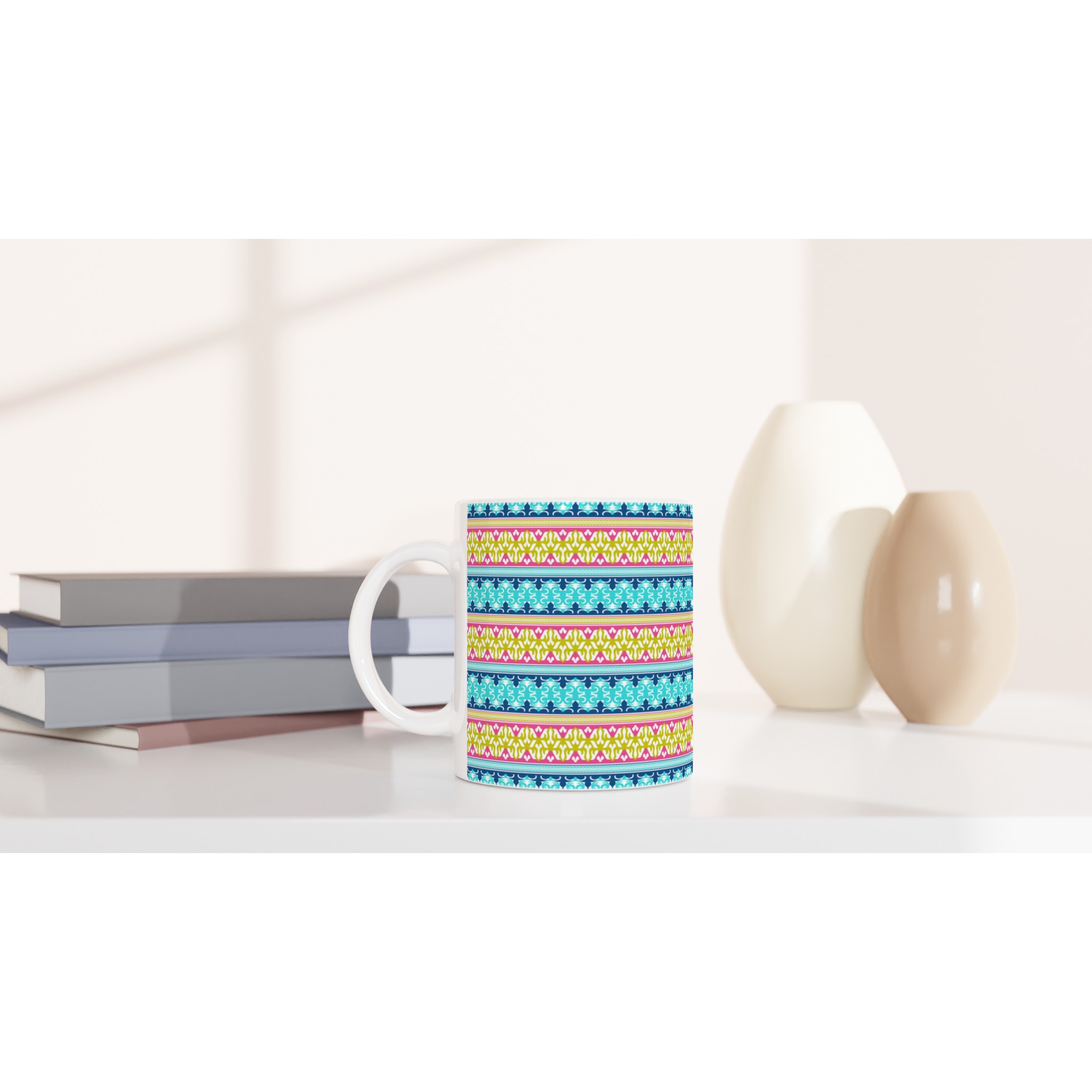 Lyft din vardagsrutin med denna stilrena och vackra keramikmugg, prydd med ett iögonfallande retro-inspirerat mönster i livfulla nyanser av turkos, djupt marinblått, klarlime och poppande rosa. Denna mugg är perfekt för alla dagens stunder – oavsett om det är morgonkaffet, en värmande kopp te eller en härlig varm choklad. Den blanka vita ytan låter det unika, grafiska trycket framträda klart och färgstarkt, vilket gör muggen till en riktig favorit i vardagen som garanterat sprider glädje och stil.