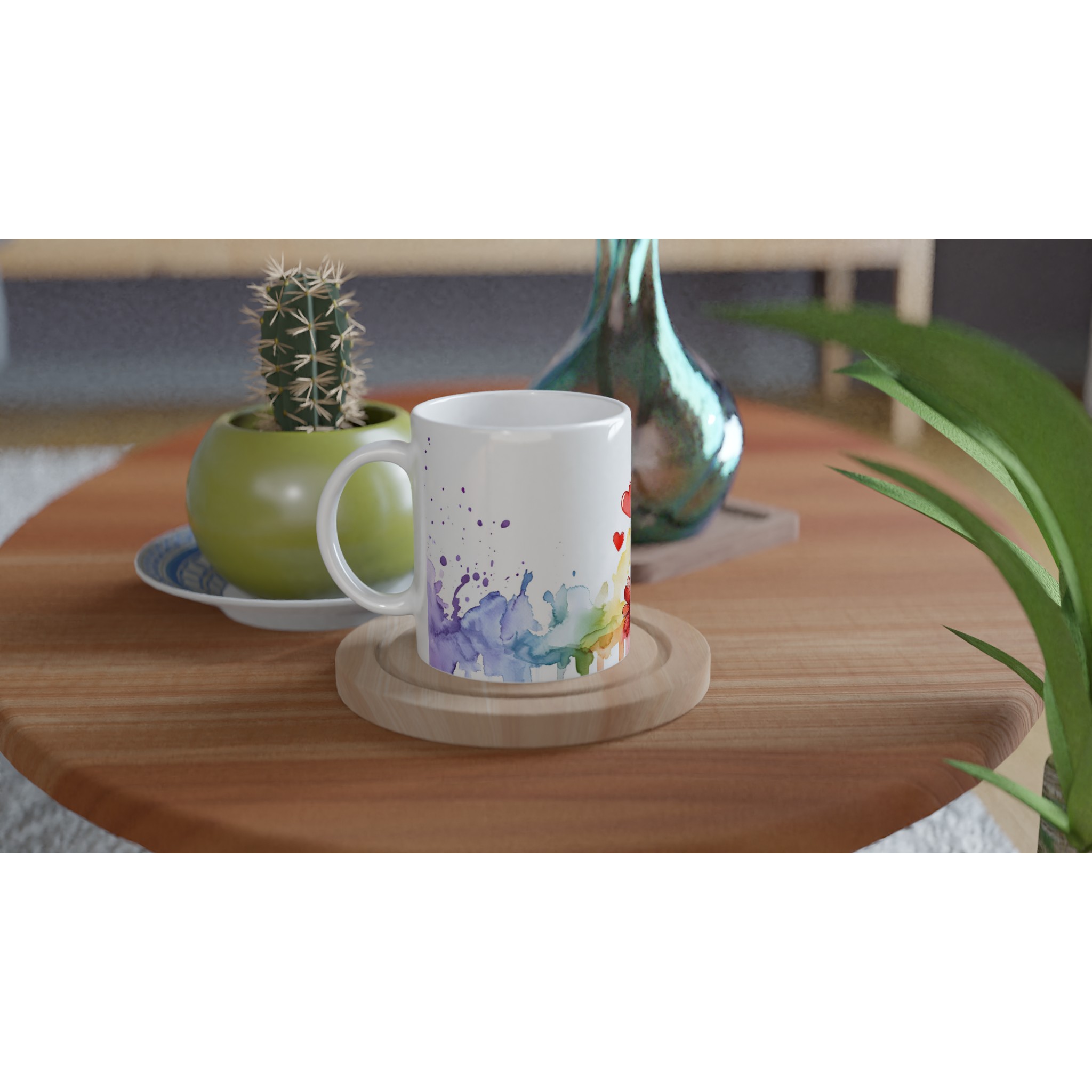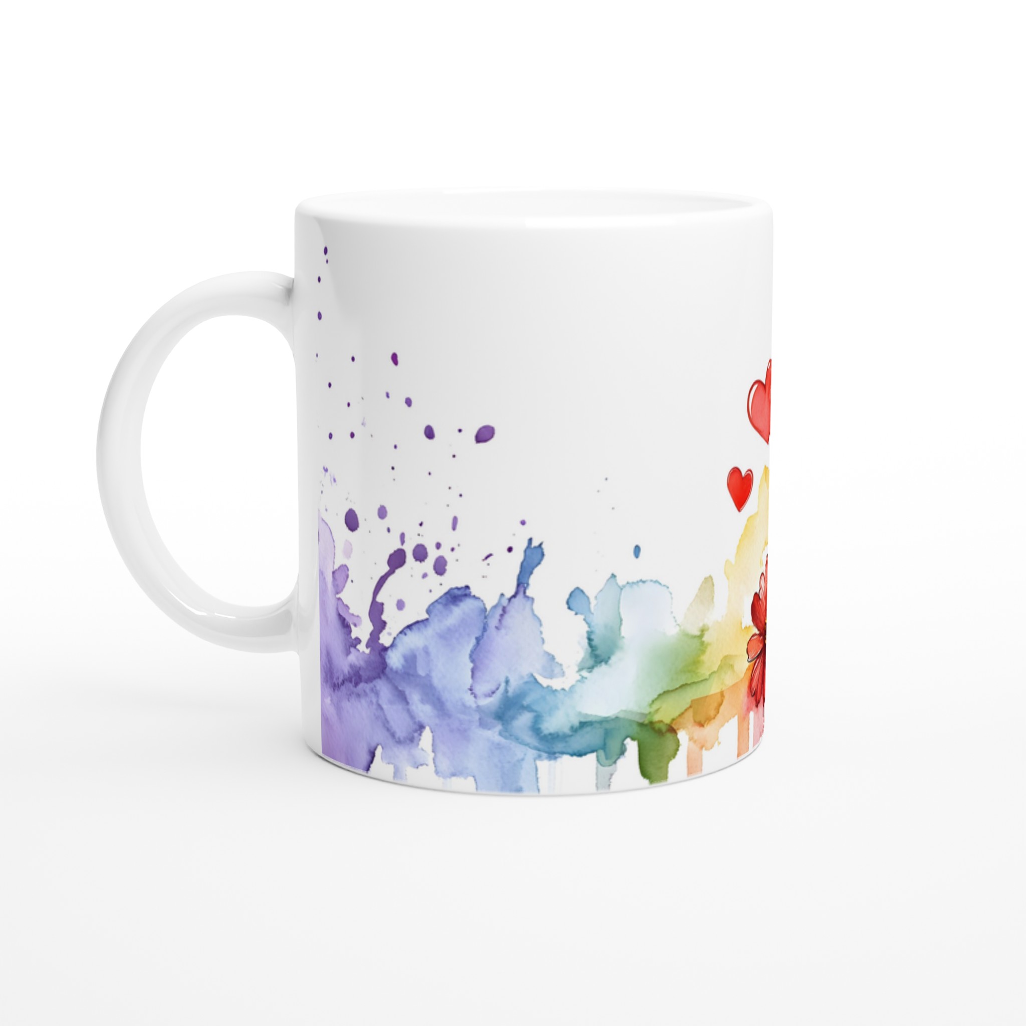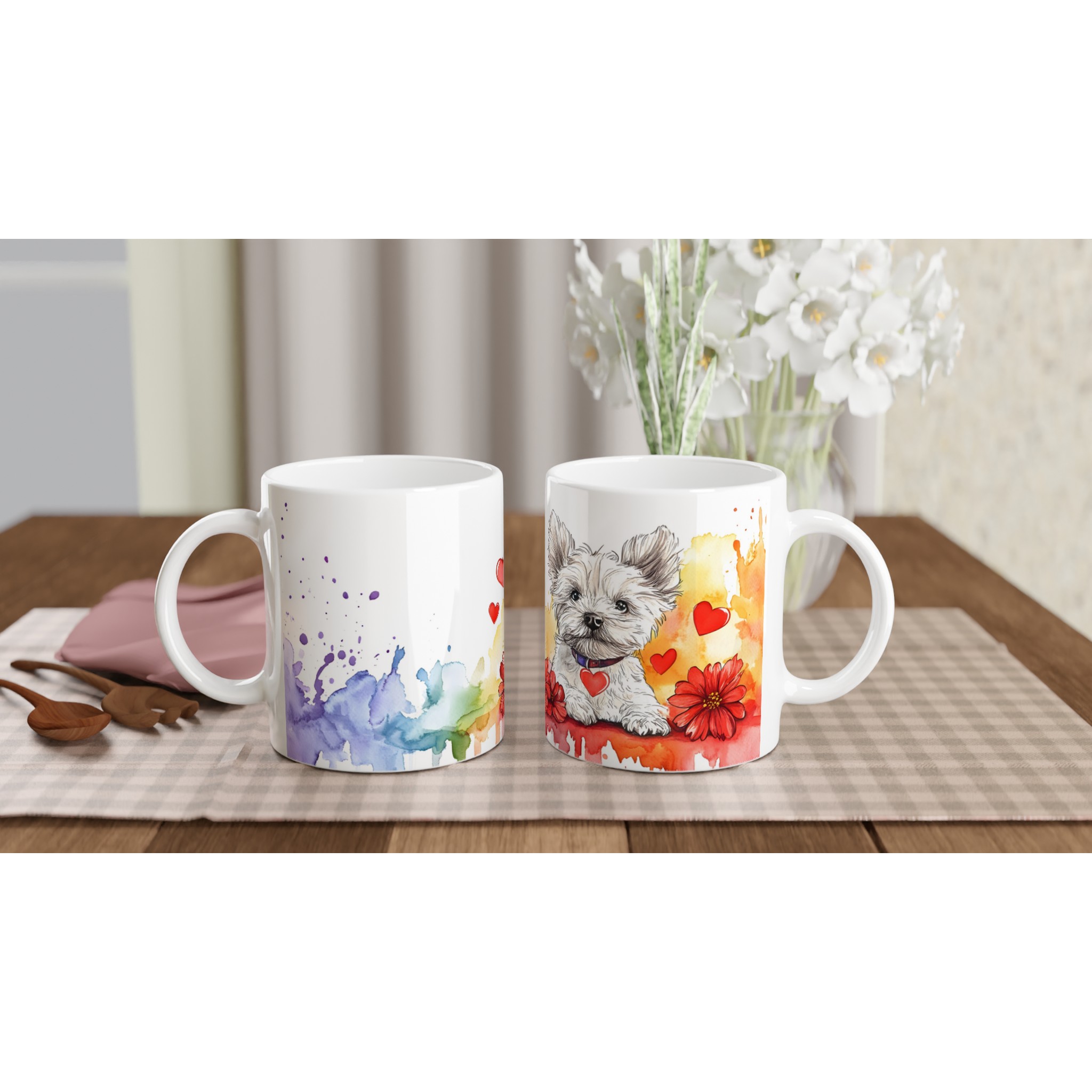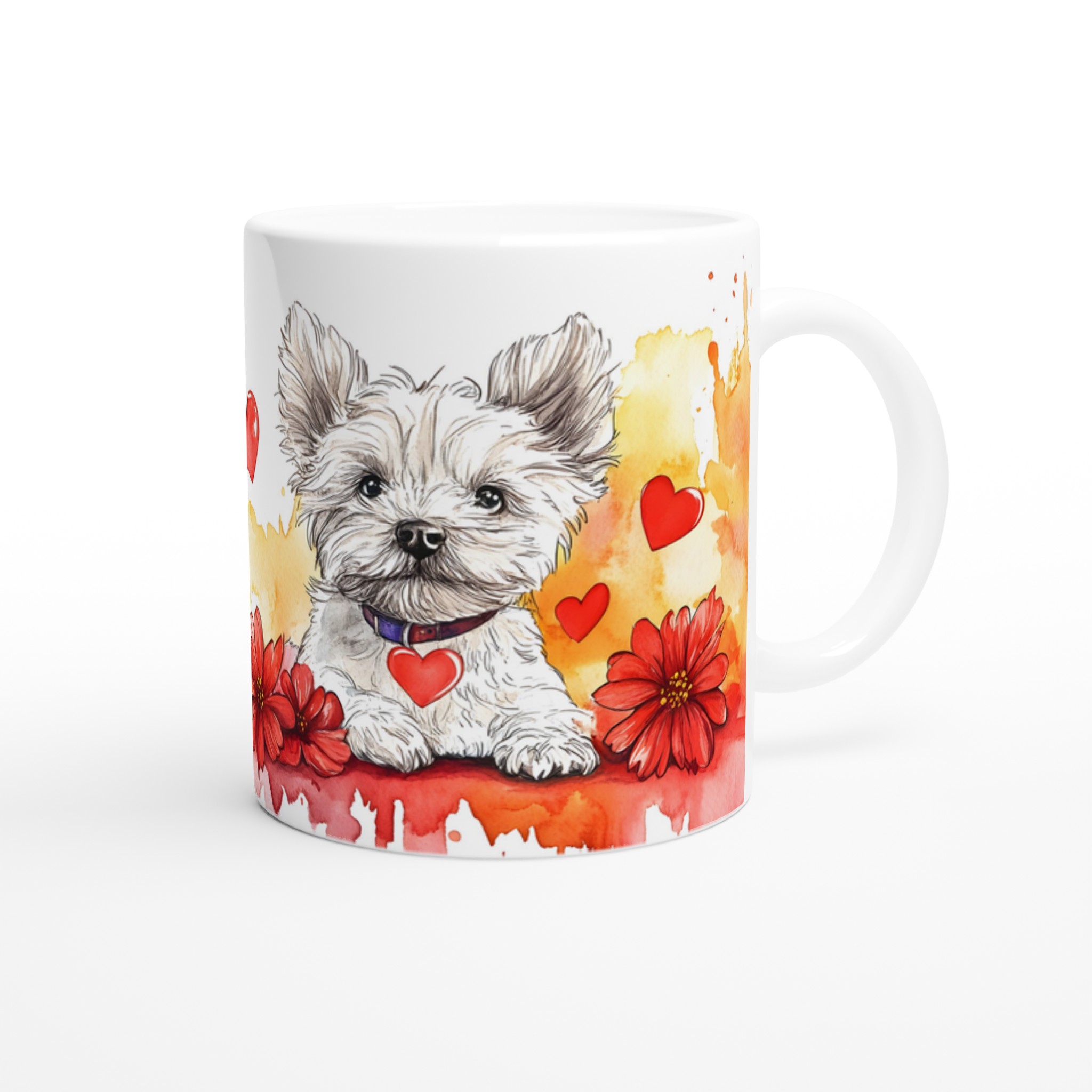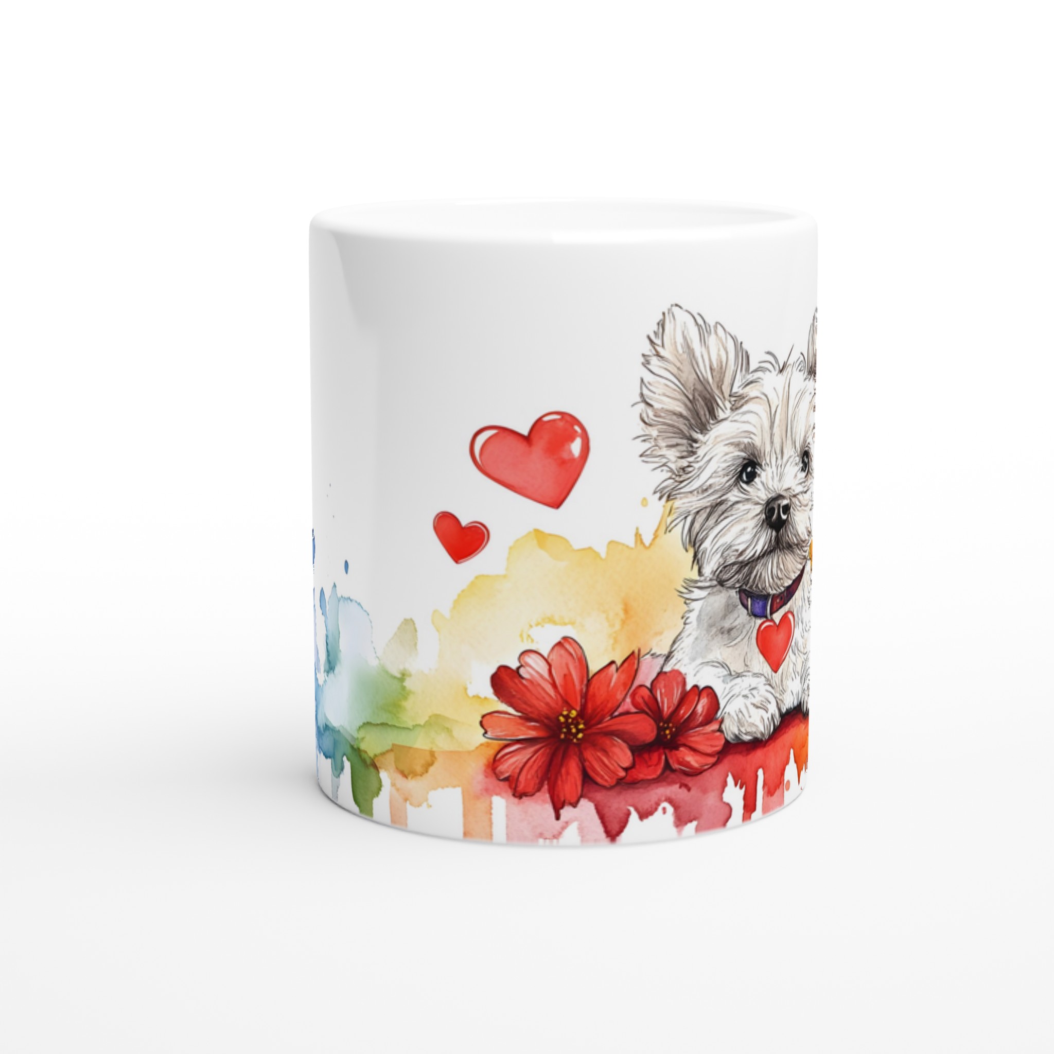 Förgyll varje fika med denna hjärtevärmande keramikmugg! Föreställ dig en söt liten hundvalp, tecknad i en charmig akvarellstil, omgiven av lekfulla röda hjärtan och blommor mot en bakgrund av mjuka färgstänk. Denna mugg är en hyllning till den villkorslösa kärleken till våra fyrbenta vänner och sprider glädje med varje klunk, oavsett om det är morgonkaffe, en värmande kopp te eller en härlig varm choklad.