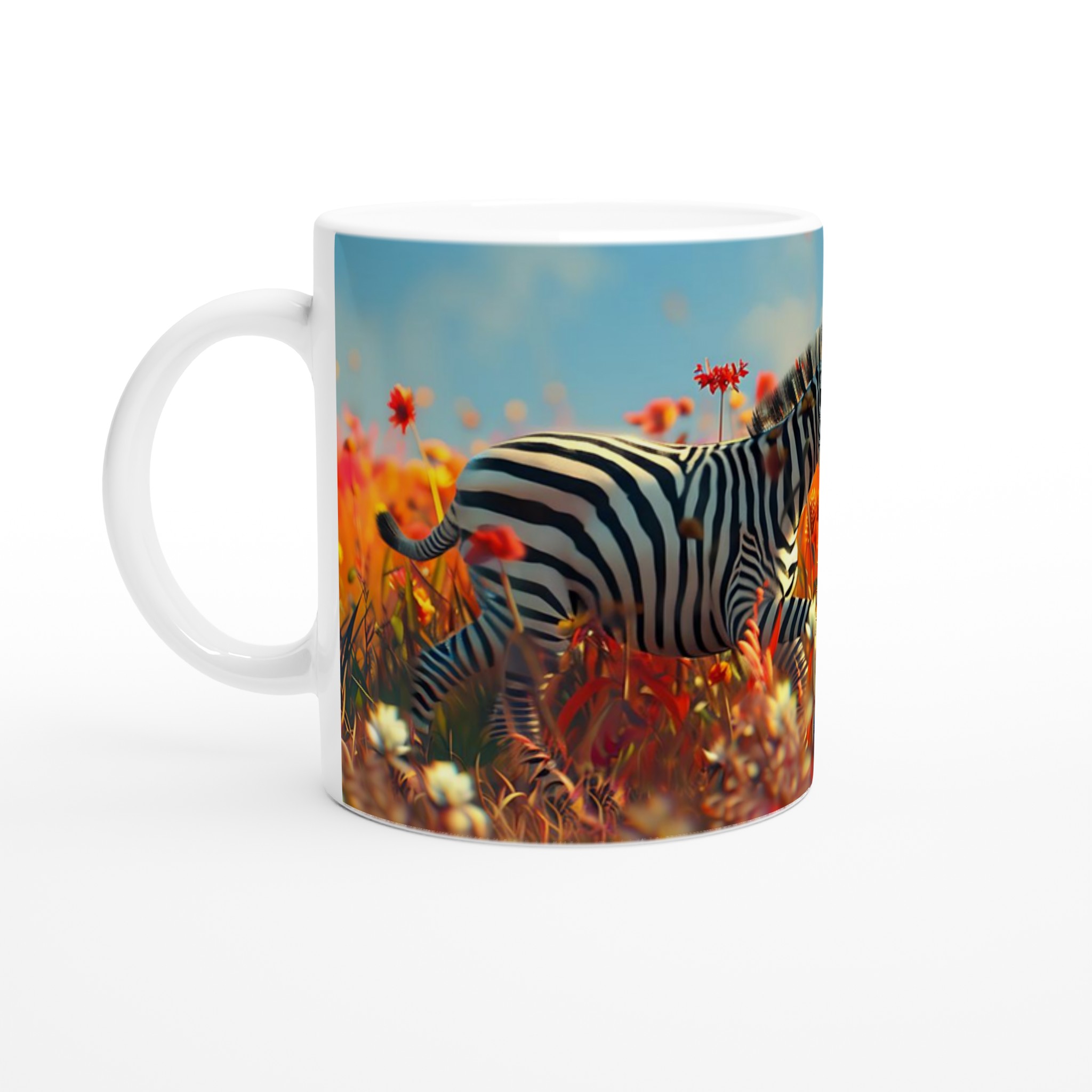 Inspirerad av den livfulla zebra som strövar fritt i ett hav av solkyssta blommor, fångar denna mugg en känsla av glädje och naturens skönhet. Den blanka vita ytan ger ett skarpt och levande tryck som verkligen sticker ut, oavsett om det är en personlig design, ett roligt citat eller en present till någon du tycker om.