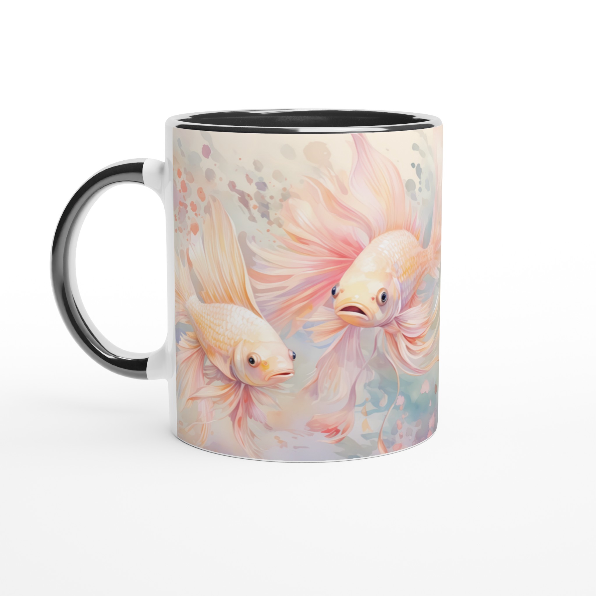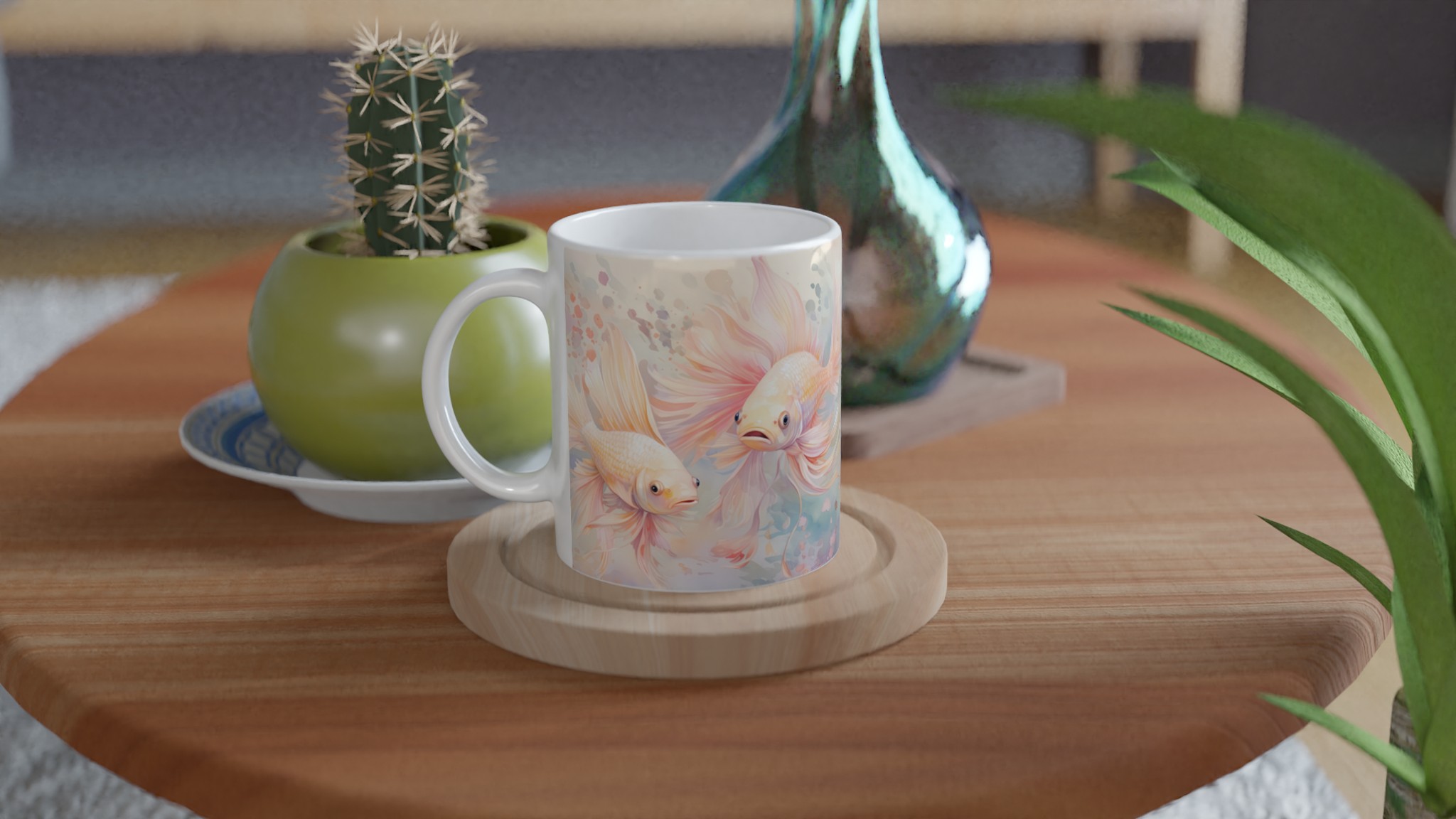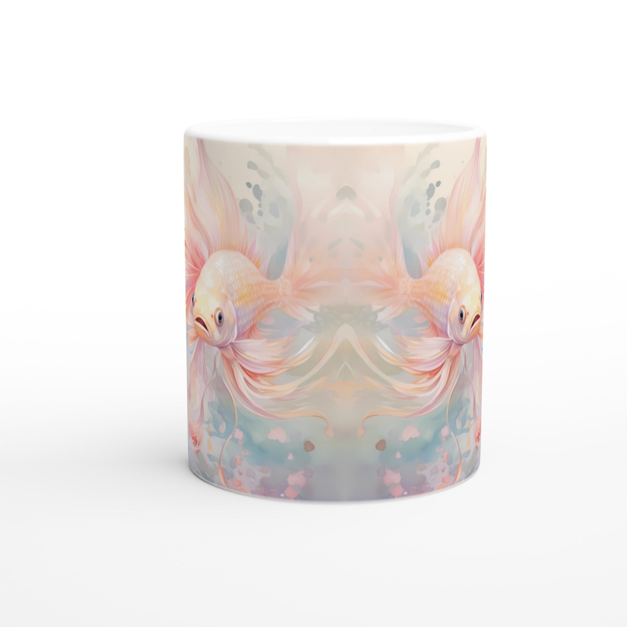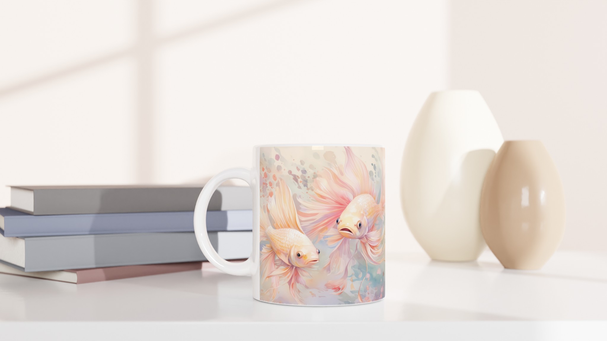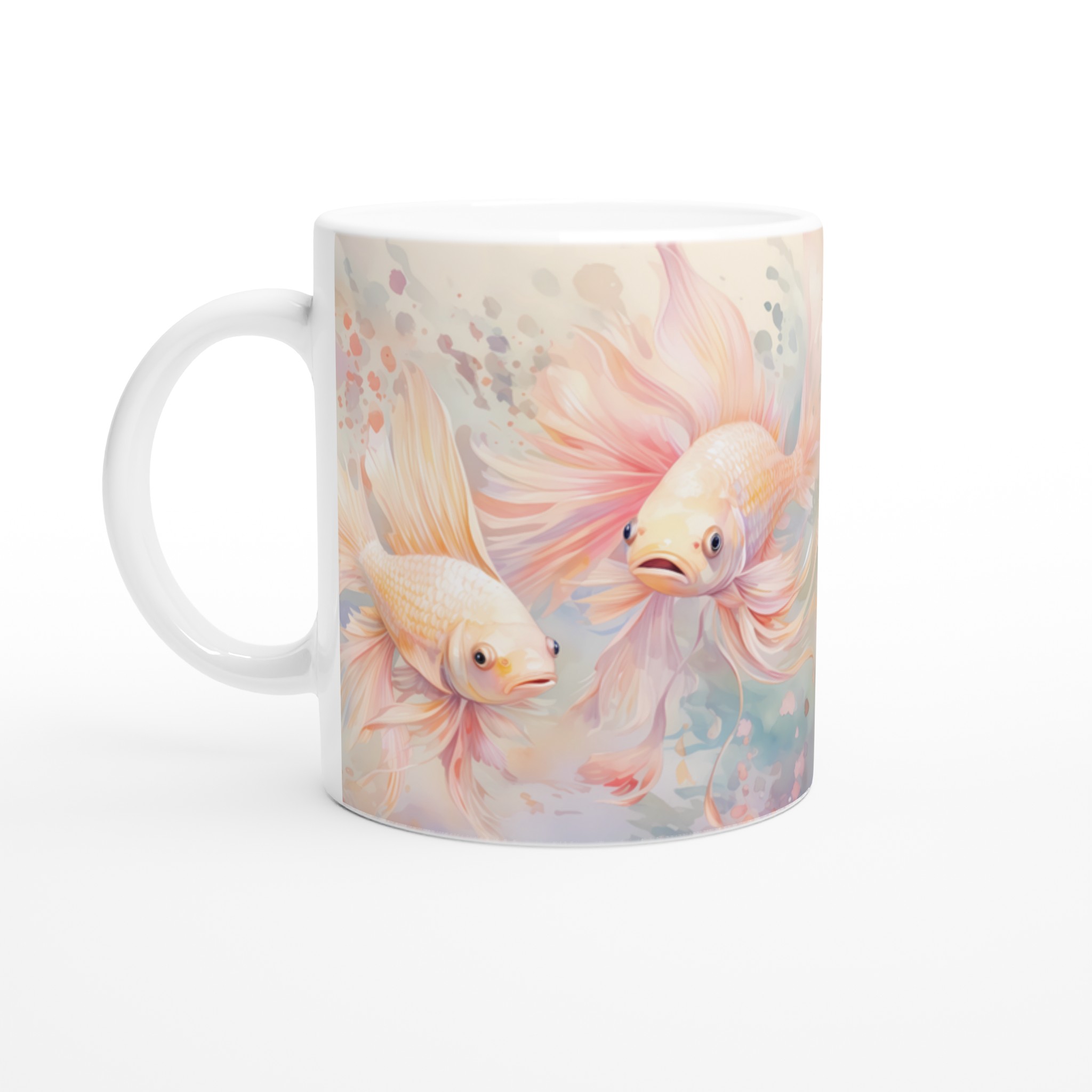 Föreställ dig en stilla stund, omsluten av lugn och skönhet. Denna keramiska mugg fångar den eteriska skönheten hos en guldfisk i en akvarelldröm, med mjuka persiko- och pastelltoner som flyter fram över den blanka ytan. Det är mer än bara en mugg; det är en daglig påminnelse om lugn och inspiration, perfekt för din morgonkaffe, kvällens varma choklad eller när du bara vill njuta av en kopp te.