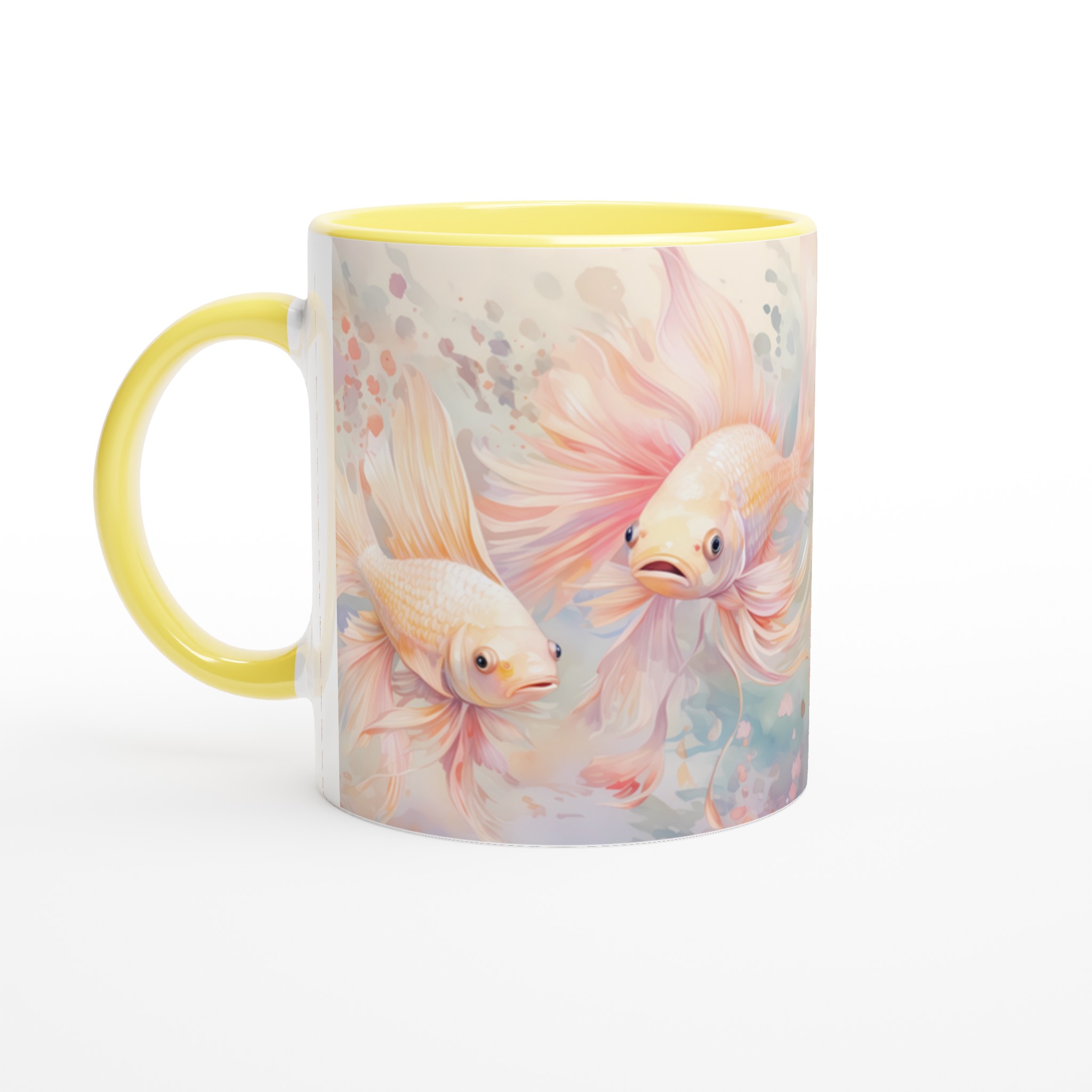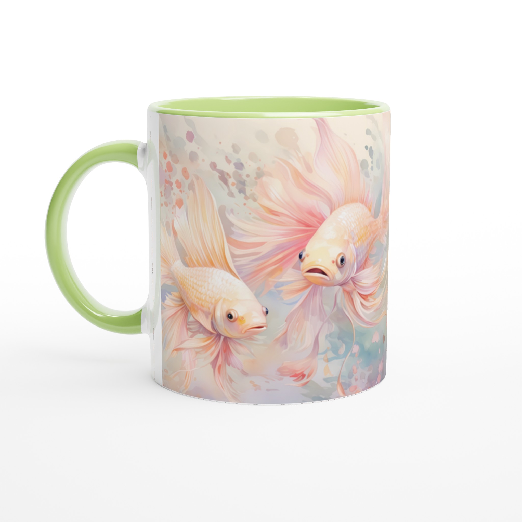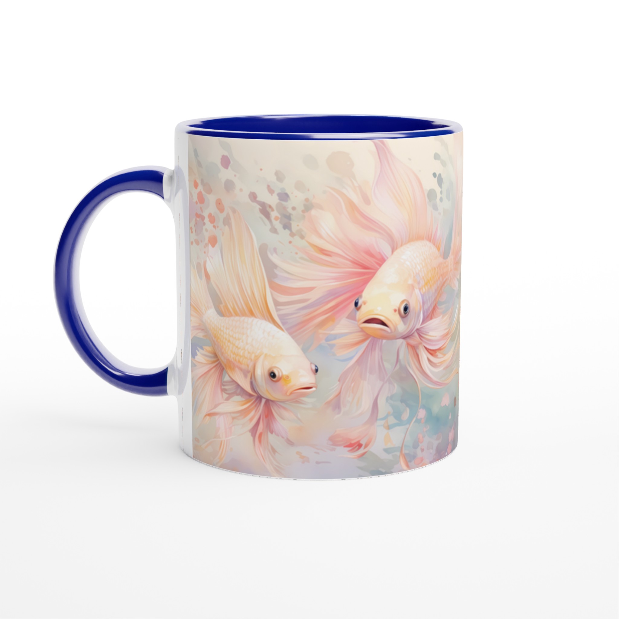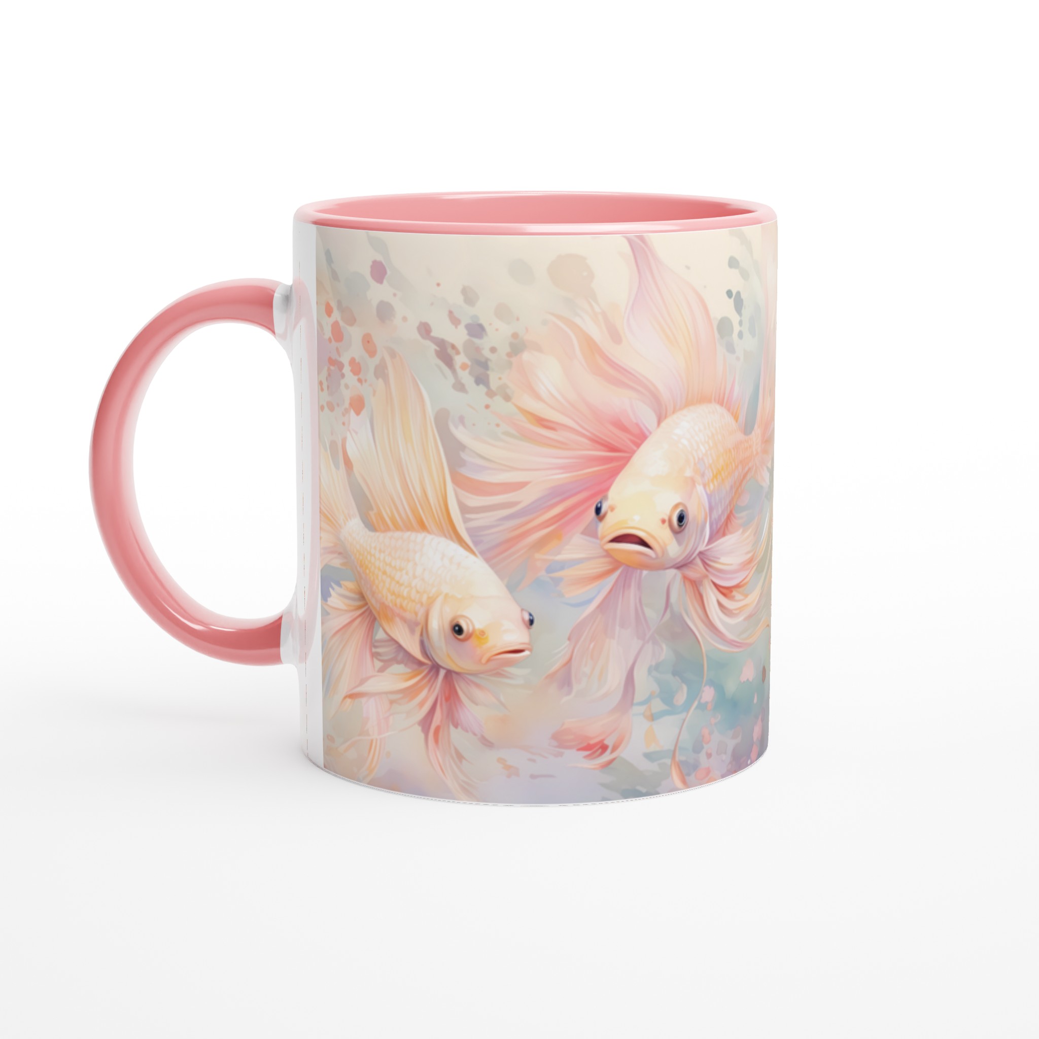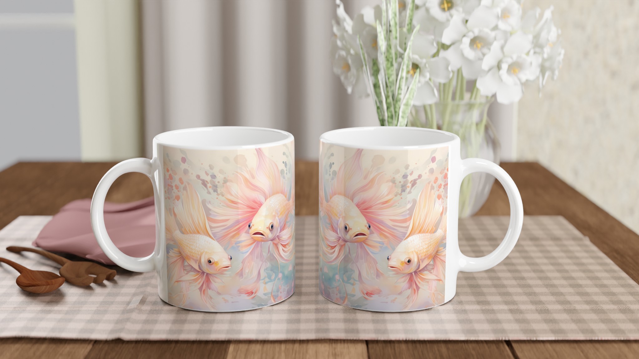 Föreställ dig en stilla stund, omsluten av lugn och skönhet. Denna keramiska mugg fångar den eteriska skönheten hos en guldfisk i en akvarelldröm, med mjuka persiko- och pastelltoner som flyter fram över den blanka ytan. Det är mer än bara en mugg; det är en daglig påminnelse om lugn och inspiration, perfekt för din morgonkaffe, kvällens varma choklad eller när du bara vill njuta av en kopp te.