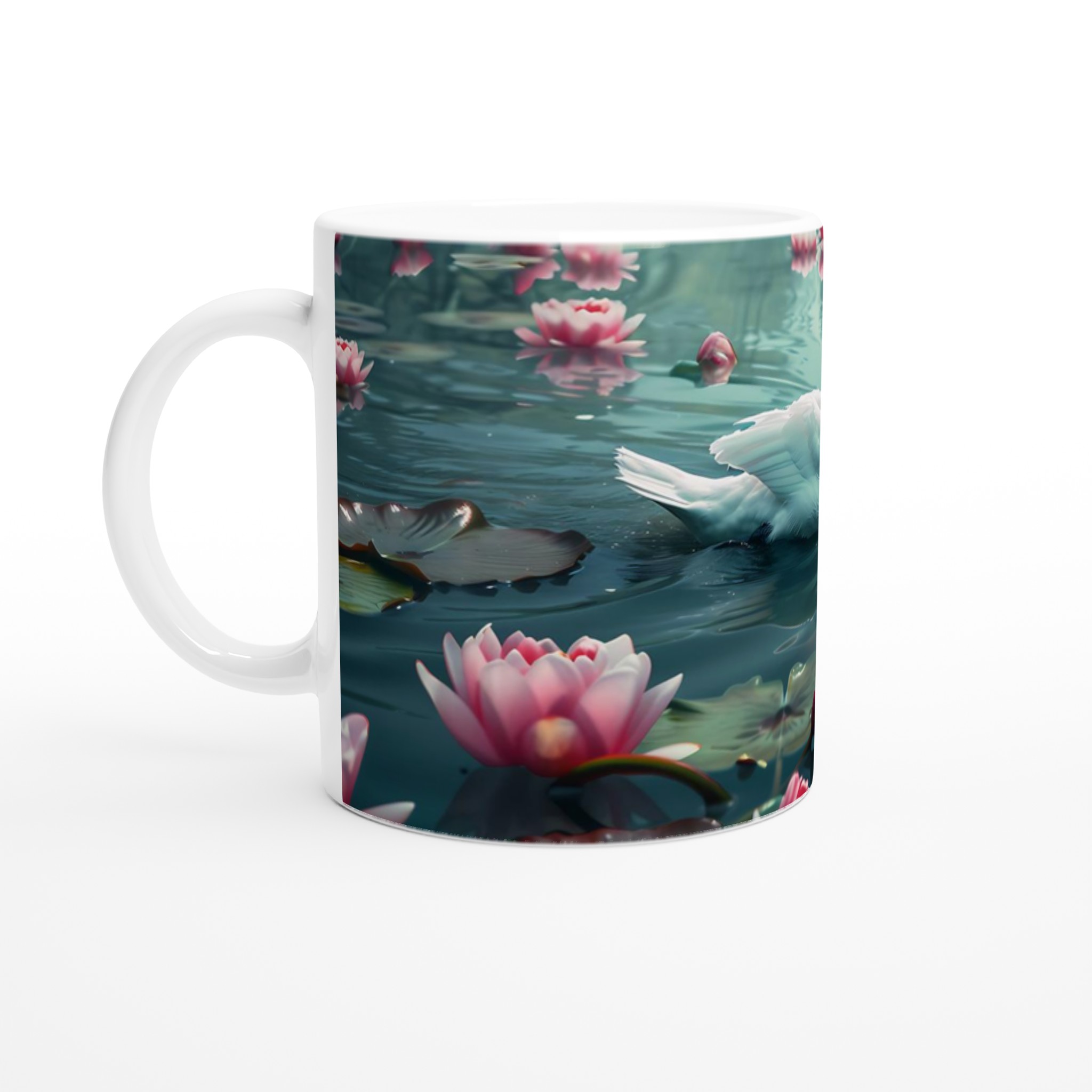 Inspirerad av den fridfulla harmonin hos en svan som glider bland blommande lotusar, ger denna mugg en känsla av lugn till din dag. Den blanka vita ytan ger ett skarpt och levande tryck som verkligen sticker ut, oavsett om det är en personlig design, ett roligt citat eller en present till någon du tycker om.